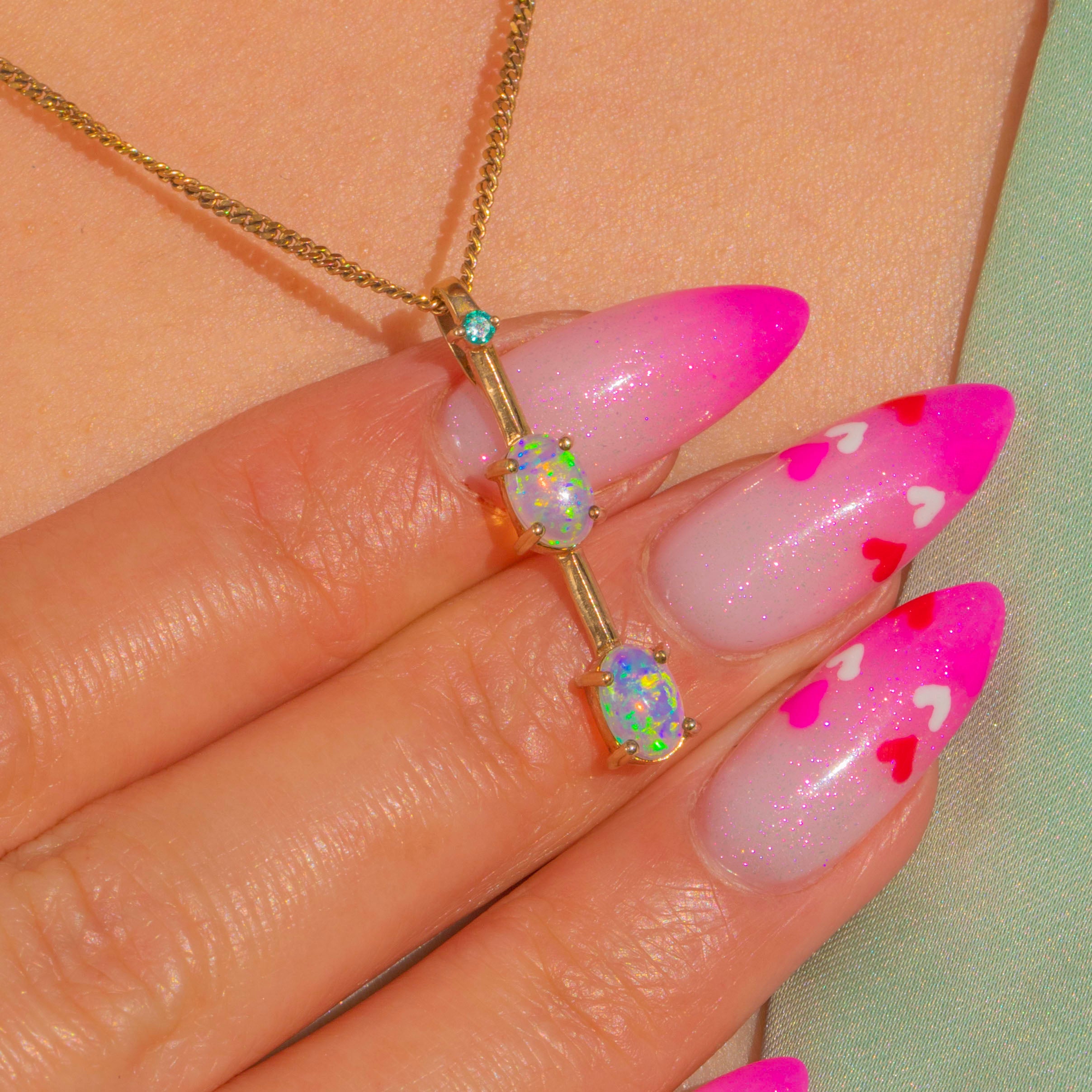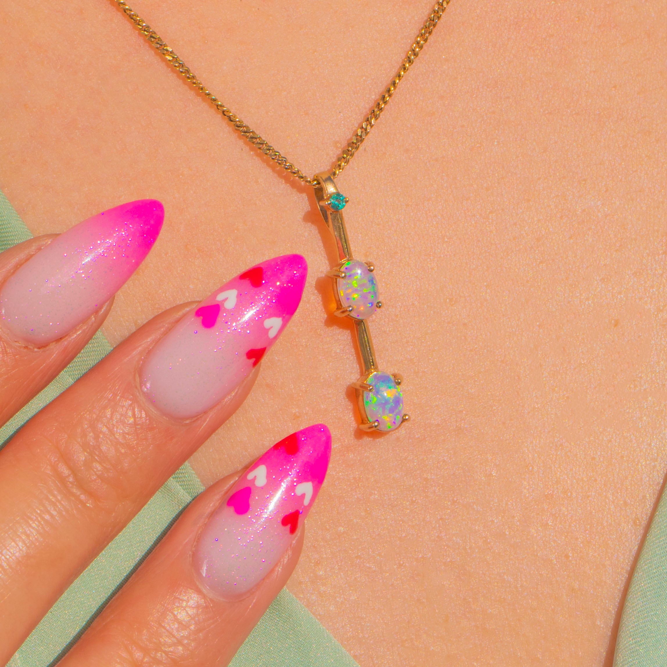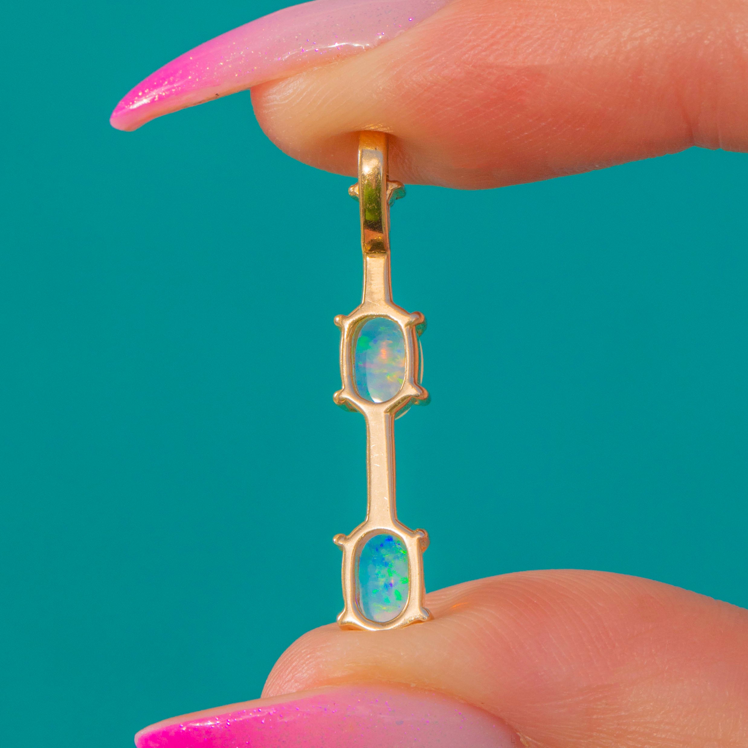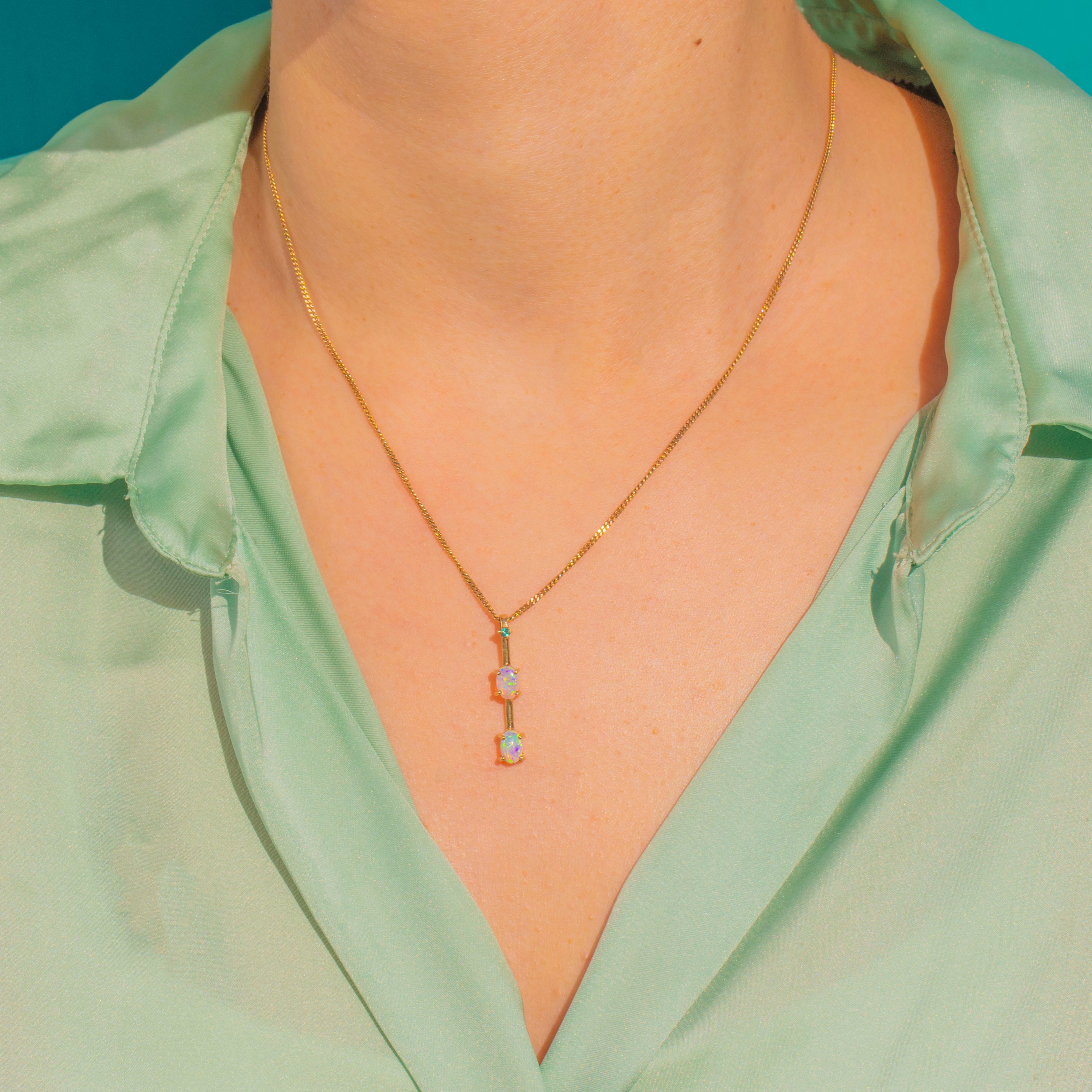 A refined Victorian bar pendant that lets its gemstones take centre stage. Two luminous Opal cabochons glow with playful flashes of blue, green and orange, crowned by a petite Emerald for a fresh pop of colour. The linear silhouette is sleek and minimal, crafted in warm 9ct Gold for an effortlessly elegant finish.