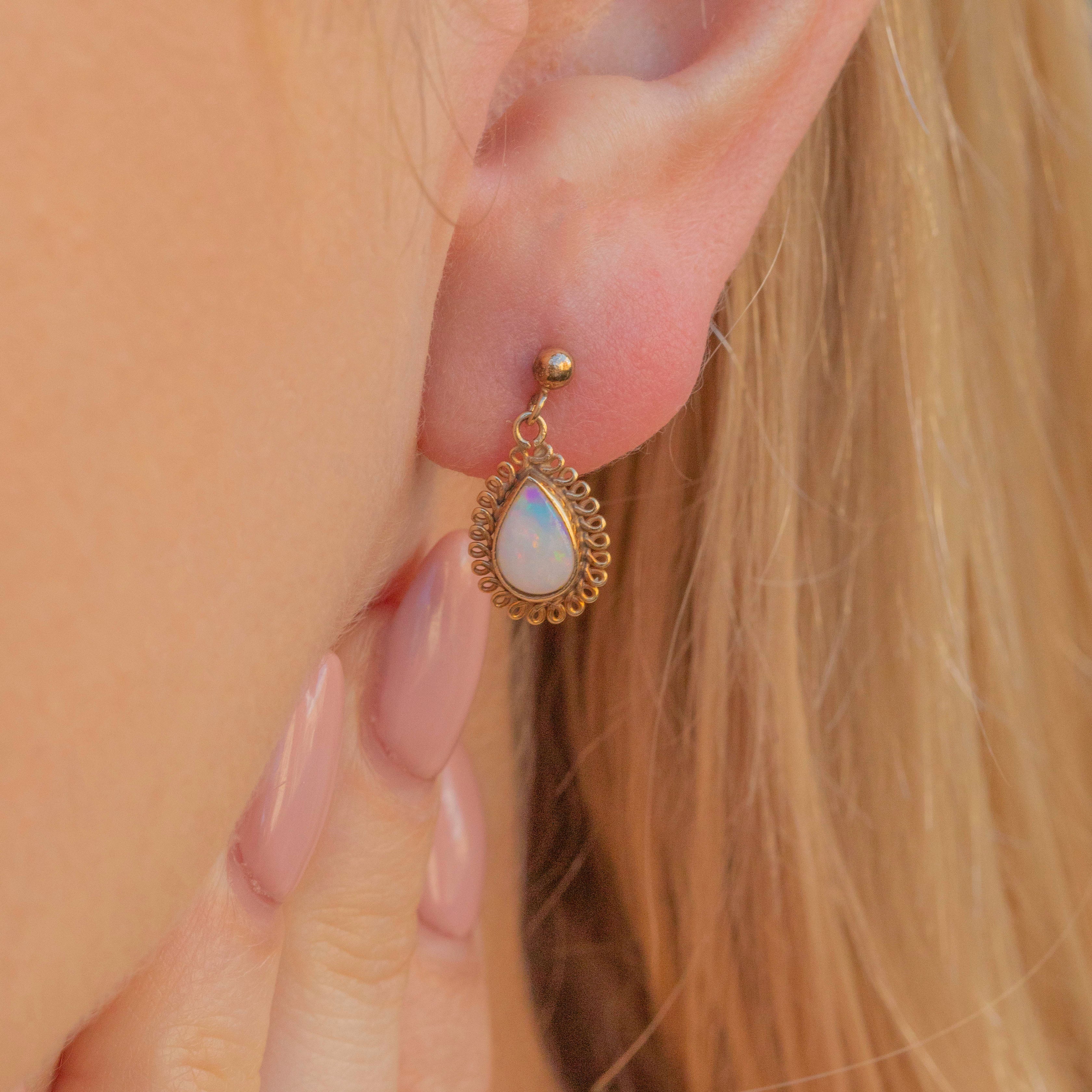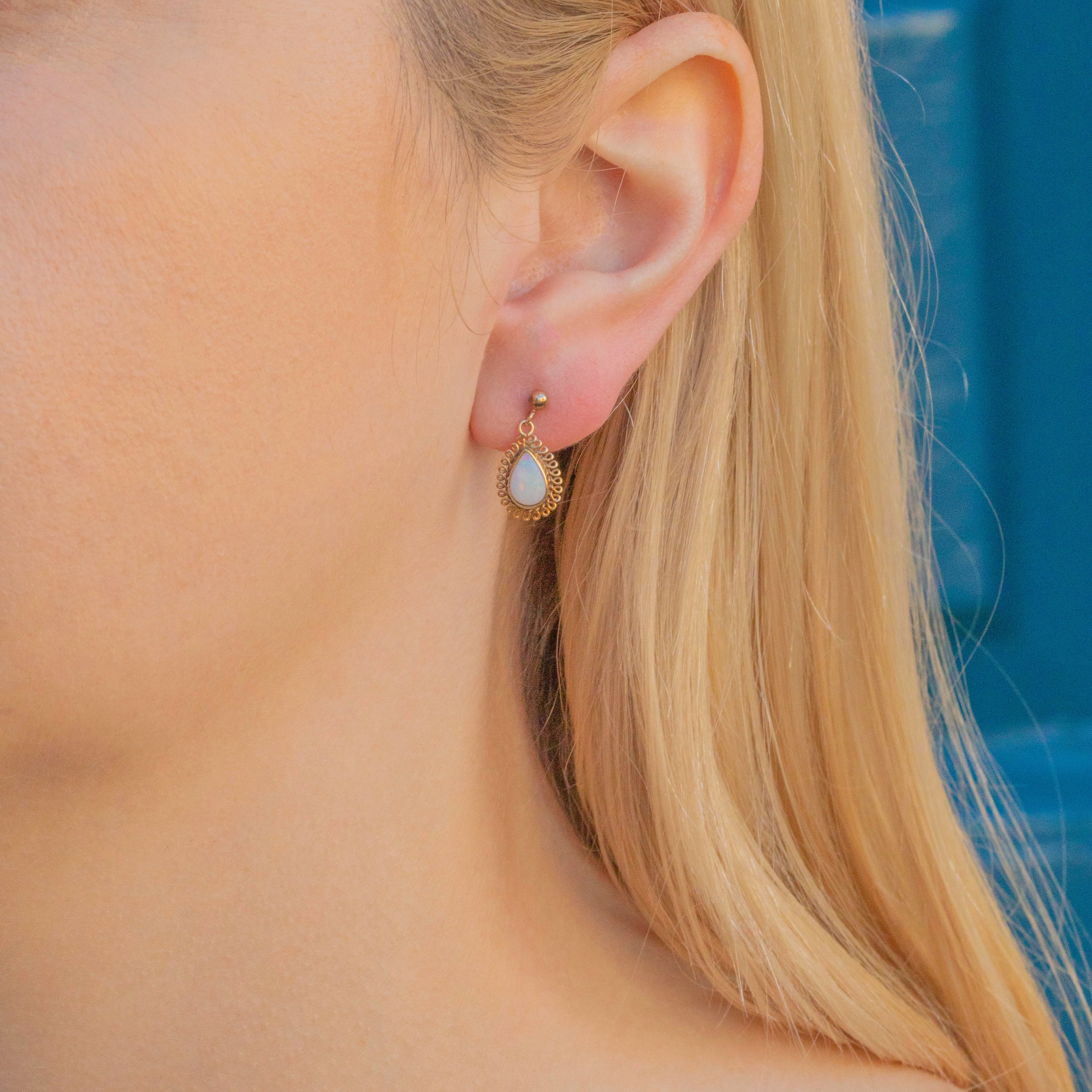 VERY GOOD-EXCELLENT. These 9ct Opal pear drop earrings are in superb condition. Her Opals are radiant, capturing the light beautifully, and sit securely in their 9ct Gold settings. There are some minor signs of wear to the Vintage 9ct Gold commensurate with age, however, this does not detract from their beauty and is not noticeable during wear. These Vintage Opal earrings have a gorgeous swing and sit comfortably in your lobes, allowing for confident wear.