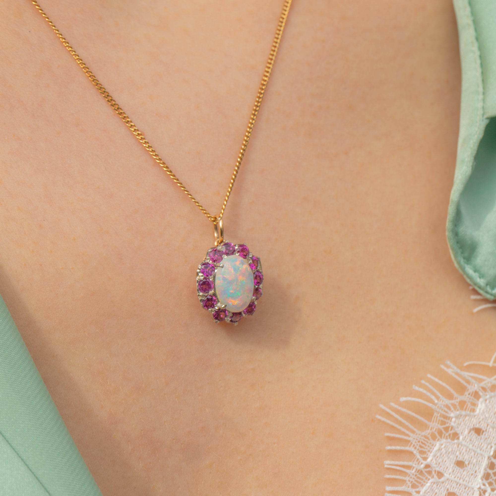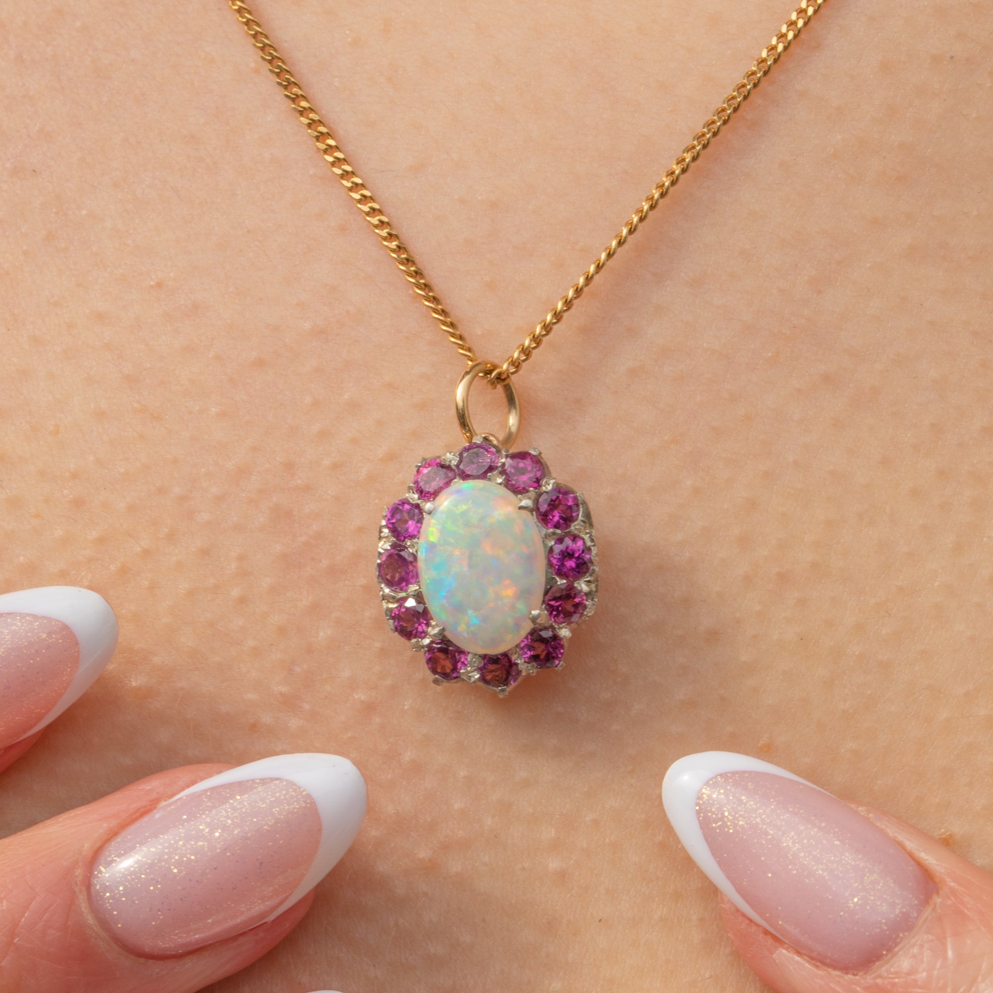 This gorgeous 9ct Gold Opal Rhodolite Garnet cluster charm will bring a vibrant pop of colour to your décolletage! Exquisitely crafted, this charming 1920's Art Deco pendant displays a kaleidoscopic 0.78ct Opal cabochon haloed by bright fuschia Rhodolite Garnets.