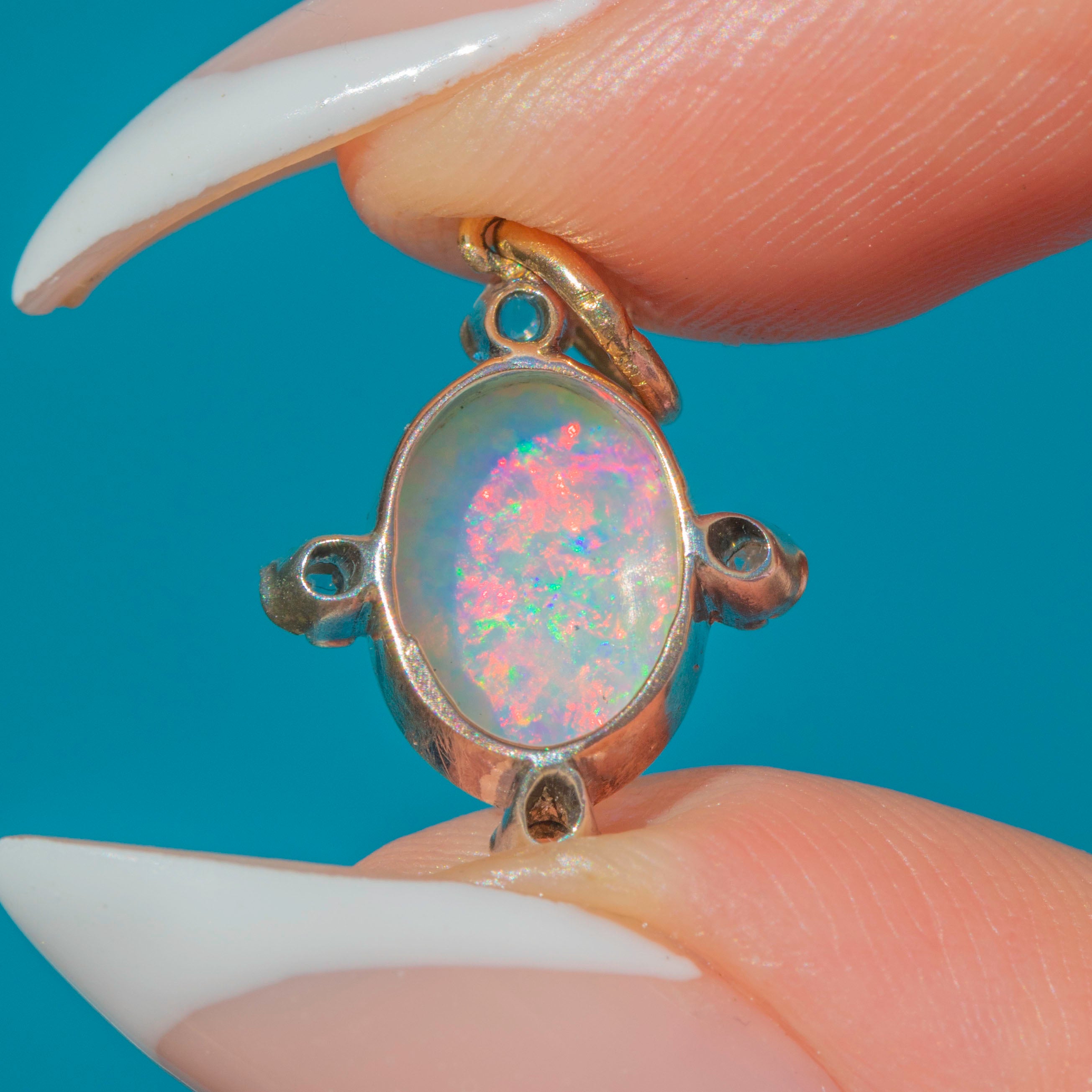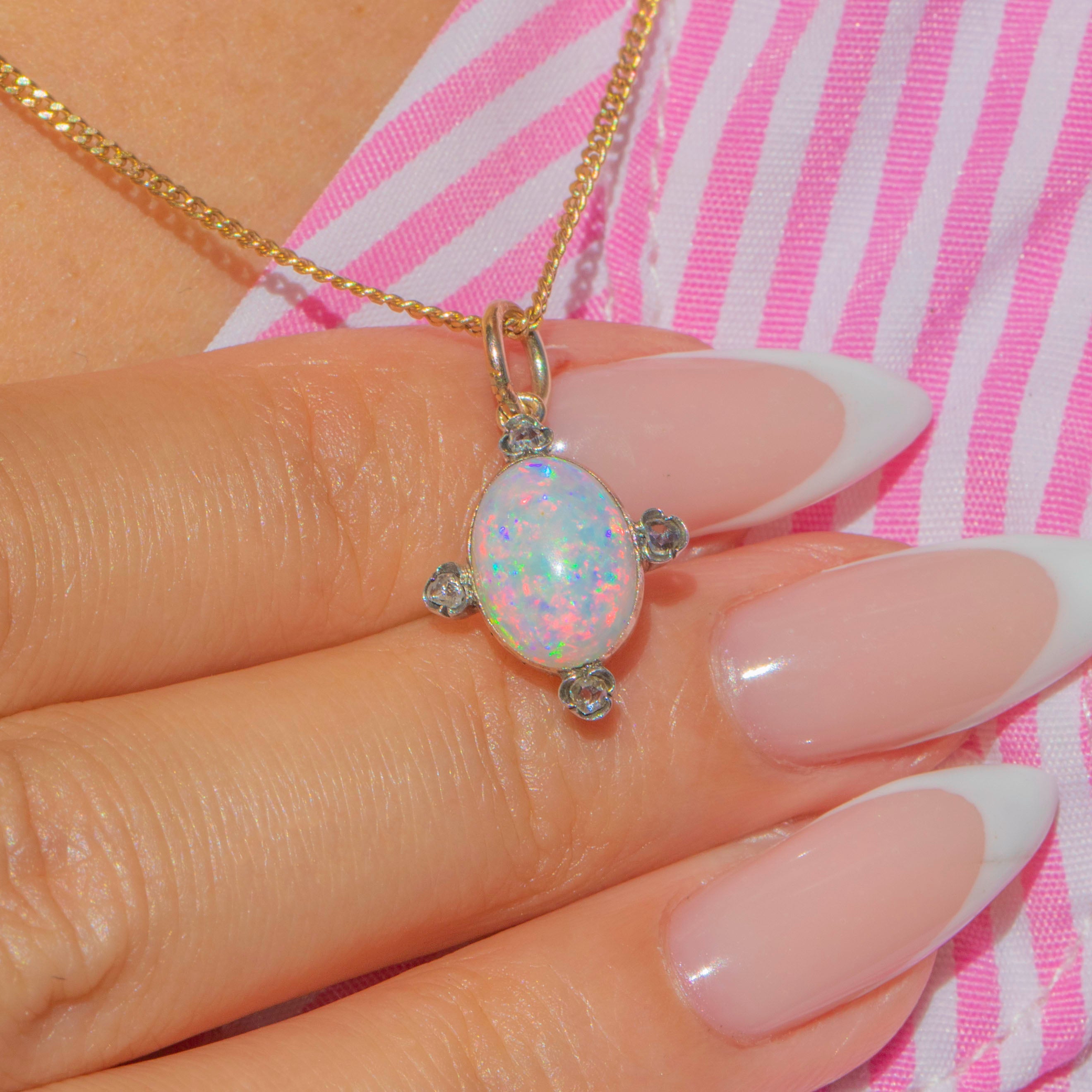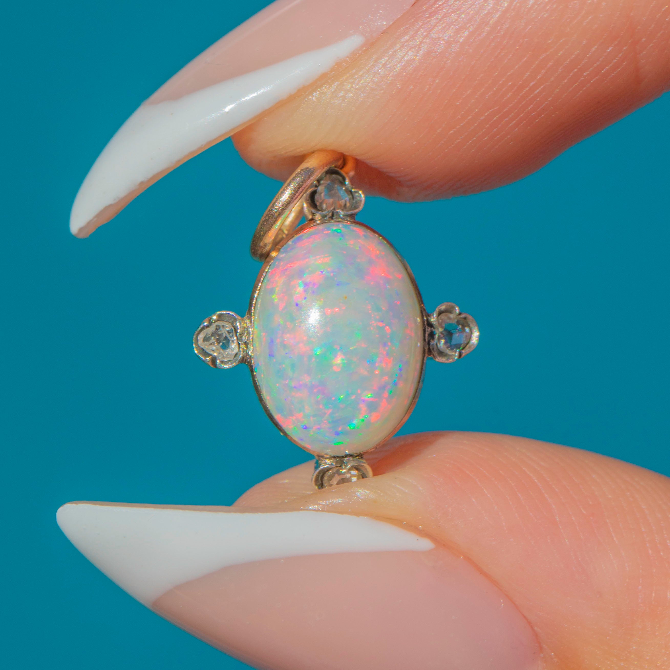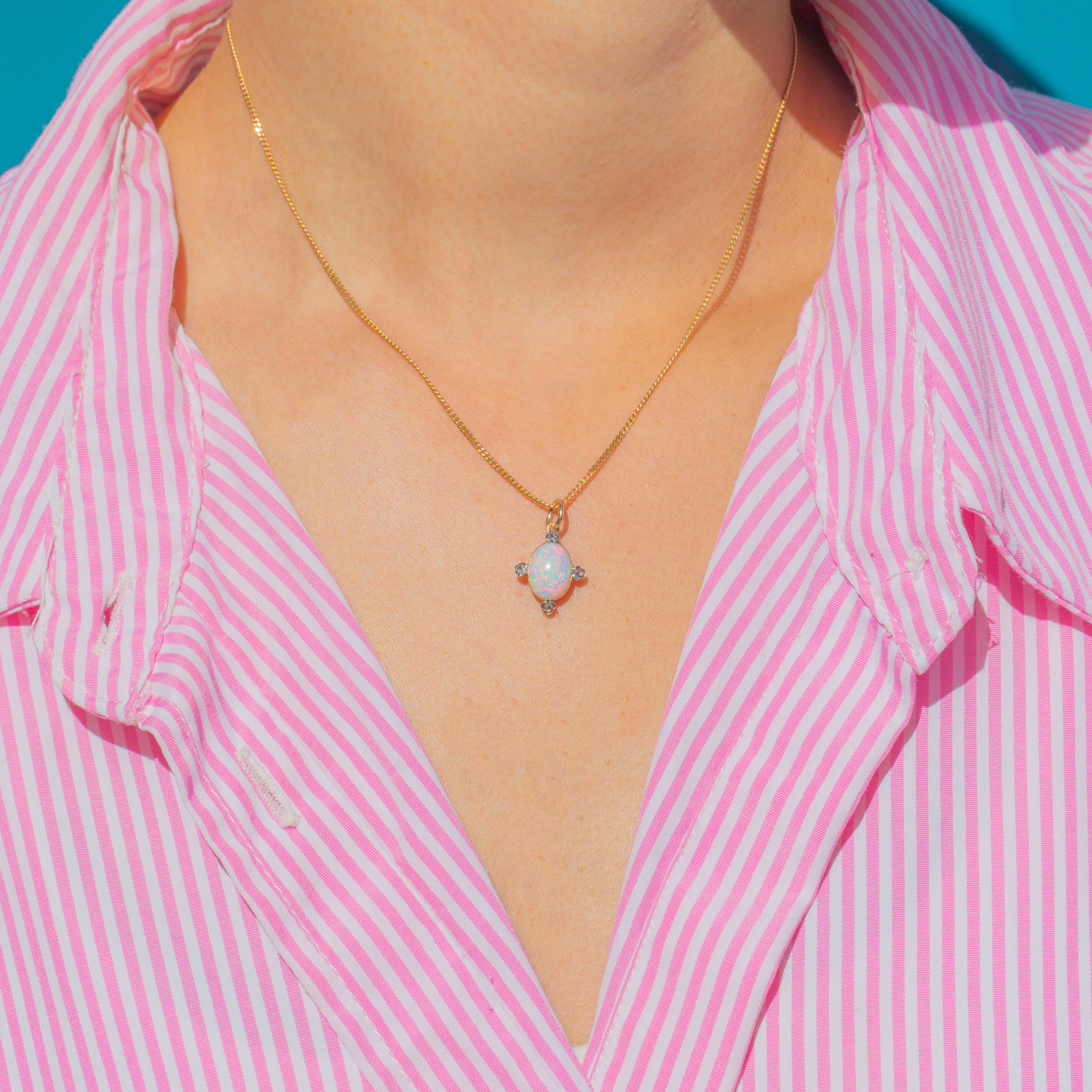 This Victorian charm is set with a luminous Opal, ablaze with vibrant flashes of green, blue, orange and pink. The central Opal is framed by three delicate Rose-Cut Diamonds in Silver settings, their subtle sparkle providing the perfect contrast to the gemstone’s play of colour.