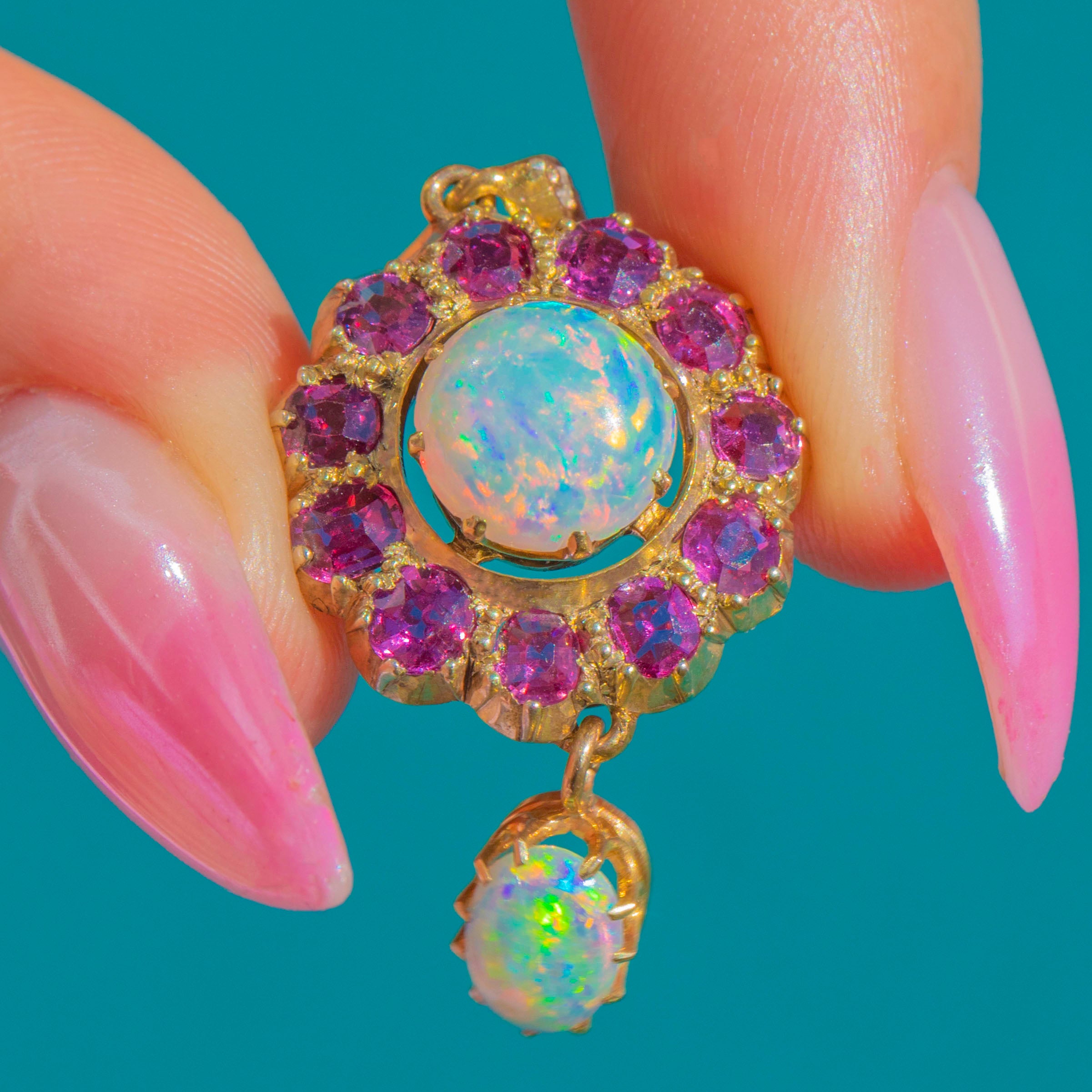 Glimmering with romantic colour and movement, this Victorian 9ct Gold cluster drop pendant centres on a luminous round Opal cabochon, haloed by a vivid rosette of Rubies. A petite oval Opal is articulated beneath, catching the light with every step and echoing the ethereal play-of-colour above. Tiny Diamonds sparkle at the bail, adding a delicate flicker of brilliance to the warm Gold.
