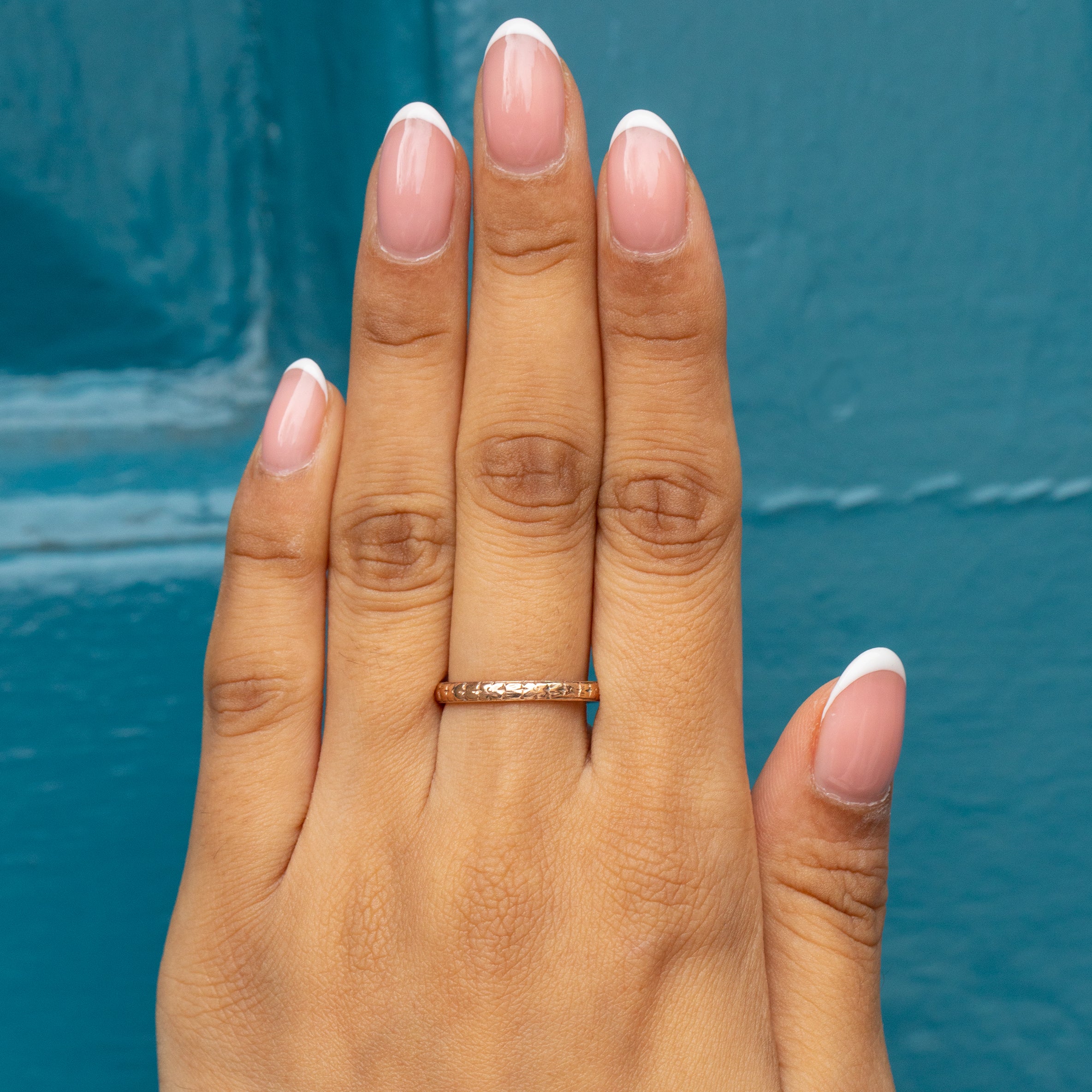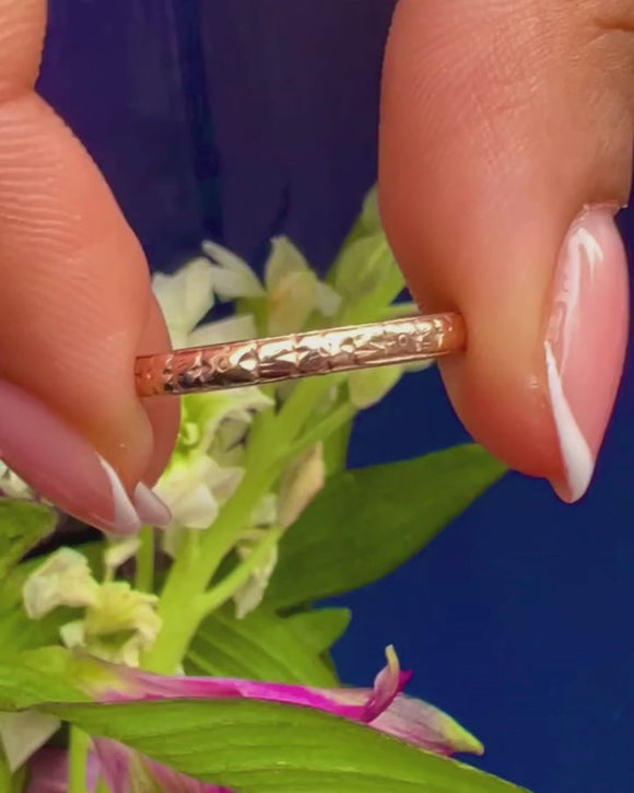 Orange blossom motifs have been skillfully etched across the faceted form of this vintage Gold band, symbolising innocence and fertility, a popular design for wedding bands that link back to the Victorian era!