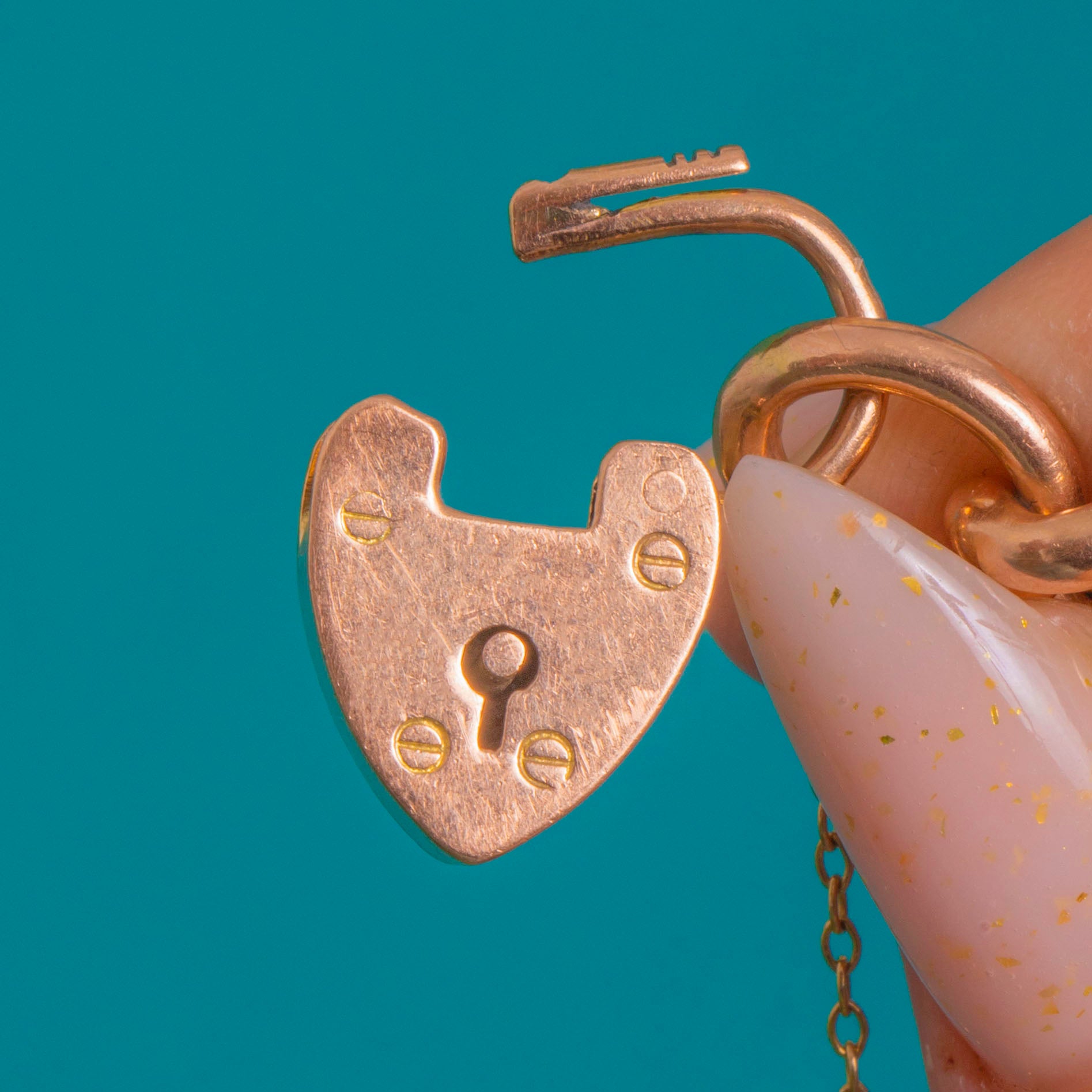 The padlock is detailed with a keyhole and tiny faux screw-heads, nodding to Victorian “sweetheart” styles while keeping a clean mid-century finish. Beautiful worn solo or layered, it’s an elegant everyday treasure in solid 9ct Gold.