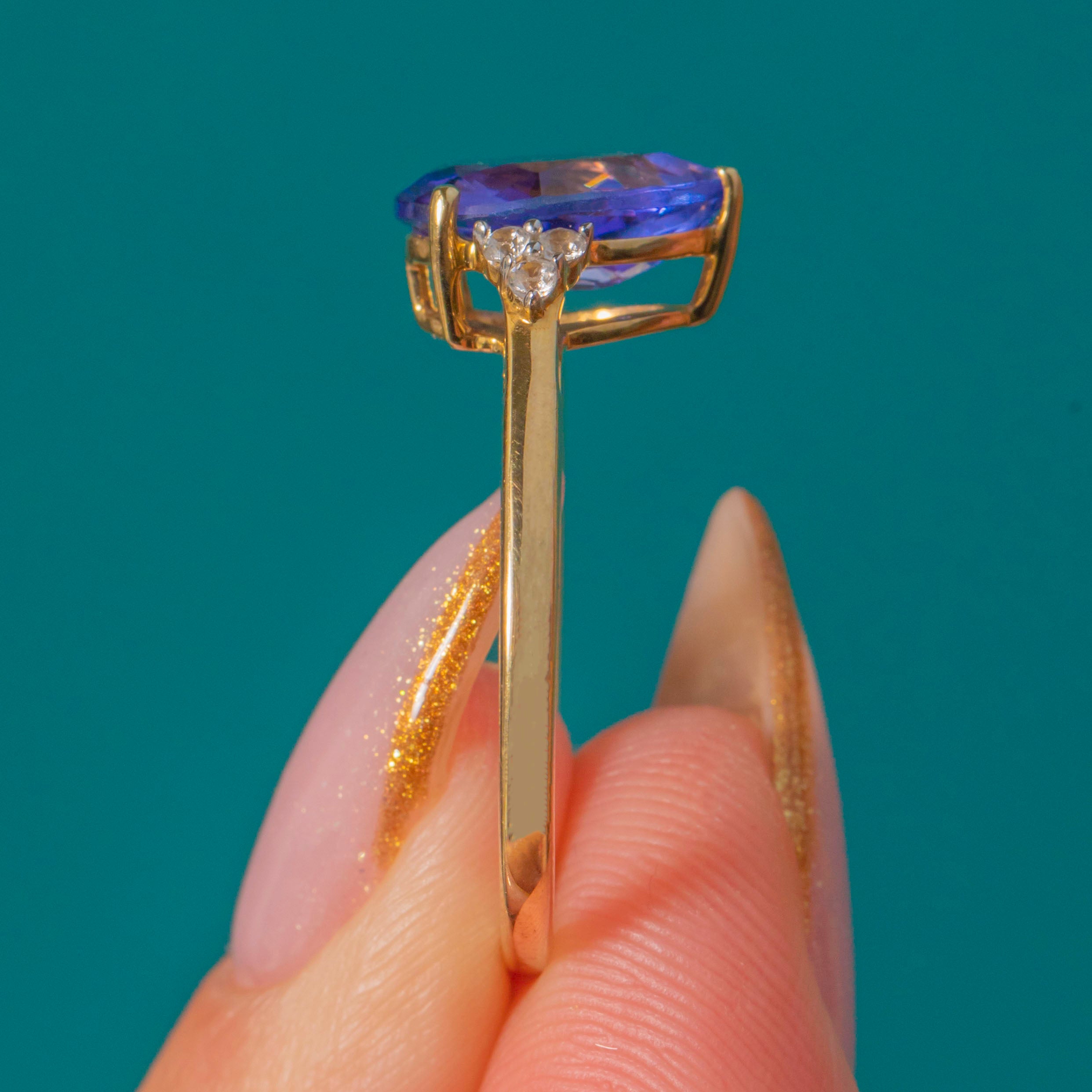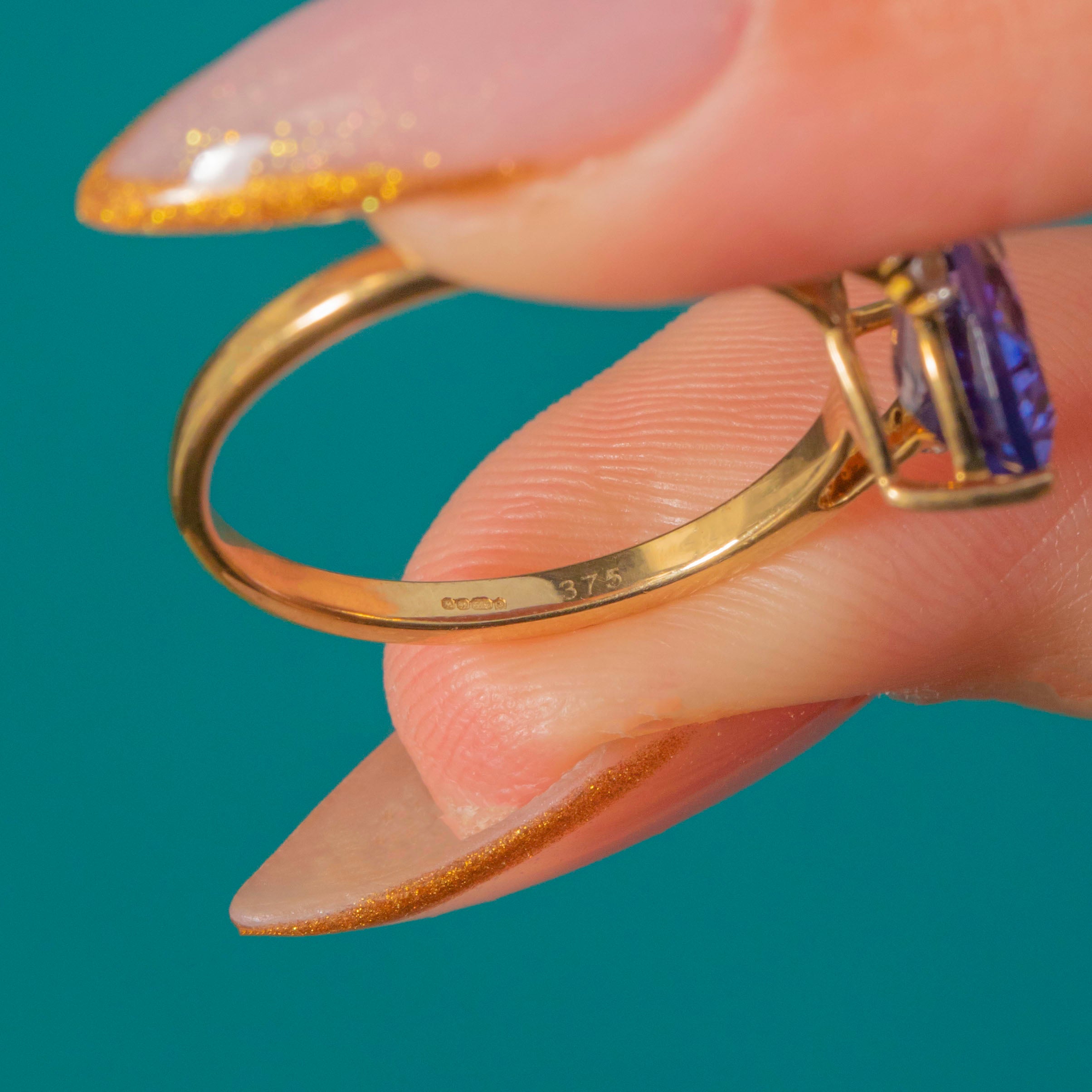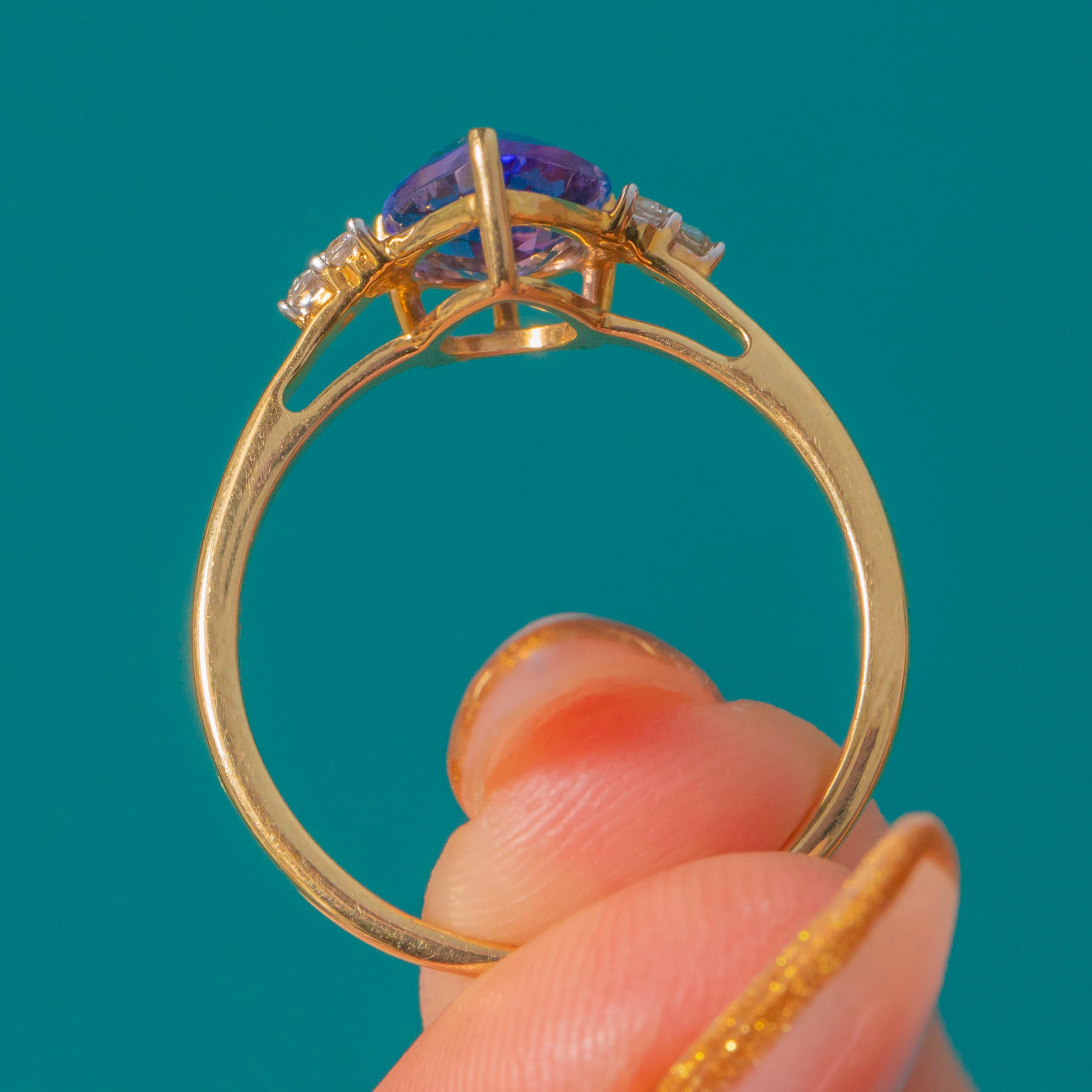 EXCELLENT: The Tanzanite is bright and eye-clean with vivid violet-blue colour. Diamonds are secure and full of sparkle. The 9ct Gold band is smooth and well-polished, showing minimal wear from previous ownership.
