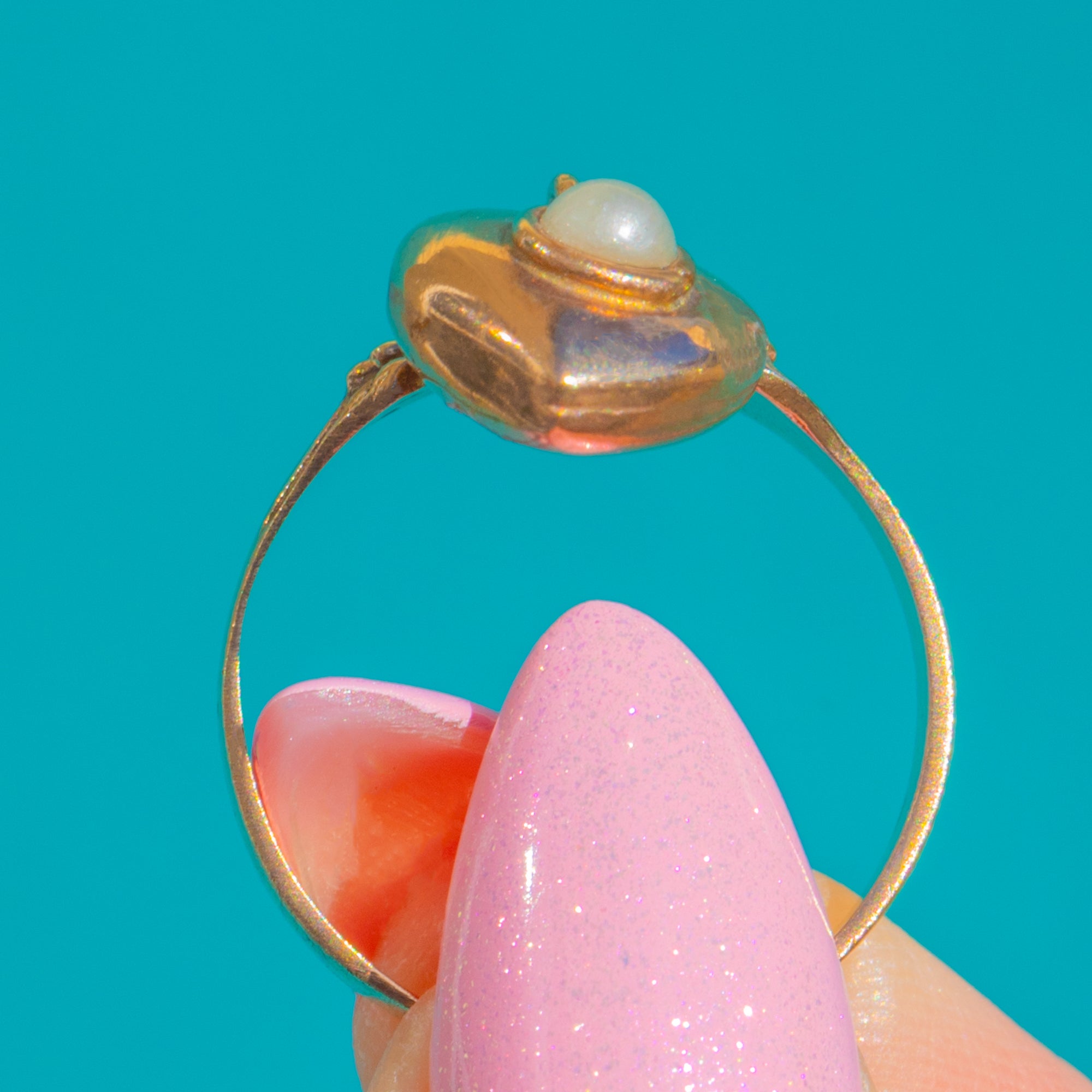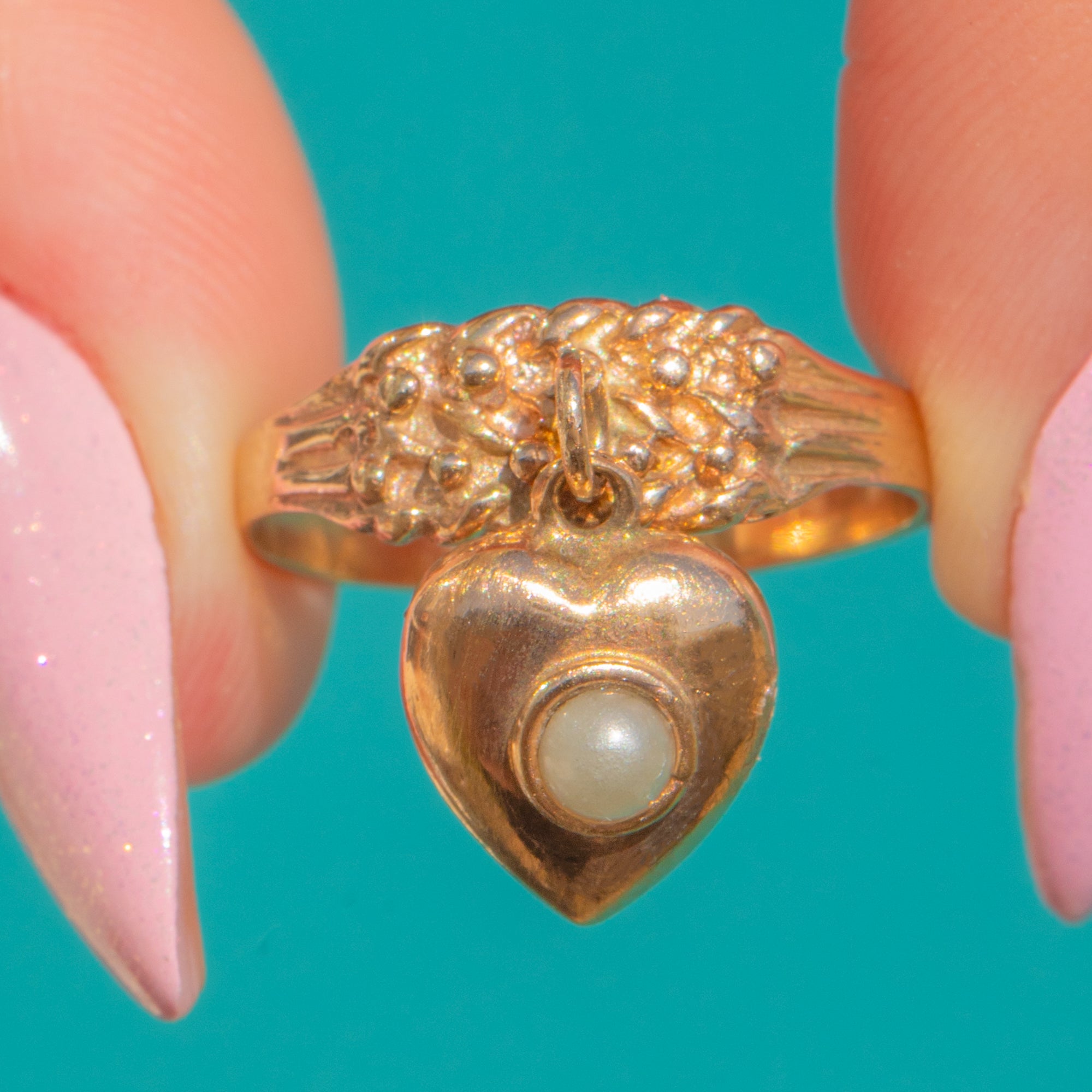A dainty Vintage charmer, this 9ct Gold “keeper” ring suspends a petite heart drop set with a creamy Pearl. The articulated heart sways beneath an ornate scalloped cartouche, while the fine shoulders are adorned with tiny raised beading for a romantic, Victorian-inspired flourish.