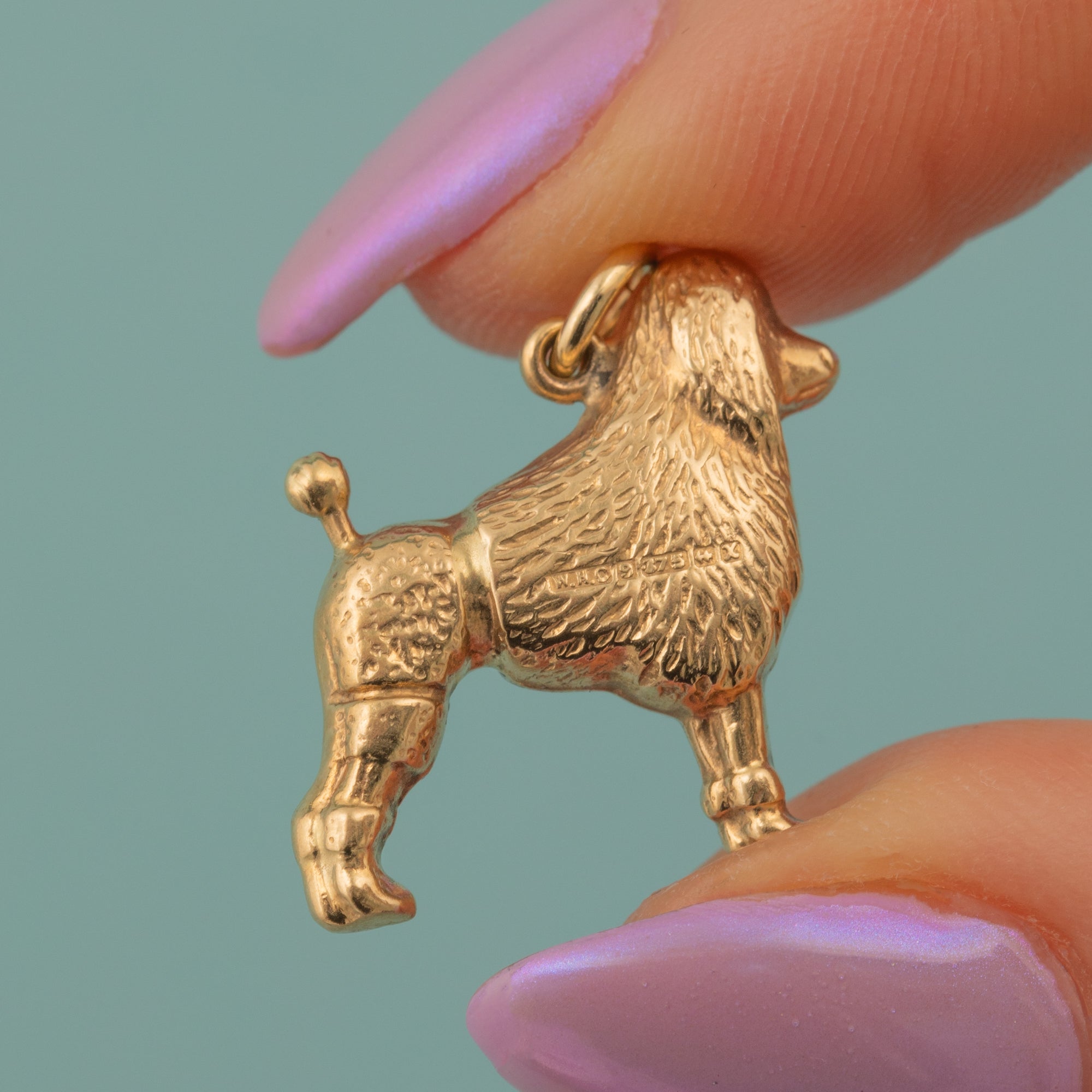 EXCELLENT. This 9ct Gold poodle dog charm is in excellent condition. The Gold has a lovely pale yellow hue with wonderful reflective qualities. The body of the dog is defined and the engraved details have remained crisp. With a full set of legible hallmarks dating to 1973, this mid-century dog pendant will make a superb addition to your collection!