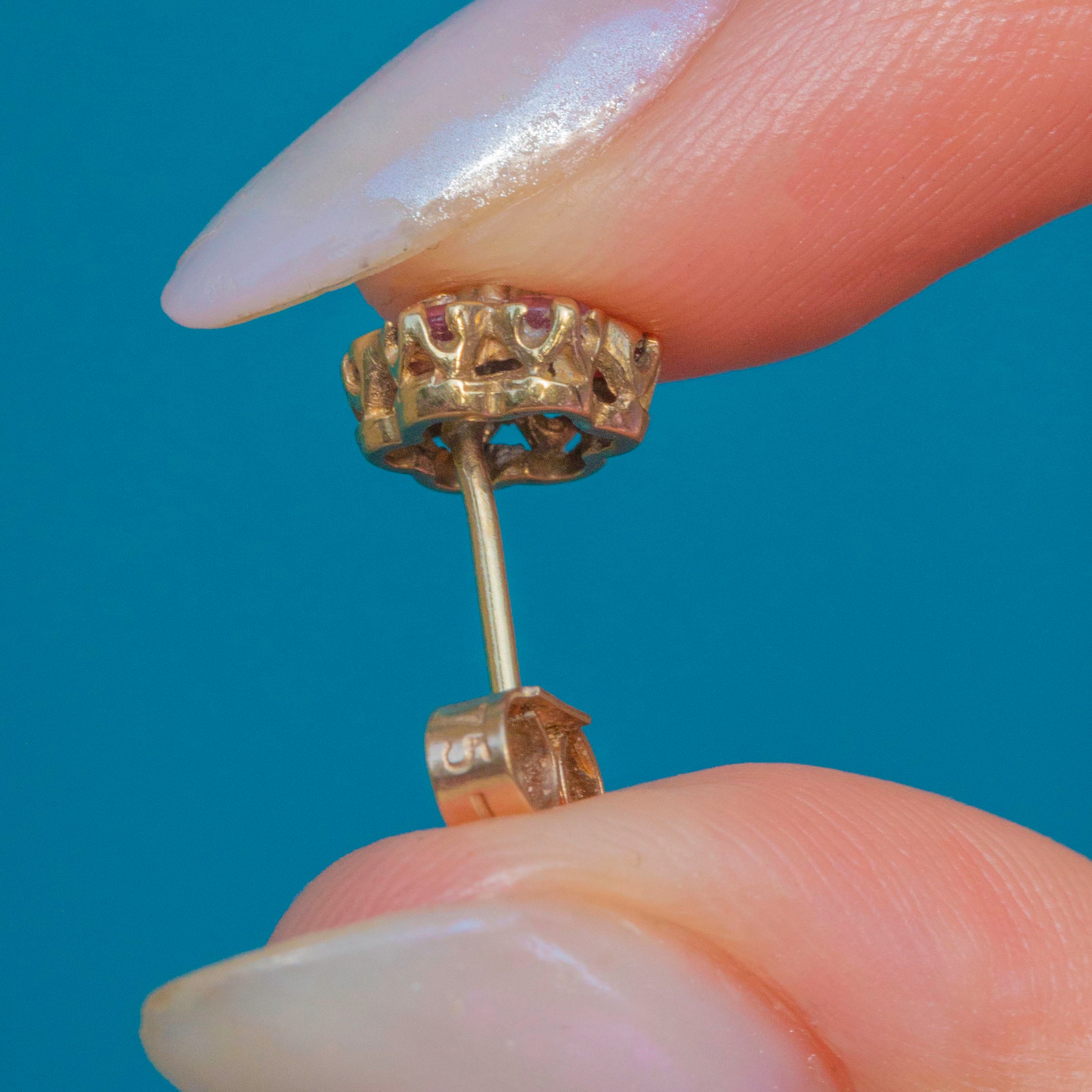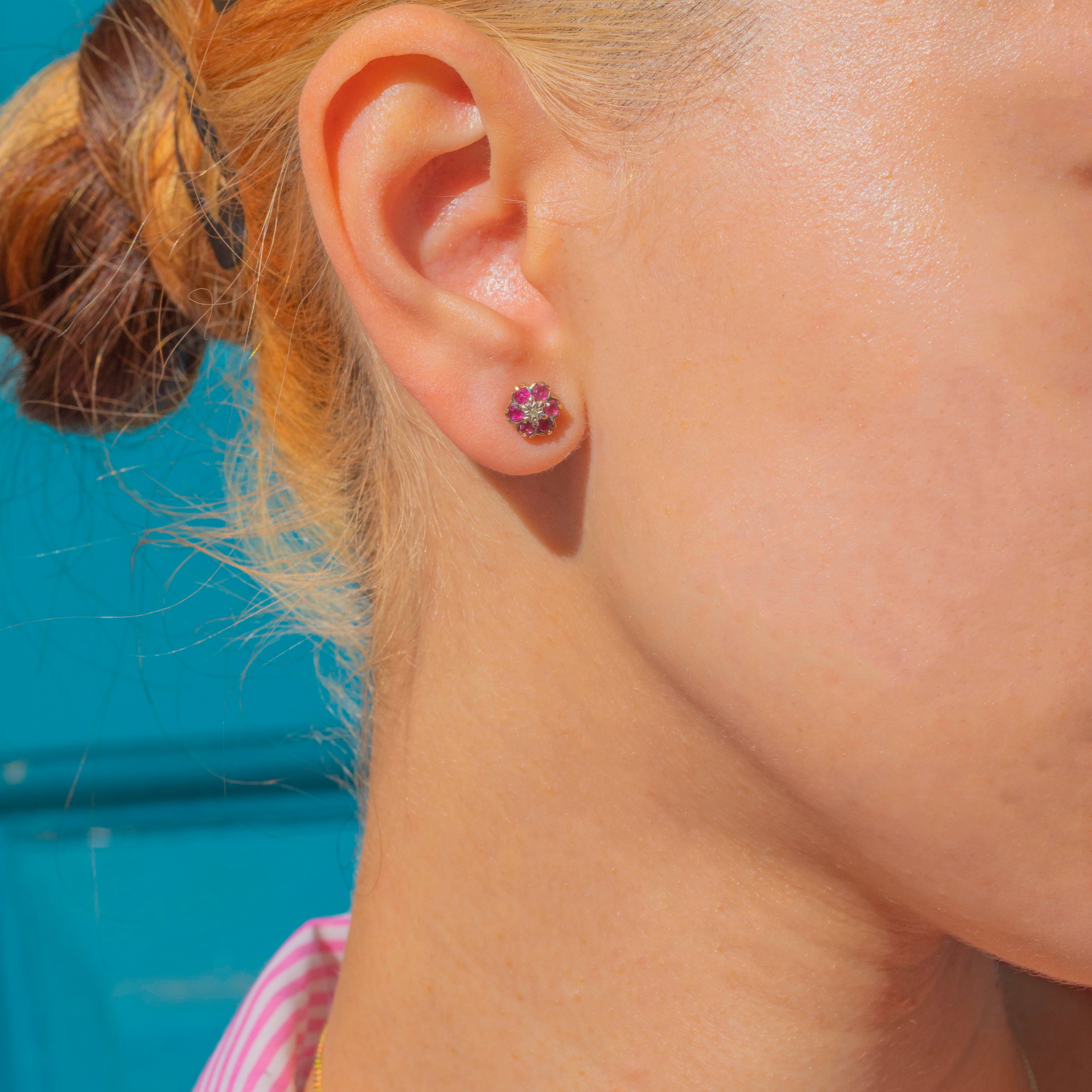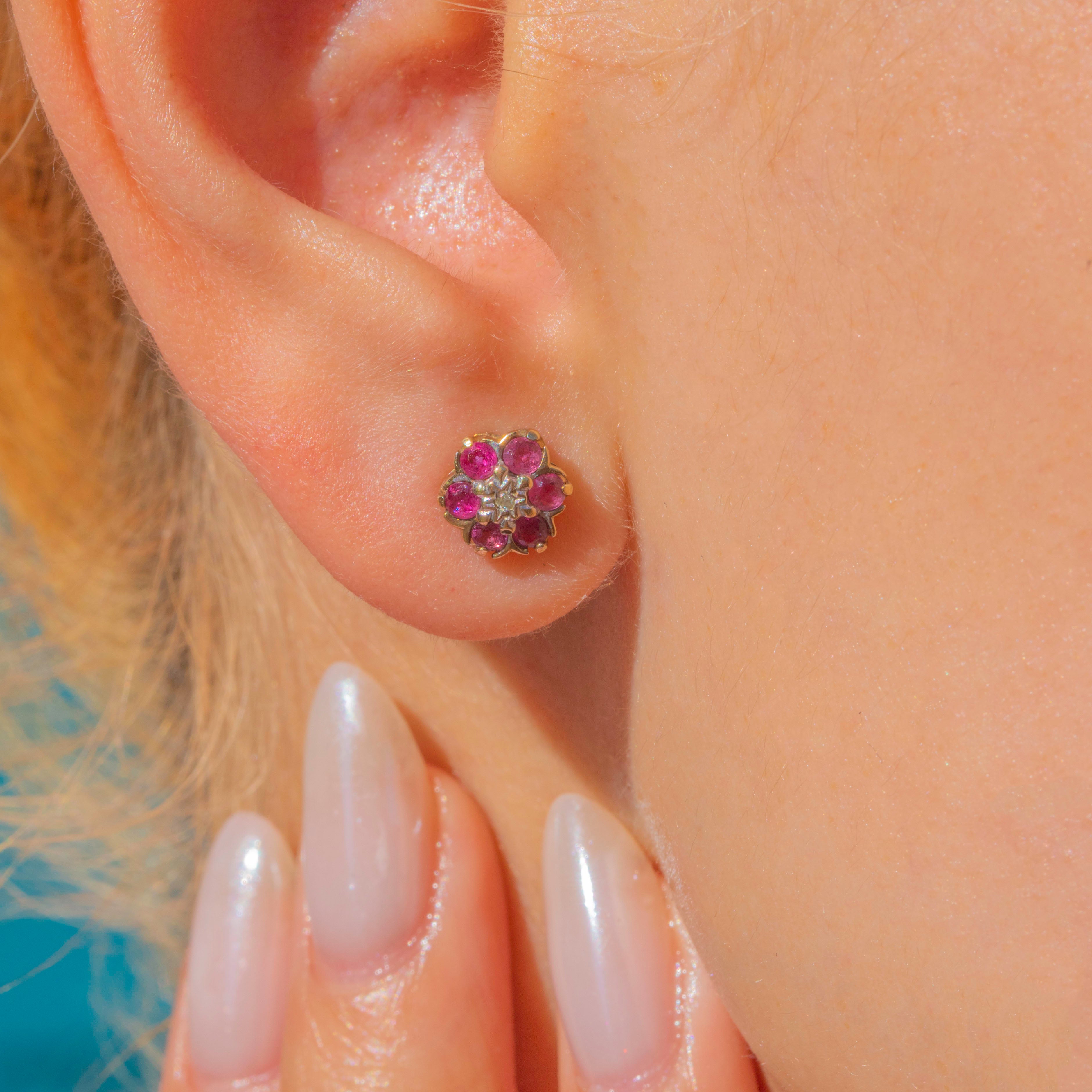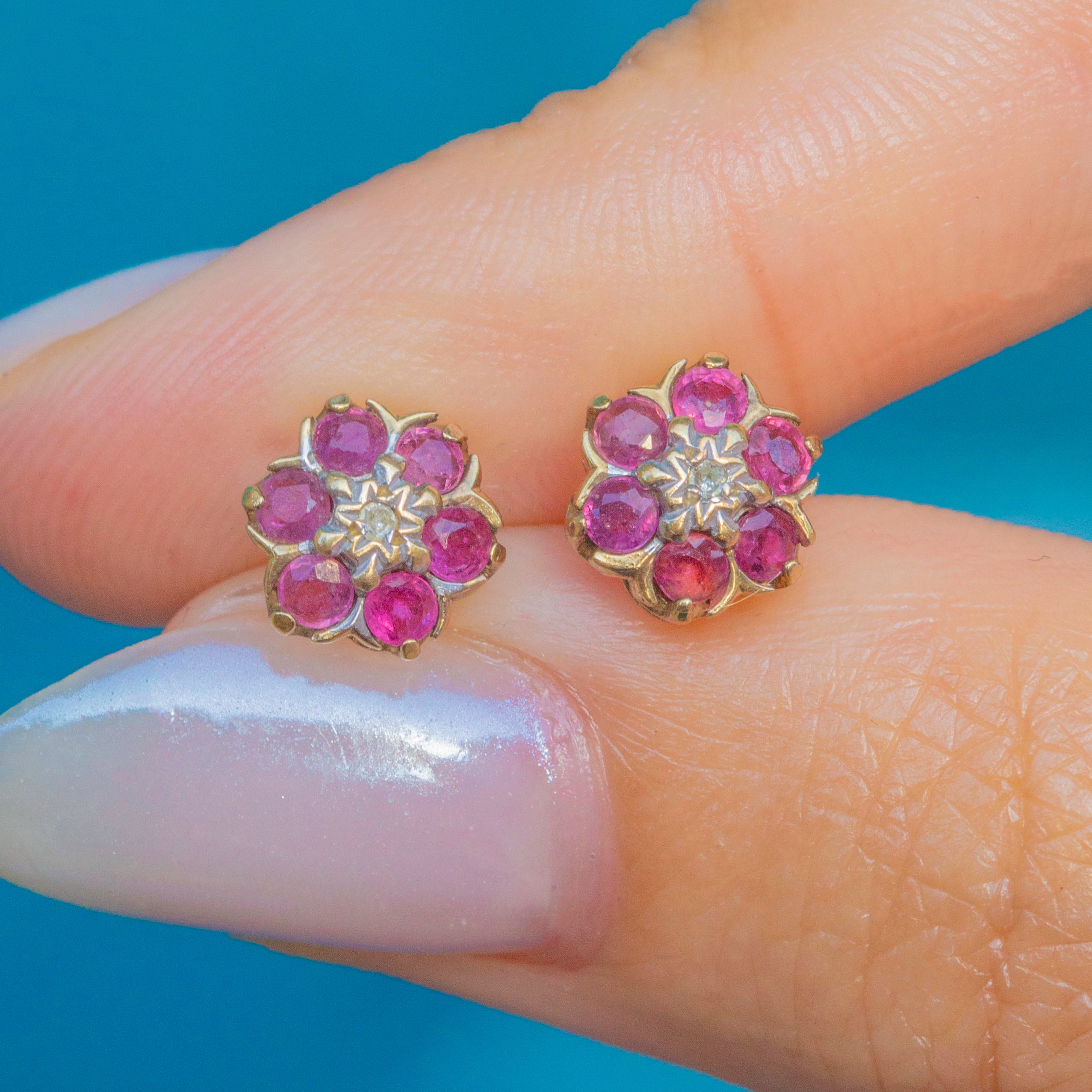 This pair of stud earrings are perfect for everyday, all day wear! Set in 9ct Gold, these clusters consists of natural Rubies and a single Diamond centre.