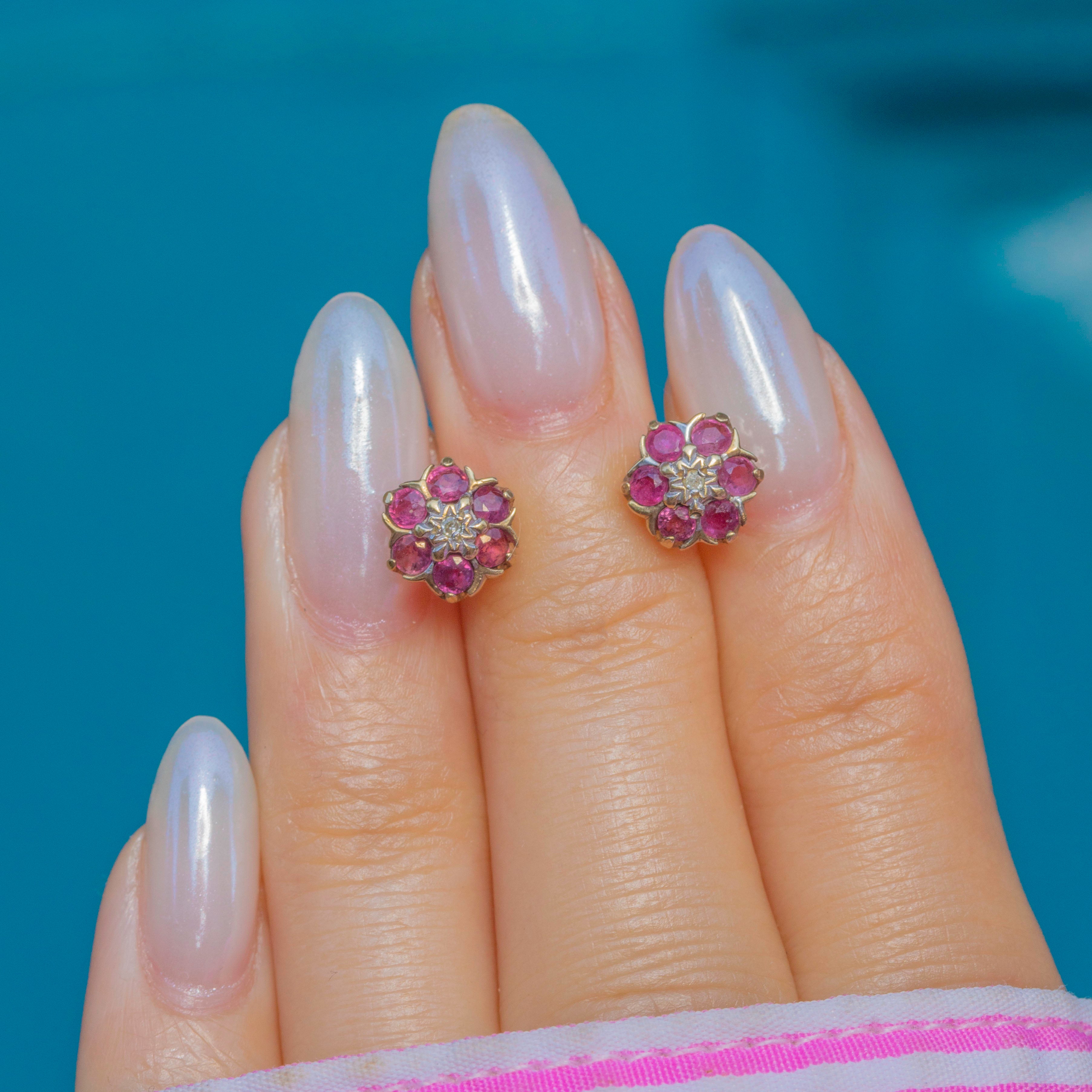 9ct Gold Ruby Diamond Flower Cluster Stud Earrings