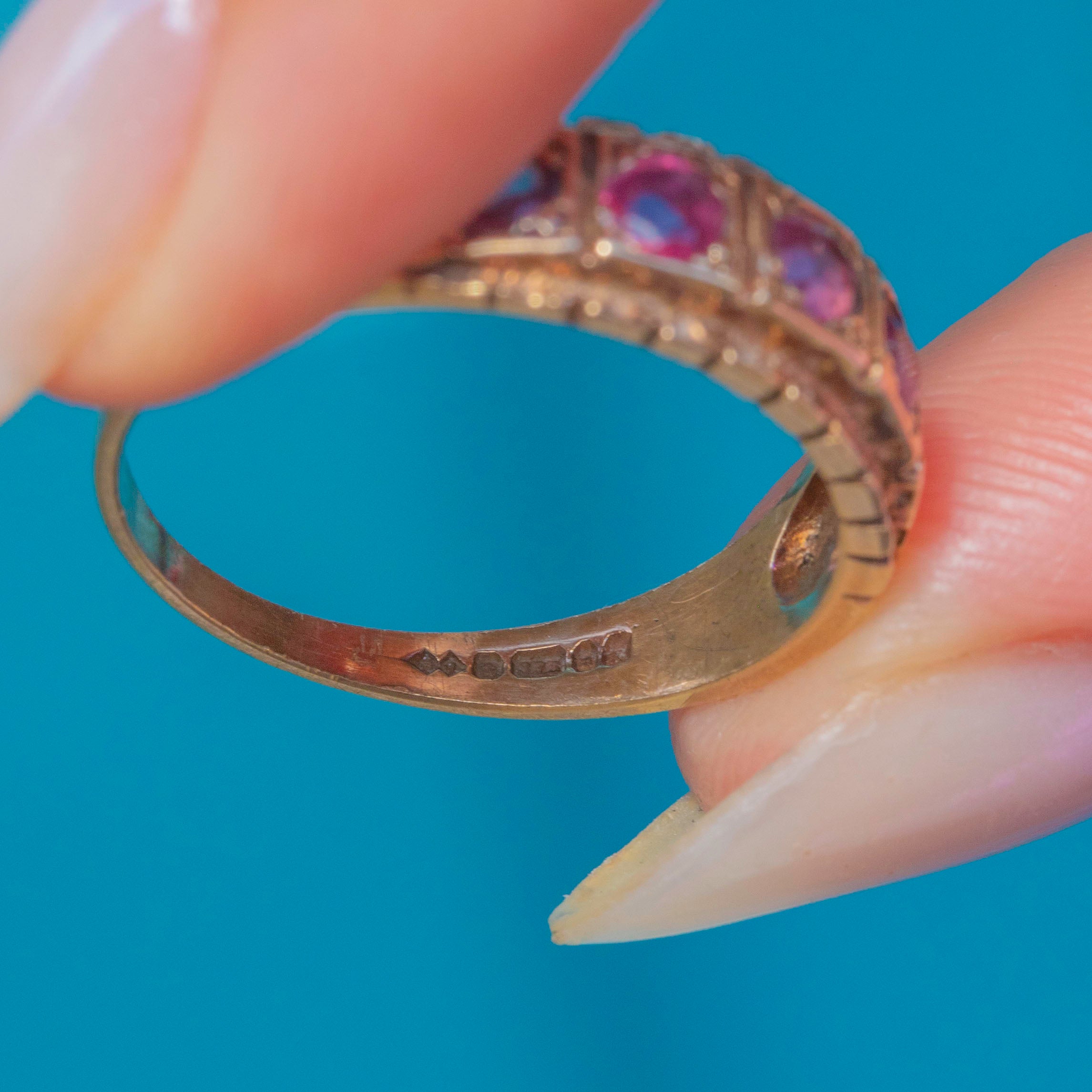 VERY GOOD. The Gold is buttery and the Rubies are securely set, with no chips and only mild surface wear noticeable under close inspection. The ring has been previously resized, and there is minor discolouration at the back of the band, but the ring is smooth and comfortable to wear and the hallmarks are fully legible, allowing us to accurately date it to 1984.