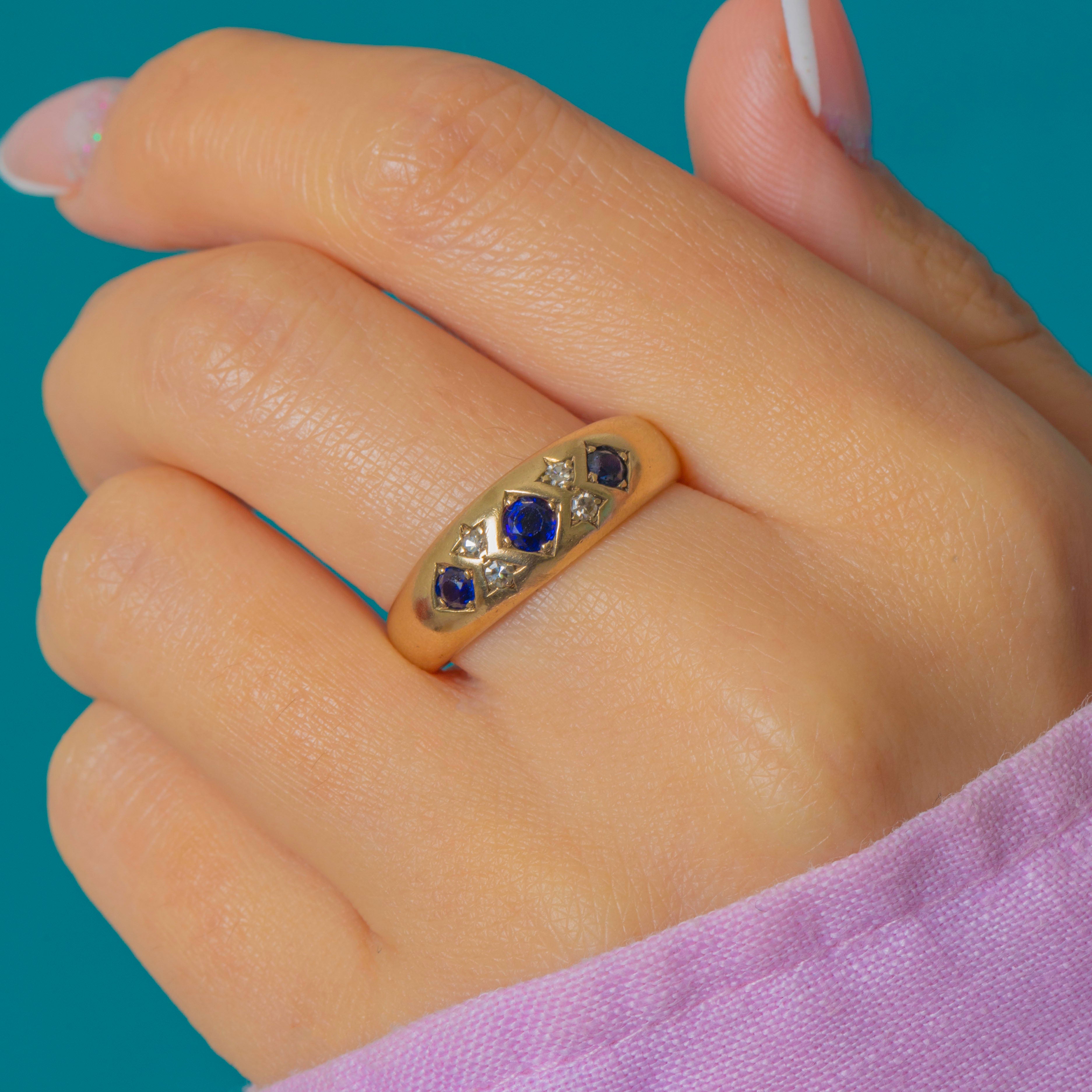 EXCELLENT: The Sapphires and Diamonds are bright and securely set with no chips or visible wear. The Gold band shows only minimal surface marks in line with age and has clearly been well cared for.