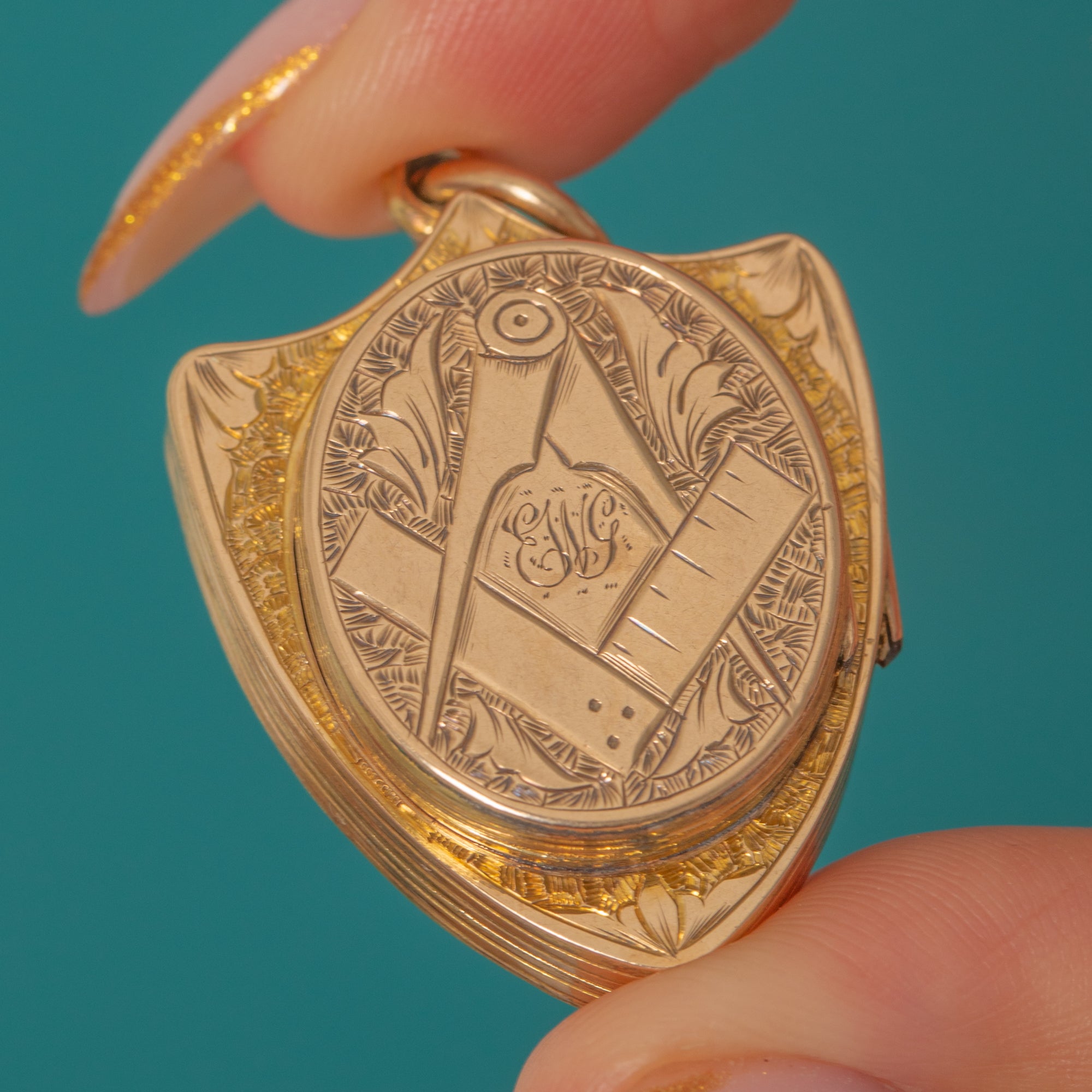 The front displays a finely engraved shield adorned with ivy leaves, representing fidelity and everlasting love, while a subtle Masonic square and compass motif adds depth and meaning to its design.
