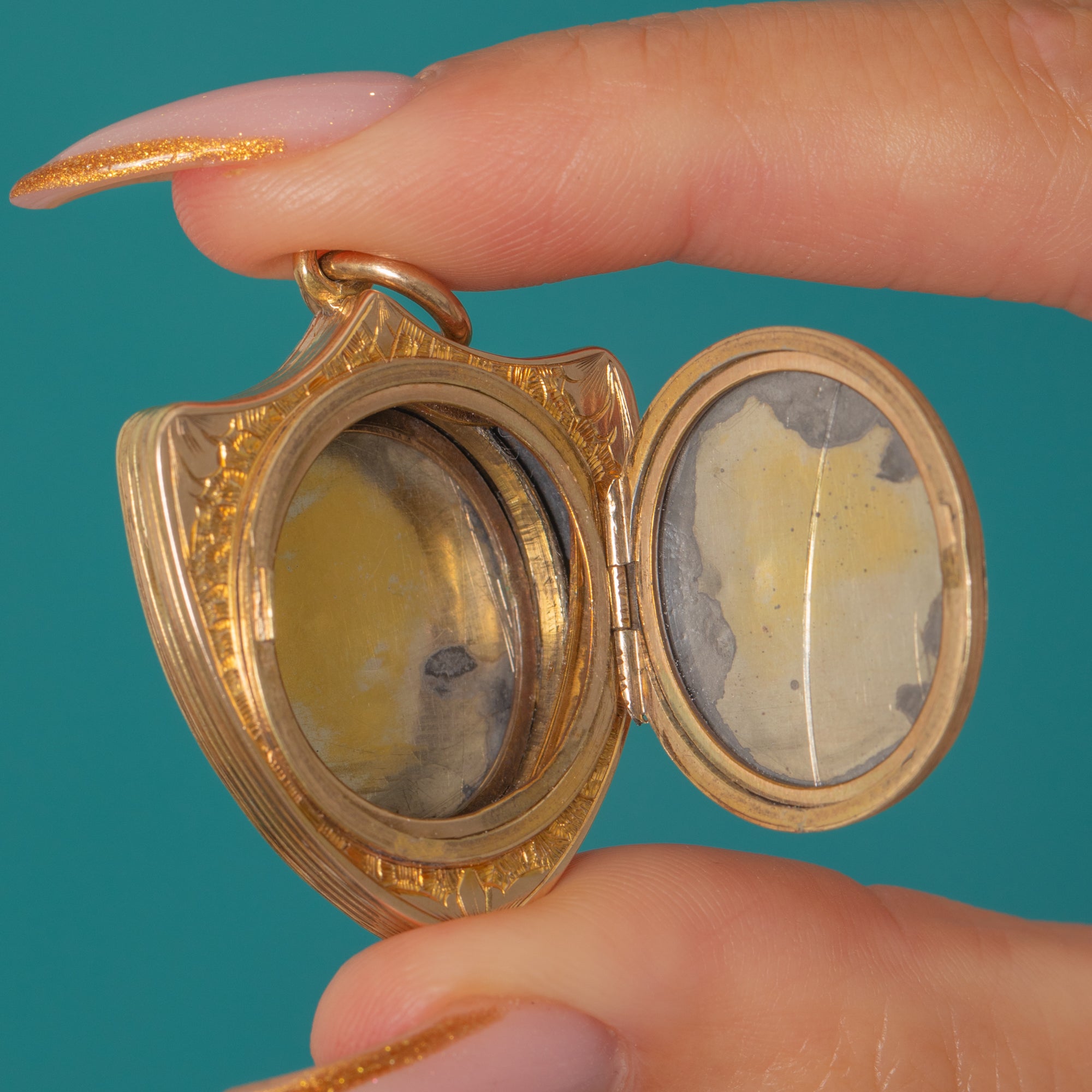 MATERIALS: Tests as 9ct Gold front and back, metal frames and hinge for strength & durability.