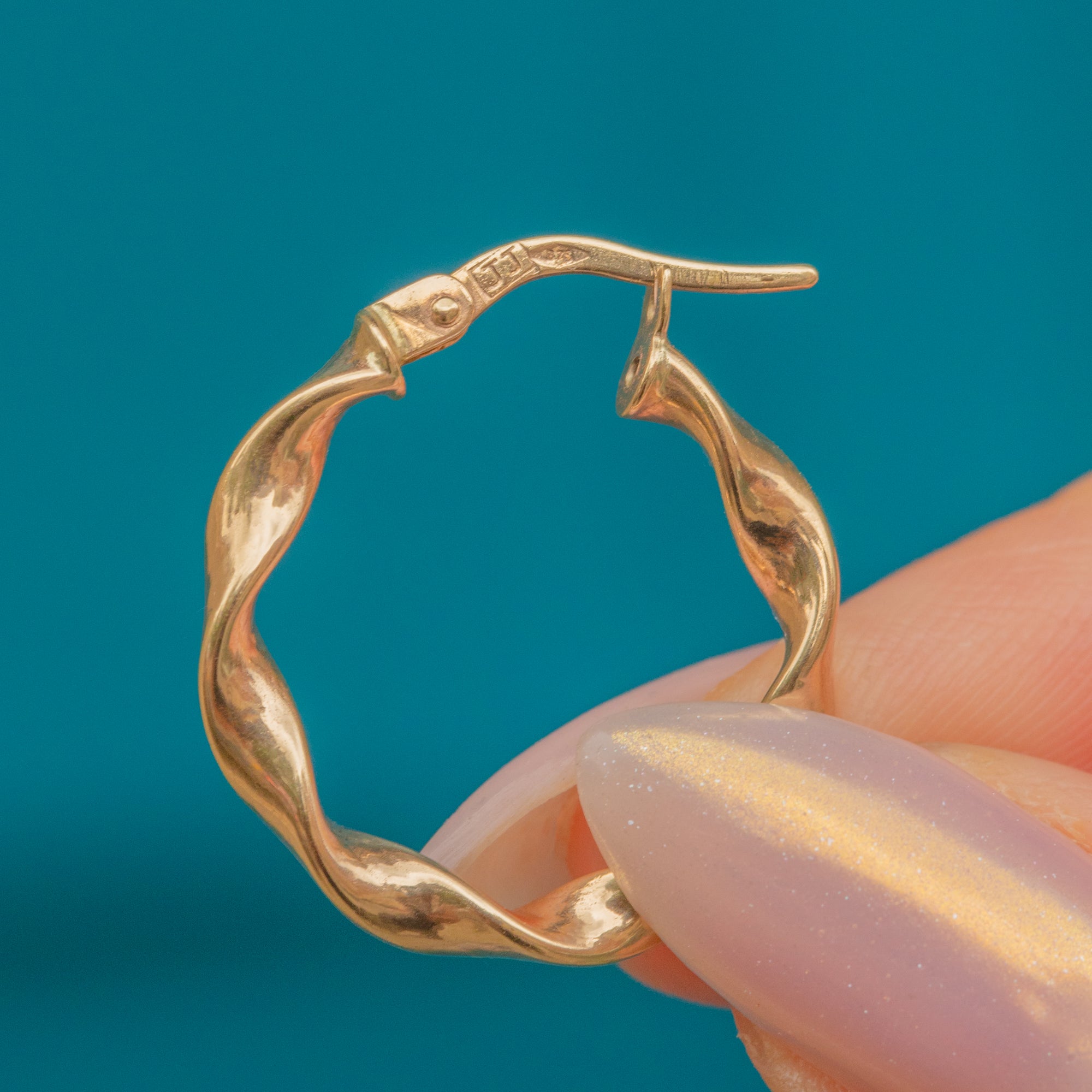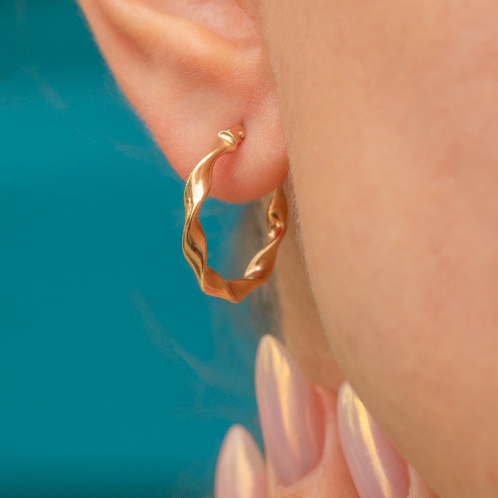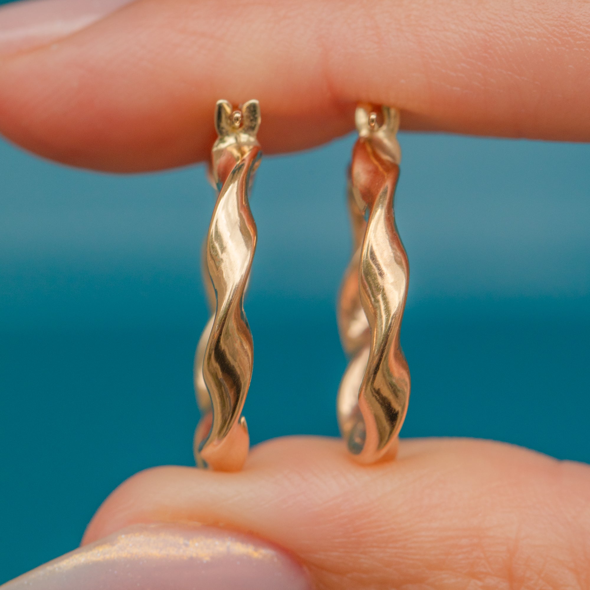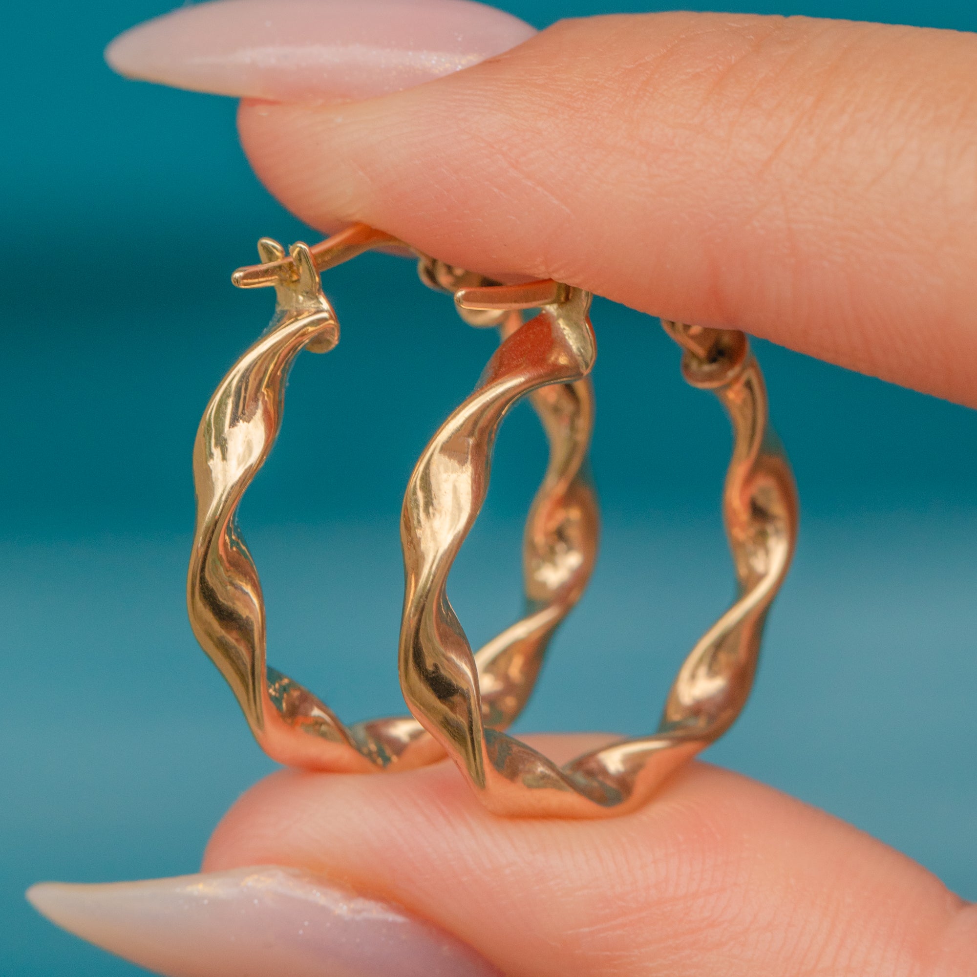 Their twisted formation gives these hoops a nice edge and allows the light to reflect effortlessly from their glossy surface. A lovely lightweight pair, these hoops are soon to be a staple in your collection.