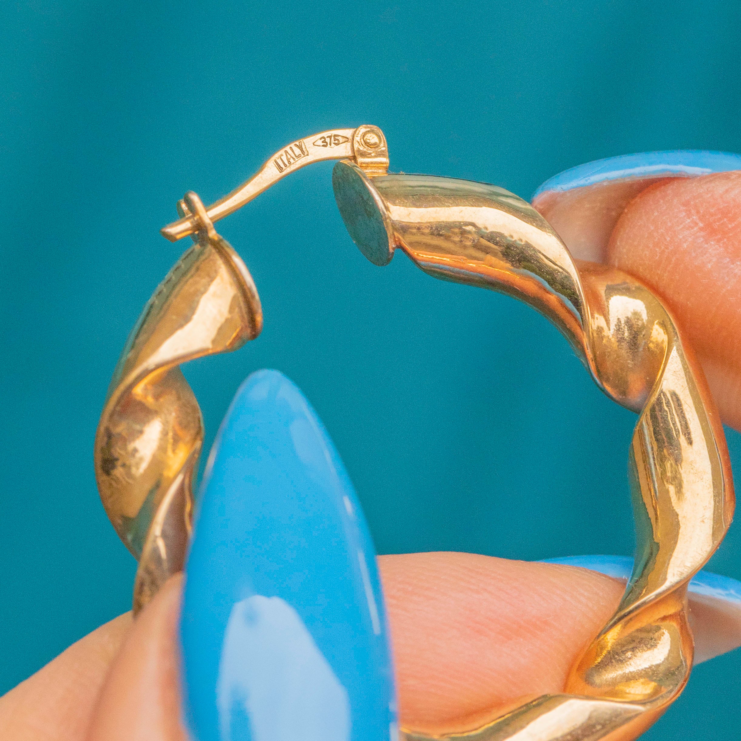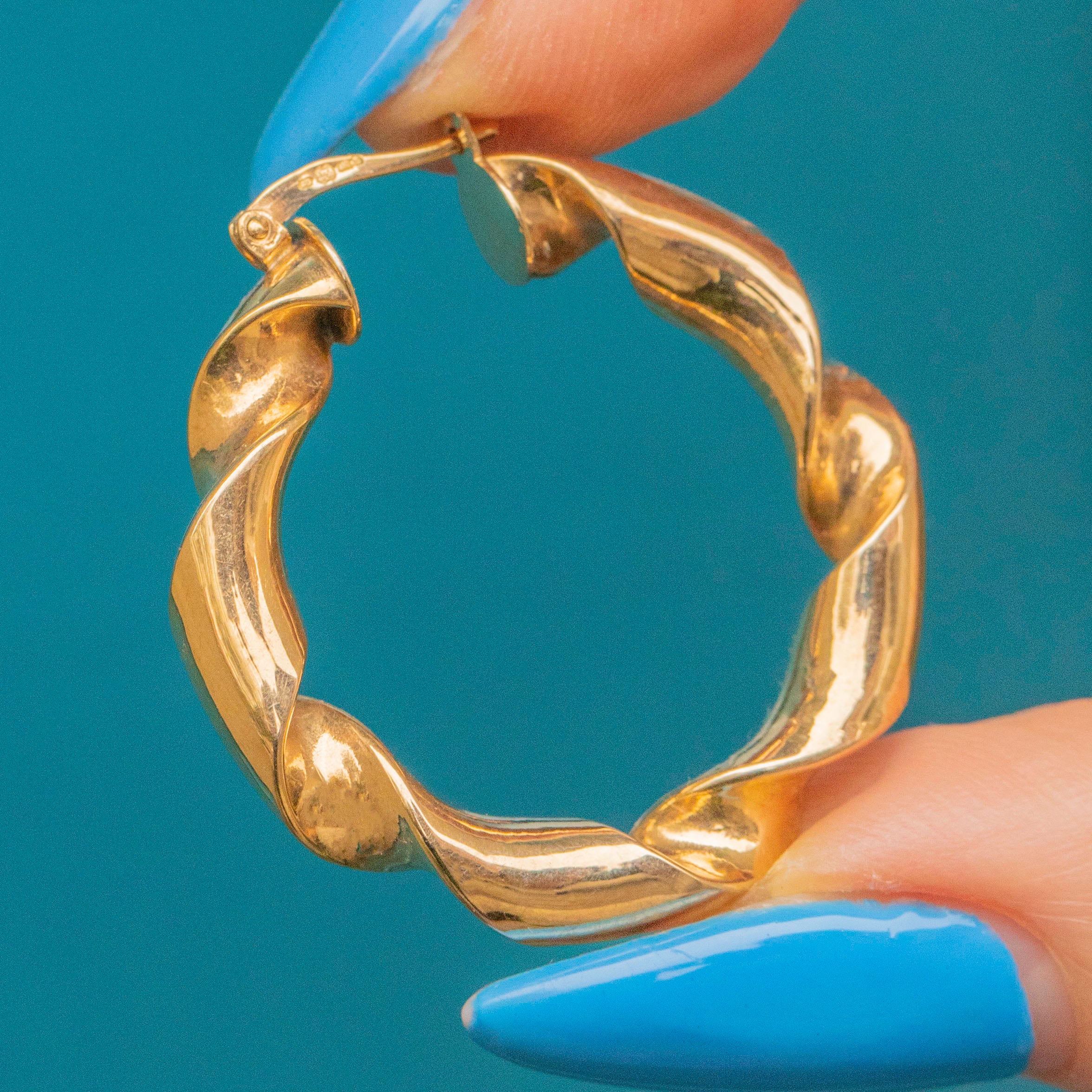 EXCELLENT. This pair of 9ct Gold twisted hoop earrings are in excellent condition. The earrings have been kept beautifully, and have such a gorgeous, sleek design. The lever-backs are in perfect working order, so you can wear them confidently and securely.
