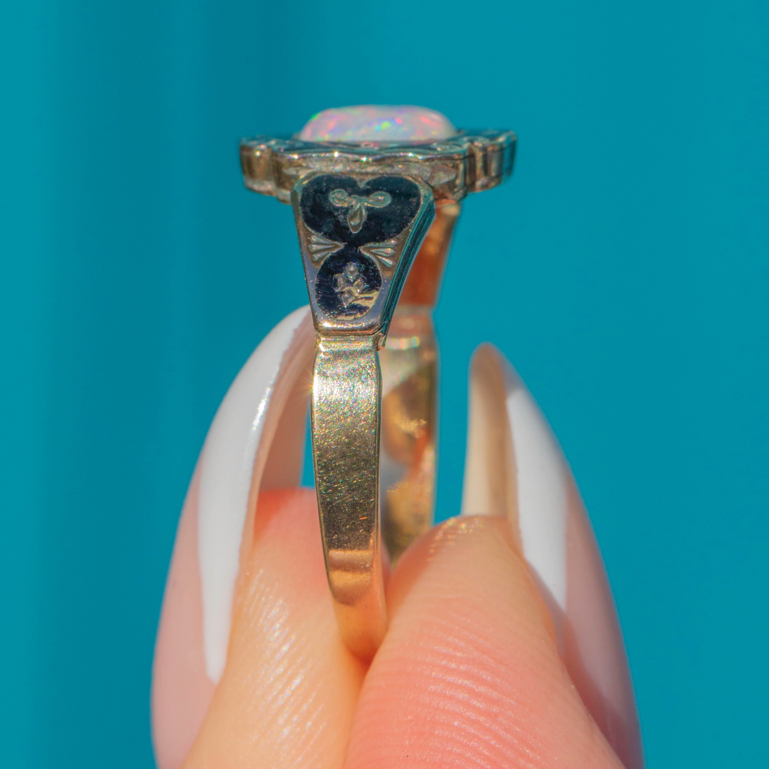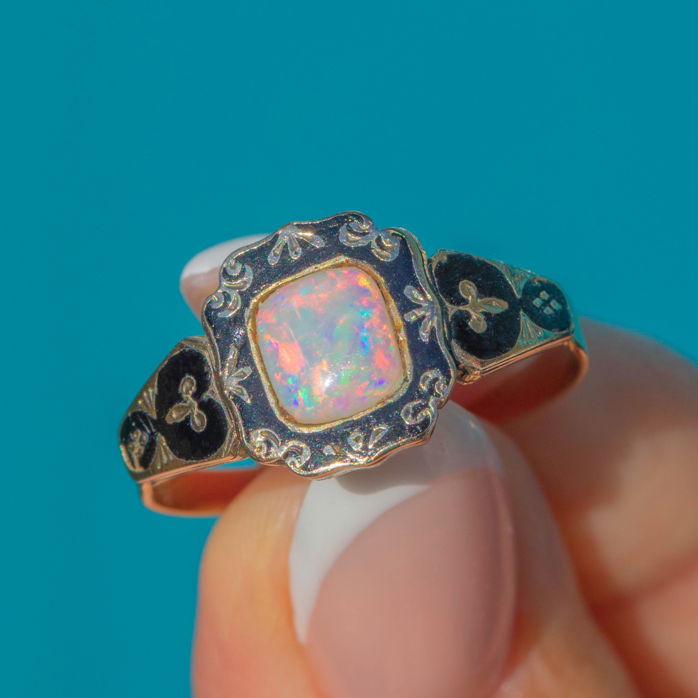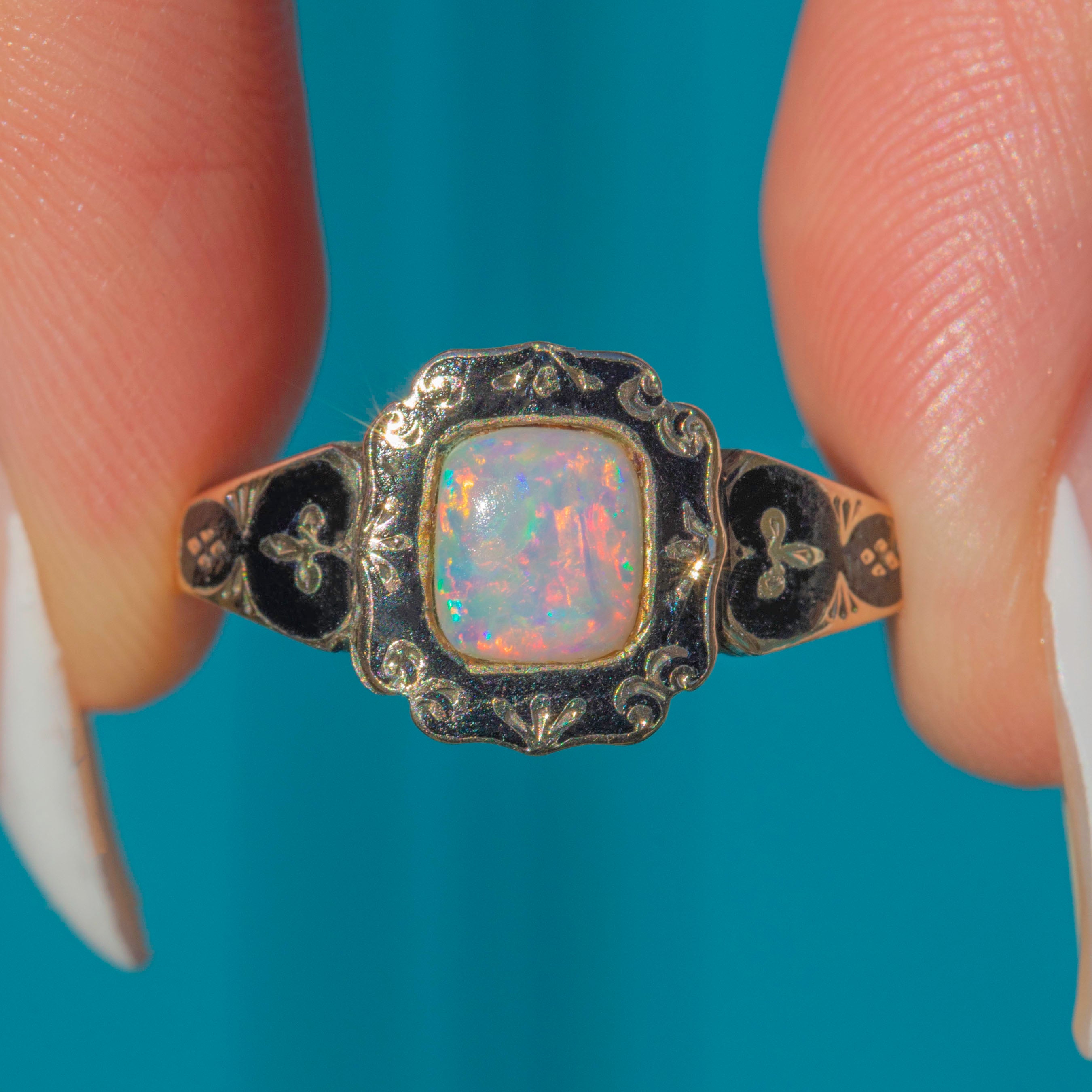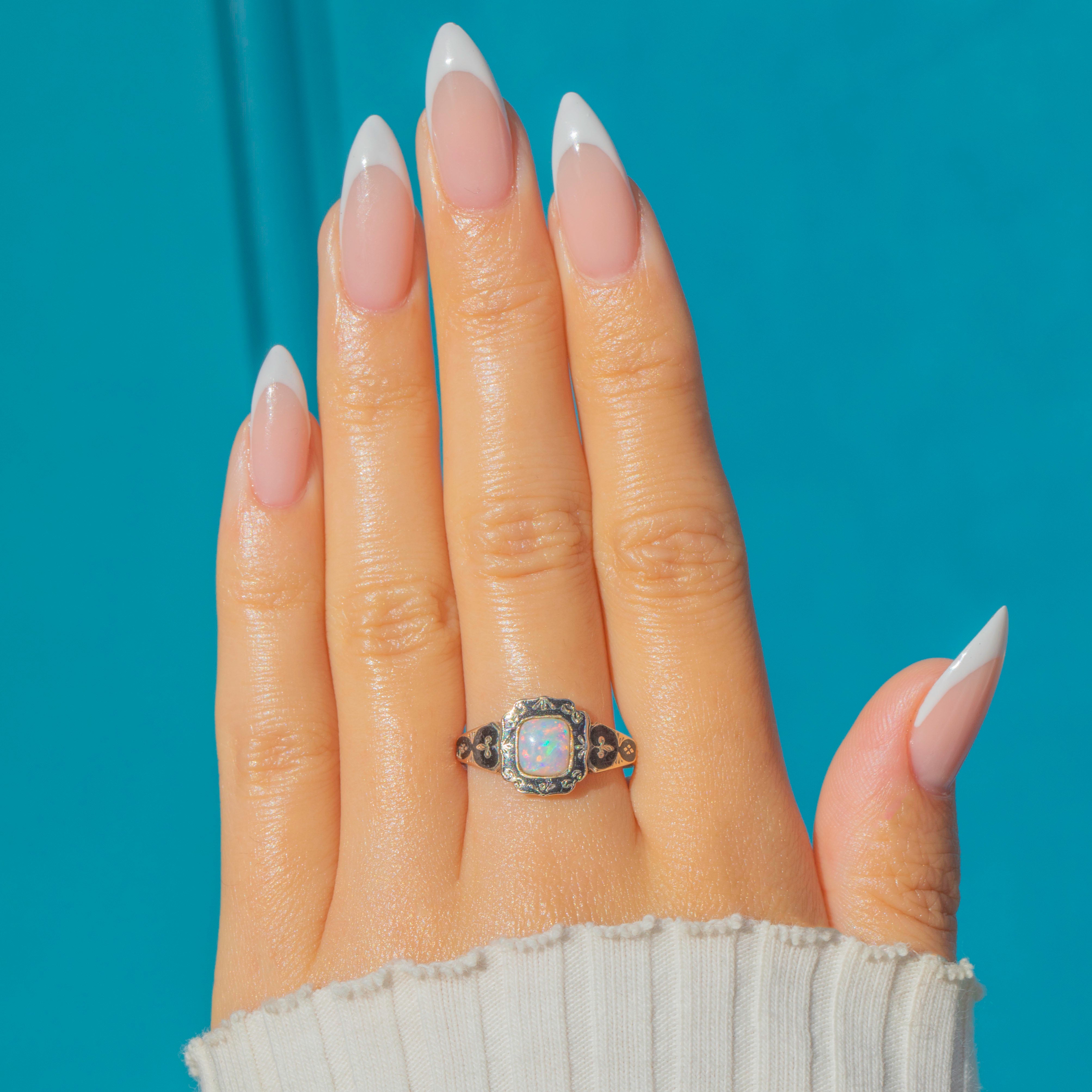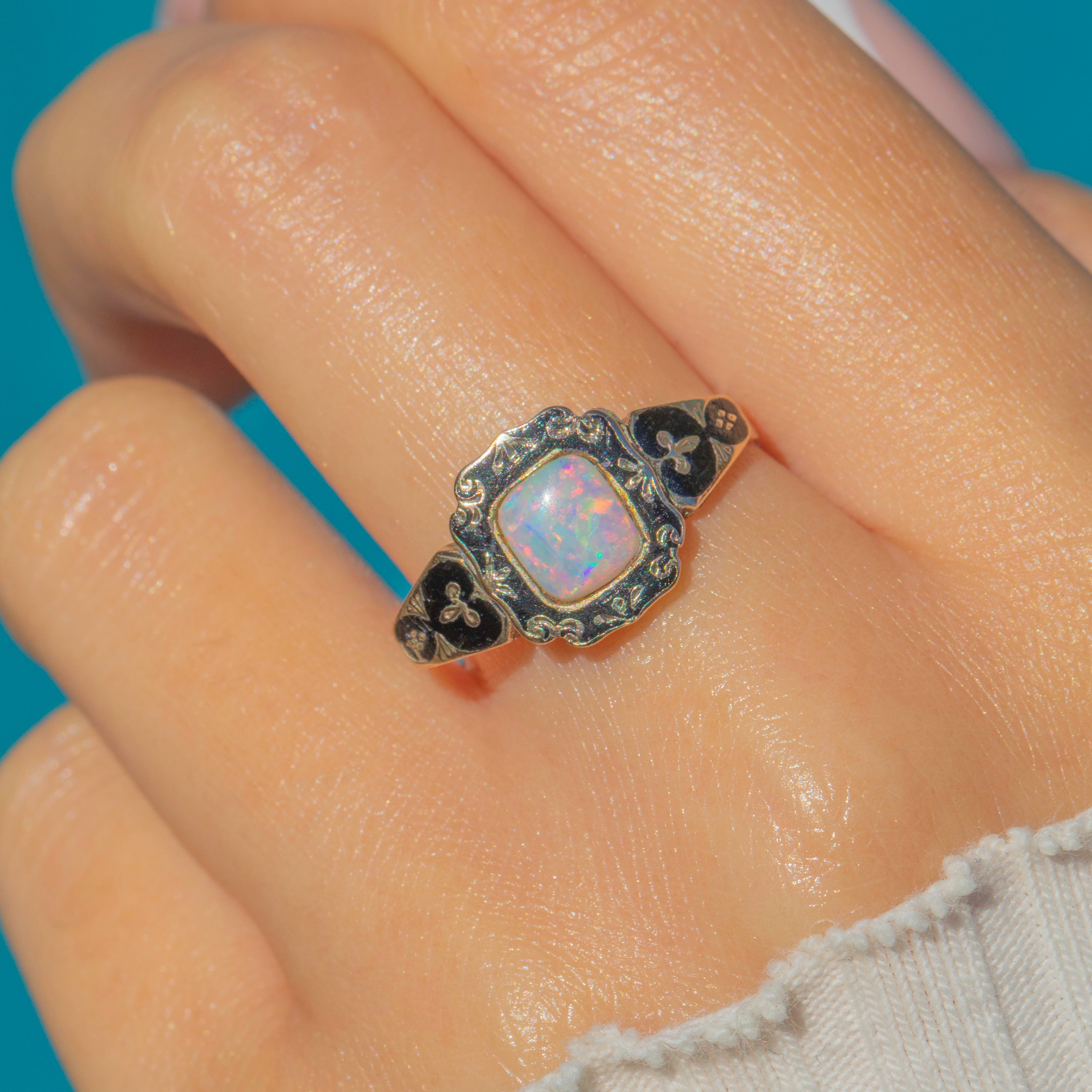 A beautiful Victorian mourning ring in 9ct Gold, embellished with inky Black Enamel and centred by a glowing Opal. The scalloped, engraved bezel and enamelled shoulders give this piece that quintessential 19th-century sentiment, while the Opal brings a lively play-of-colour to the sombre palette.