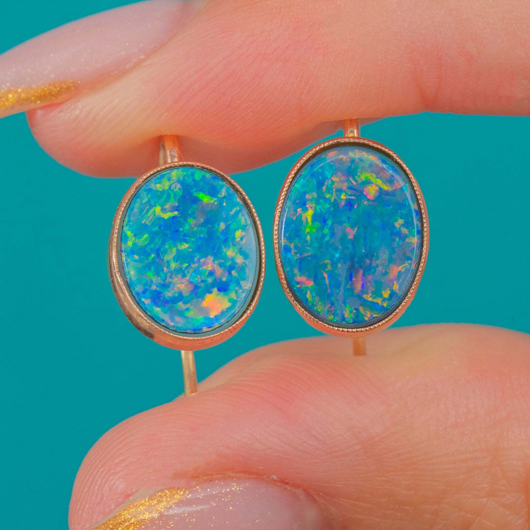 EXCELLENT: The Opal Doublets are bright and well-preserved with no chips or abrasions. The Gold bezels and backs show only minimal light wear and are in lovely antique condition.