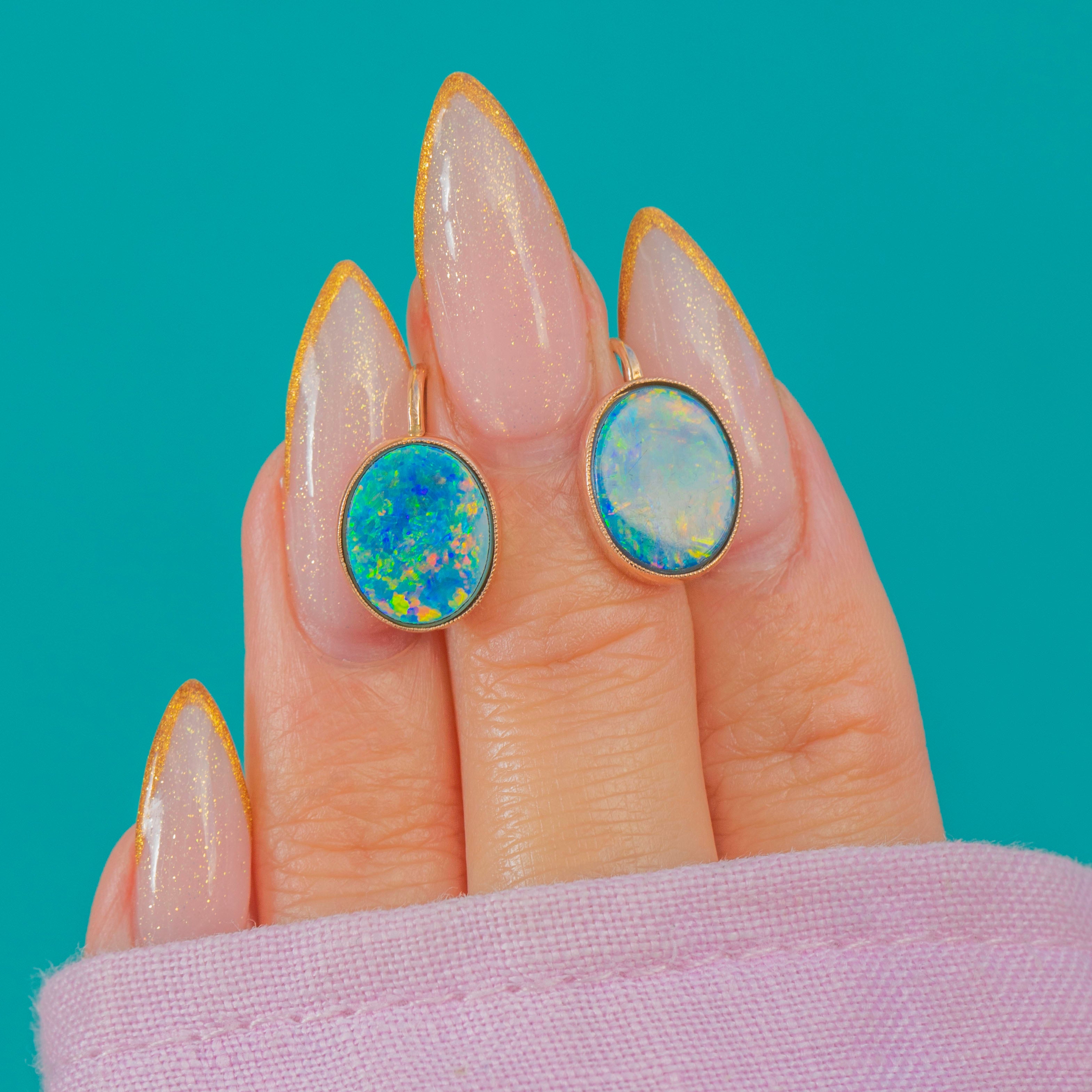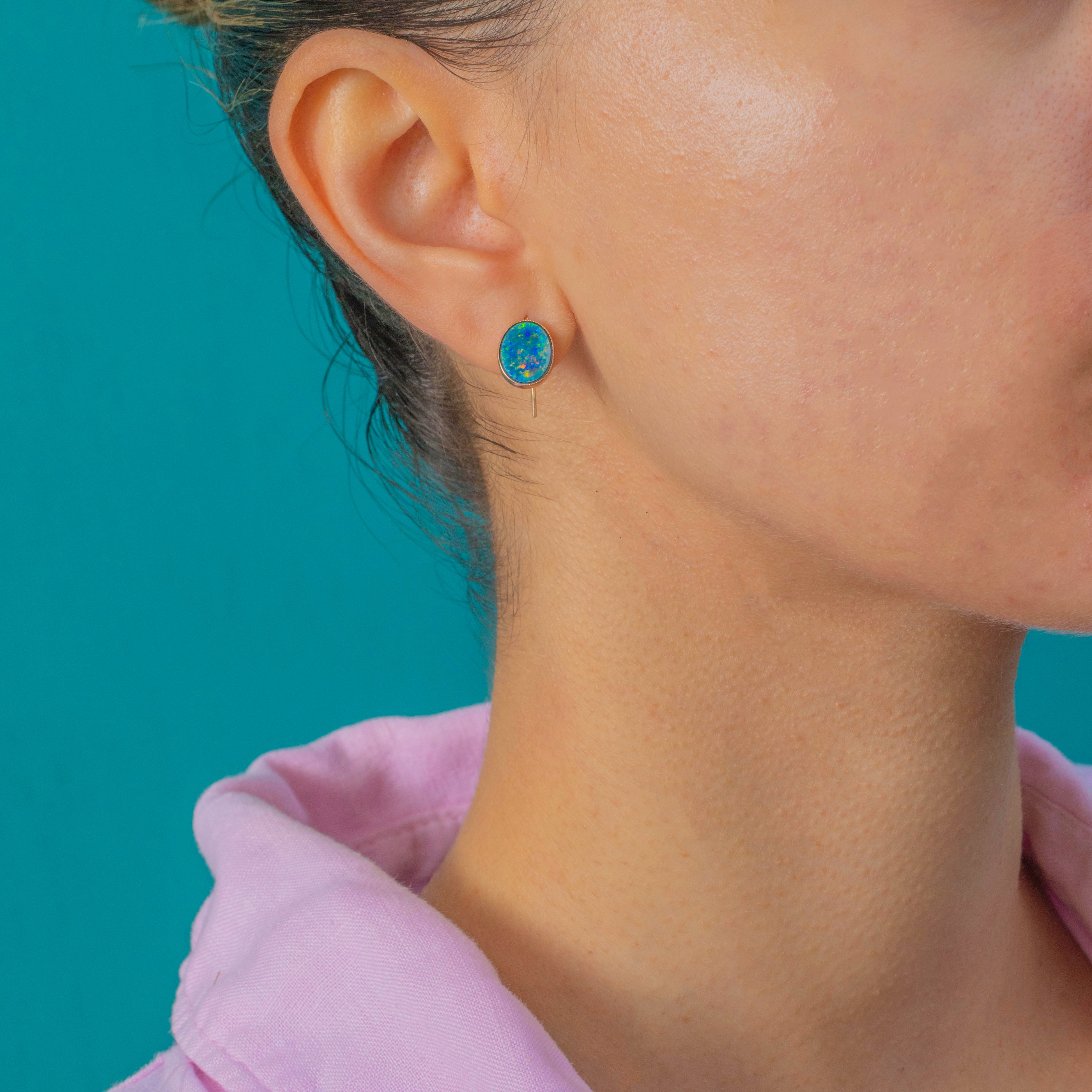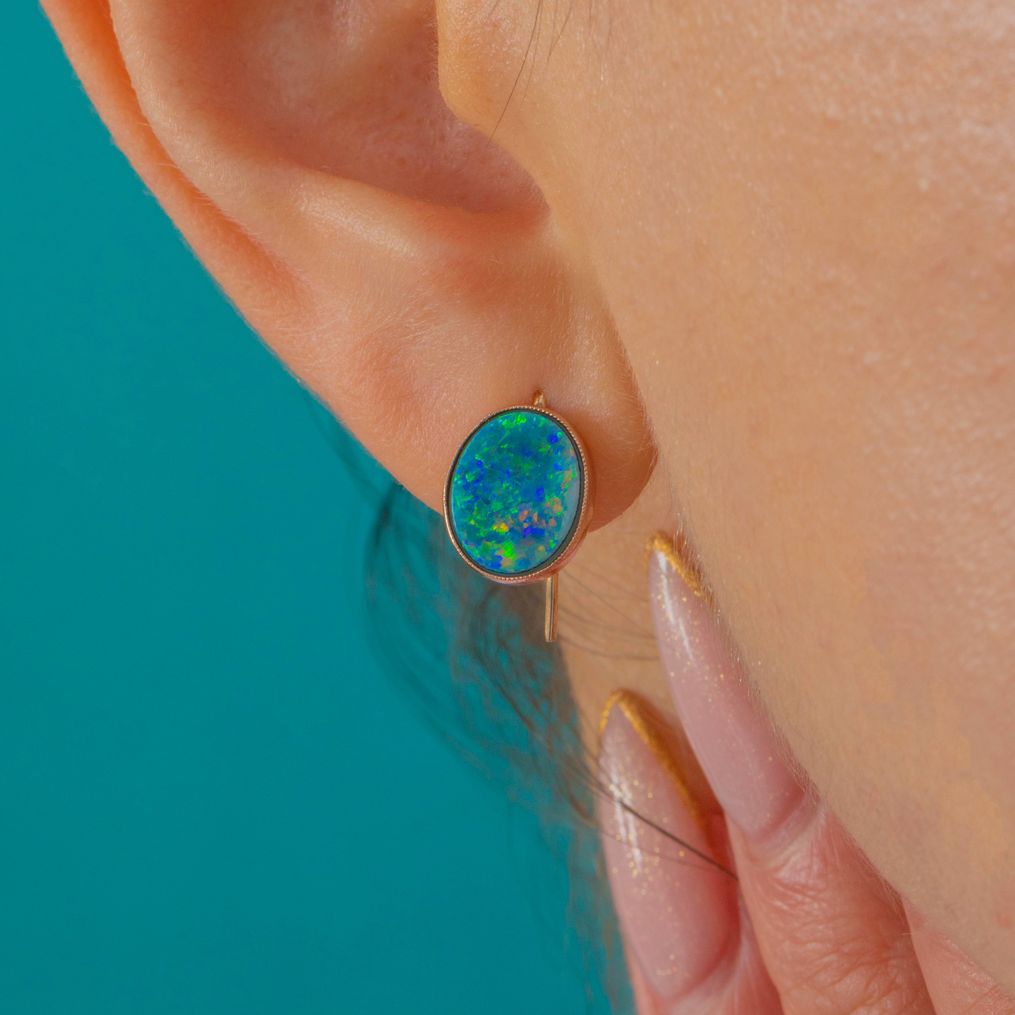 These Art Deco Opal Doublet earrings are a pretty and wearable antique pair, crafted in warm 9ct Gold. The Opals display shifting pastel tones that glow beautifully in the light, framed by smooth Gold bezels for a clean and timeless look.