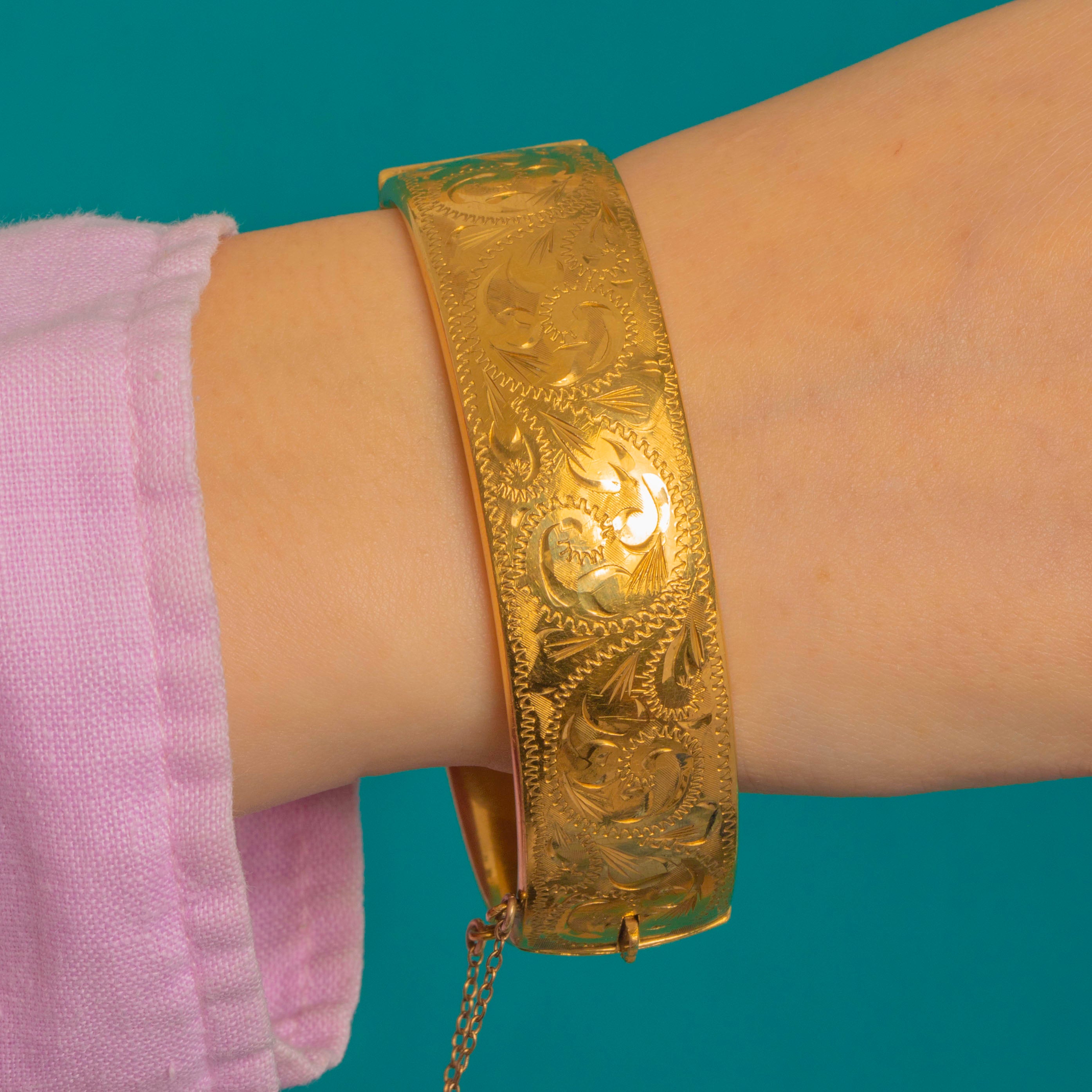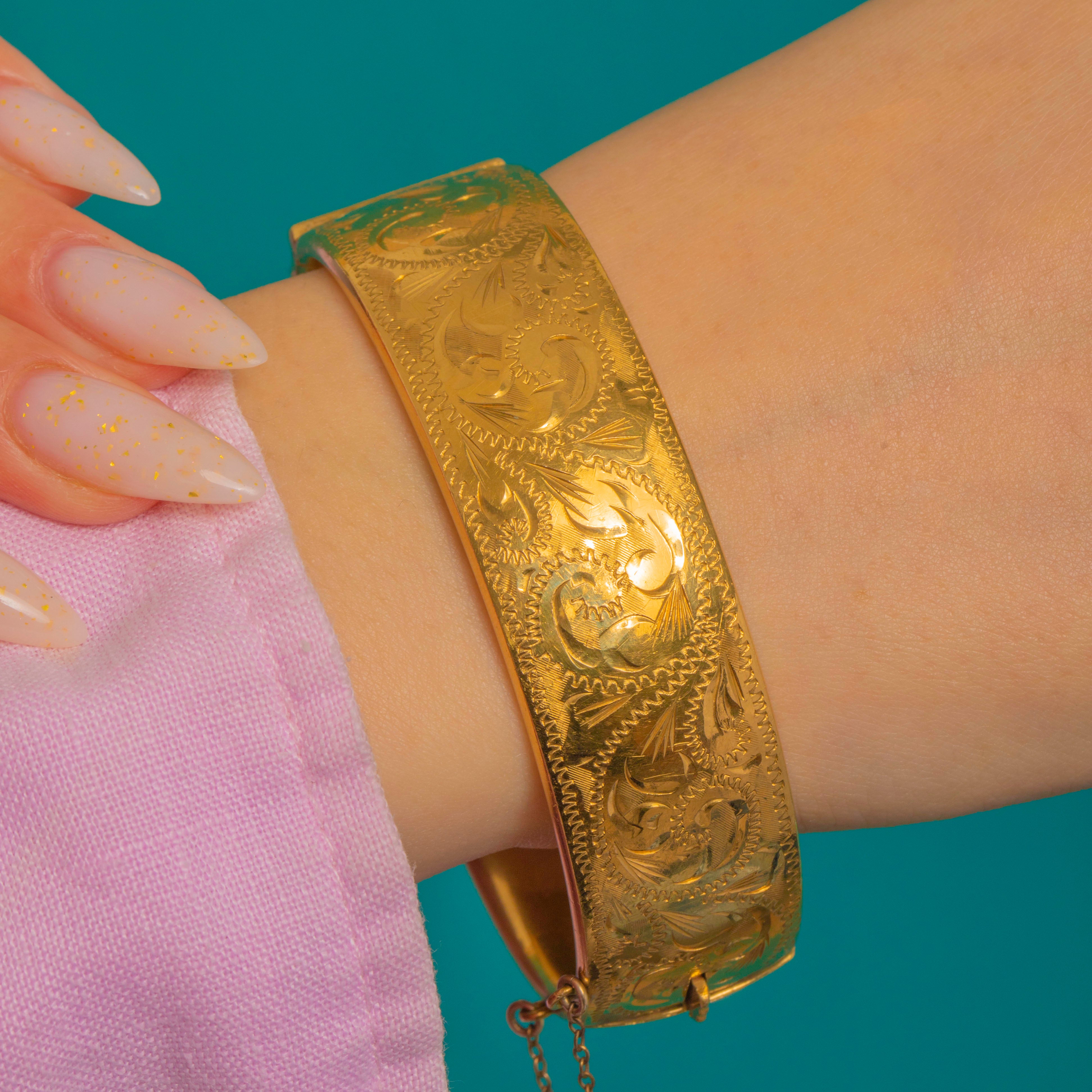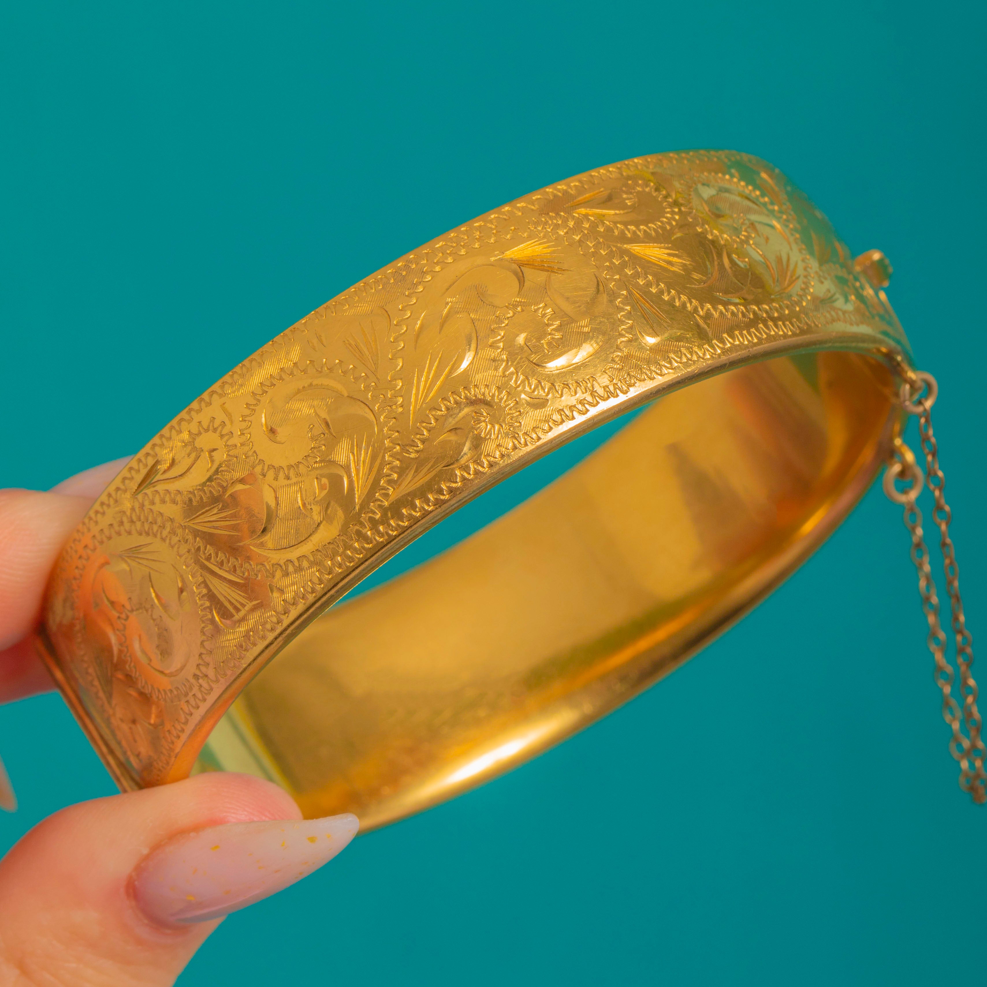 A bold, beautifully engraved Vintage hinged bangle that wraps the wrist in gleaming Yellow Gold. Its wide oval profile is richly detailed with crisp foliate scrolls and bright‑cut zigzag borders, the engravings catching the light with every movement for a refined, high‑shine finish.