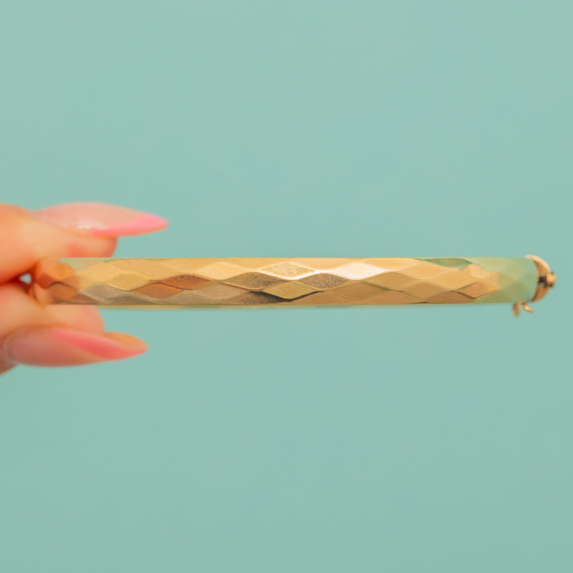 VERY GOOD: This 9ct Rolled Gold faceted bangle is in very good condition! The Gold has a bright and buttery hue with some subtle wear along the edge of the facets, but nothing that detracts from her overall splendour. The bangle closes securely, so you can wear it with utmost confidence!