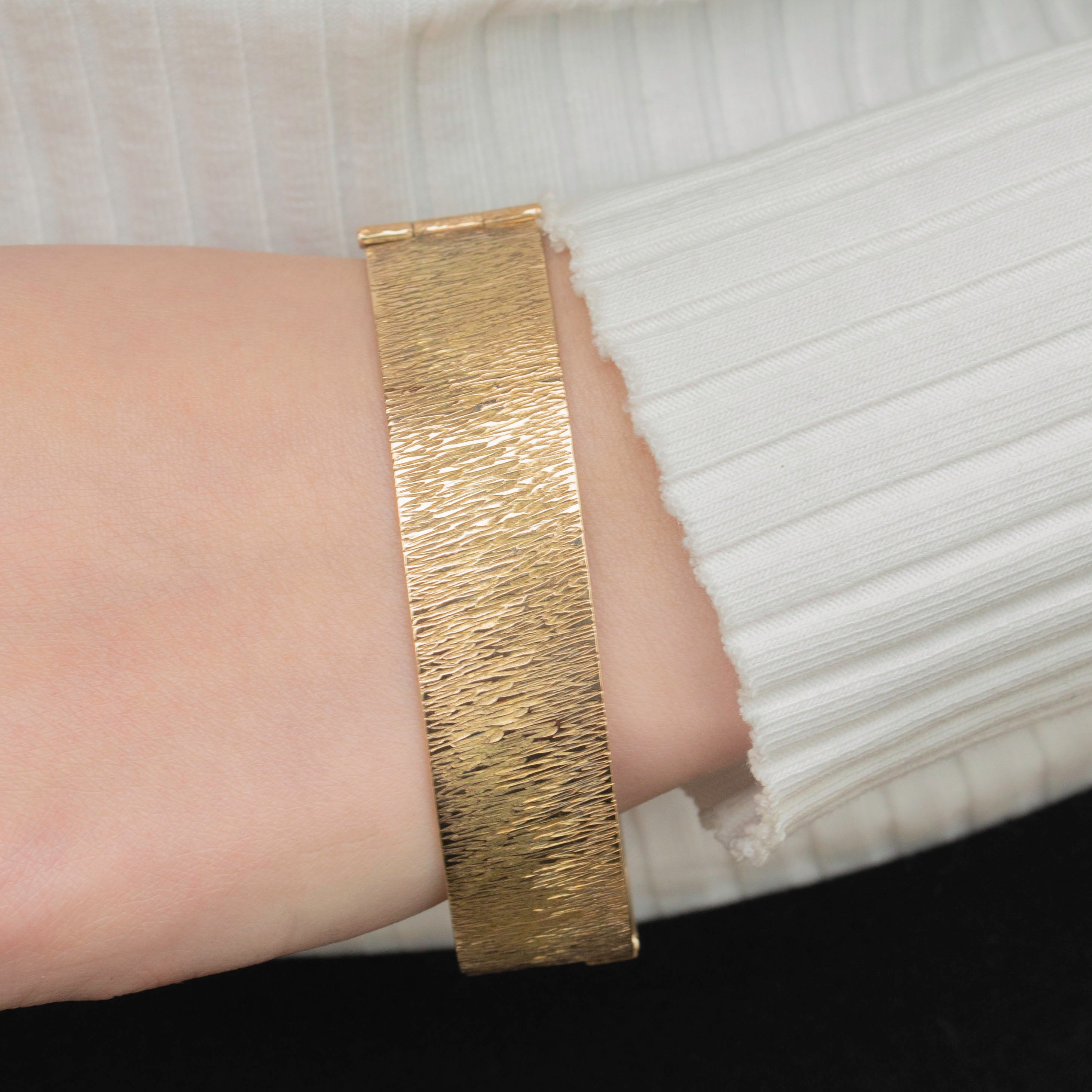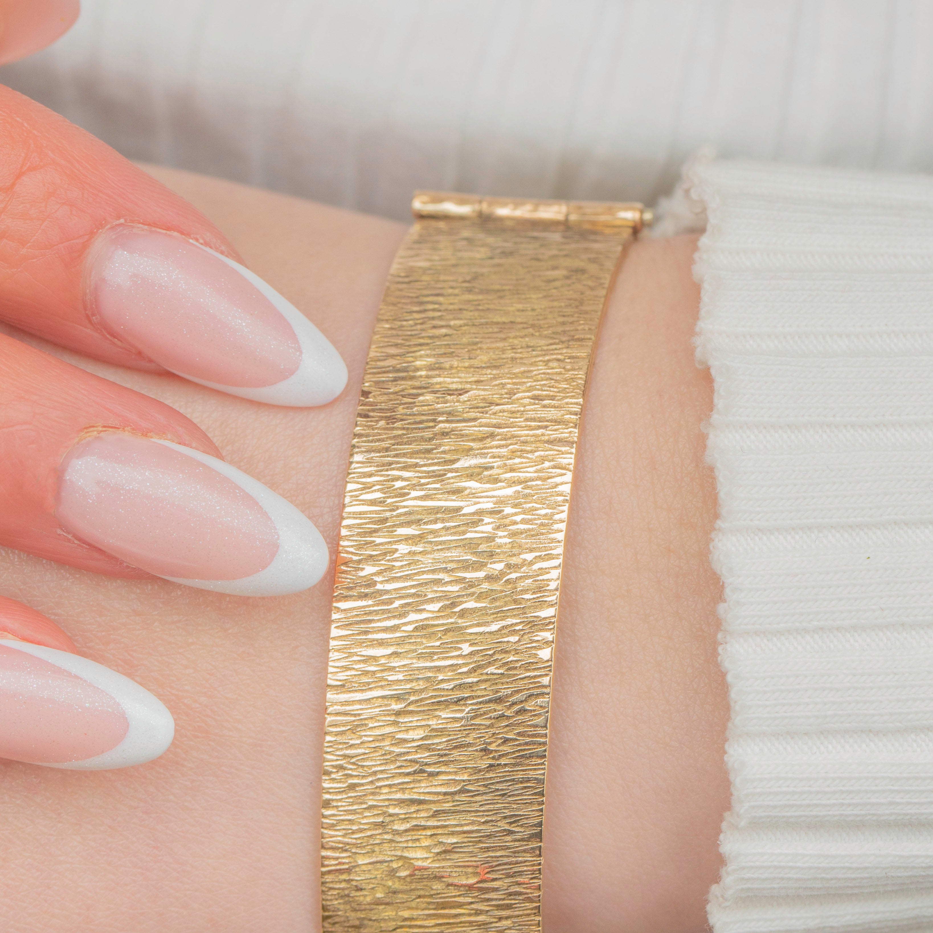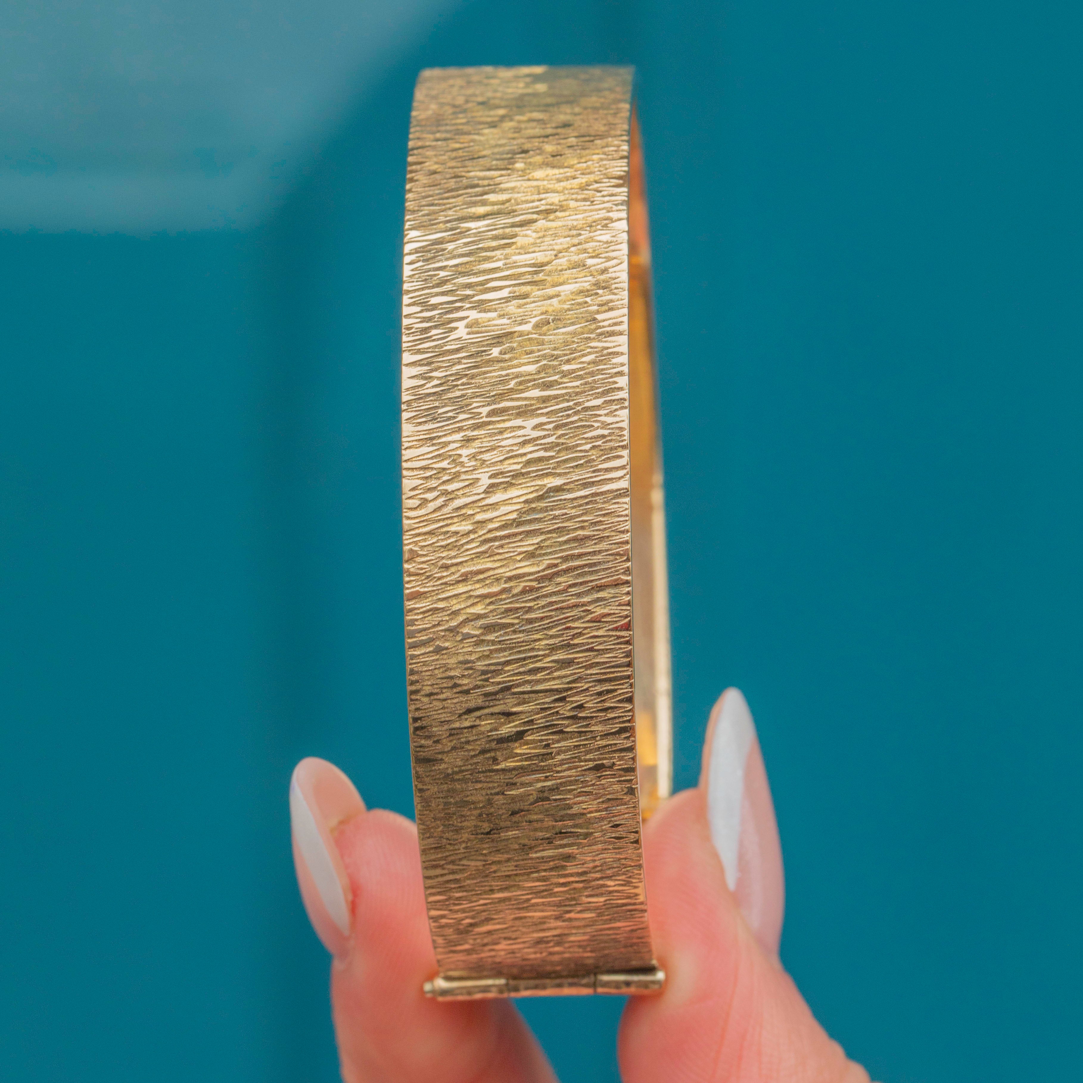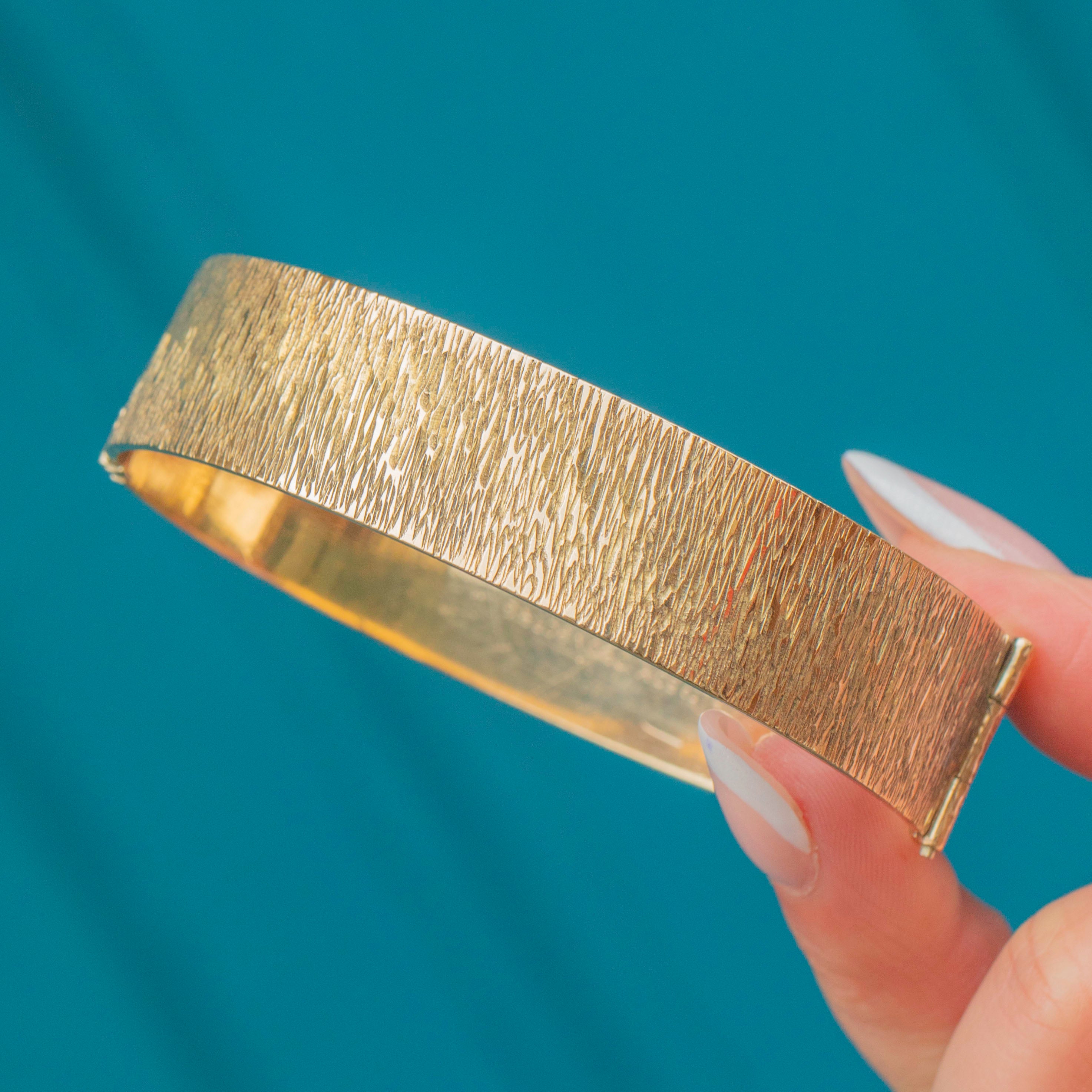 EXCELLENT: This 9ct Rolled Gold textured bangle is in excellent condition. The textured surface has remained defined and the rolled Gold shows no signs of wear. The bangle has kept its form well and closes securely, providing comfortable and confident wear!