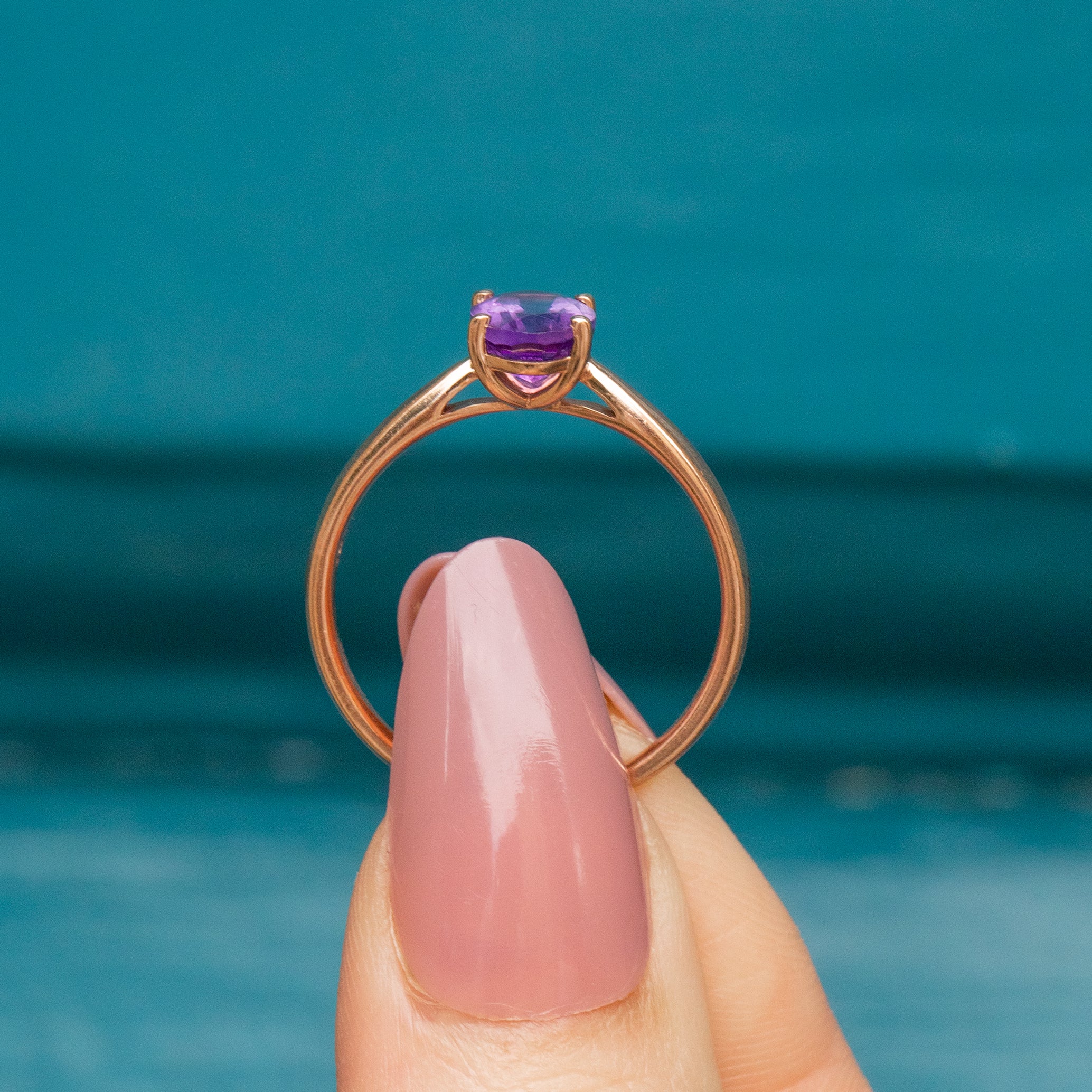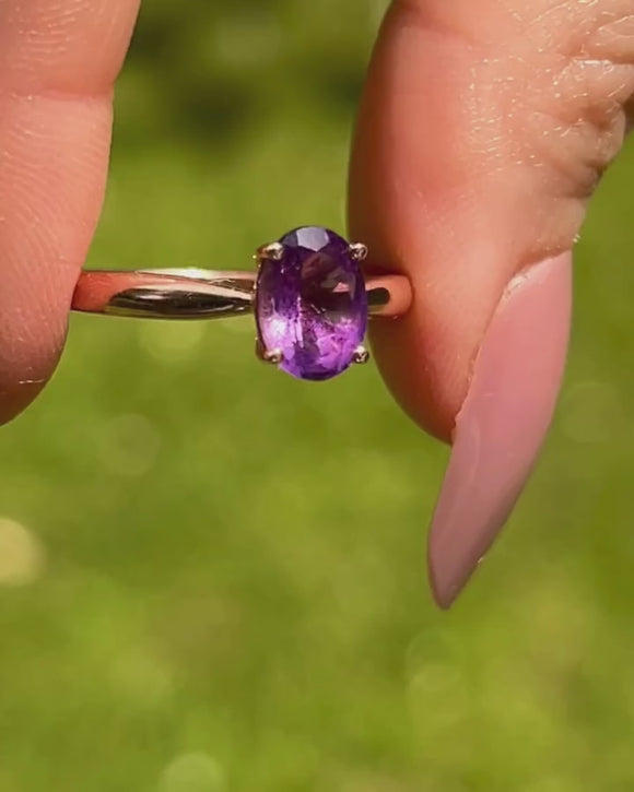 A beautiful 9ct Rose Gold Amethyst solitaire ring, boasting a regal allure! Her Amethyst possesses a gorgeous rich violet hue and rises proudly above the finger.