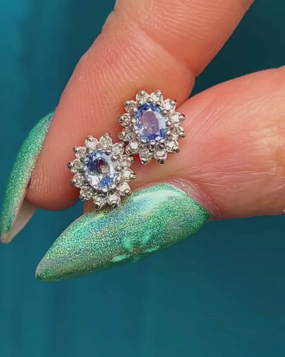 EXCELLENT. These 9ct White Gold Sapphire flower cluster stud earrings are in excellent condition. The gemstones are secure within their settings, and the overall form of the clusters are in tip-top shape. With securely soldered ear posts and tight-fitting butterfly backs, you can be sure these Sapphire Diamond earrings will sit securely in your lobes.