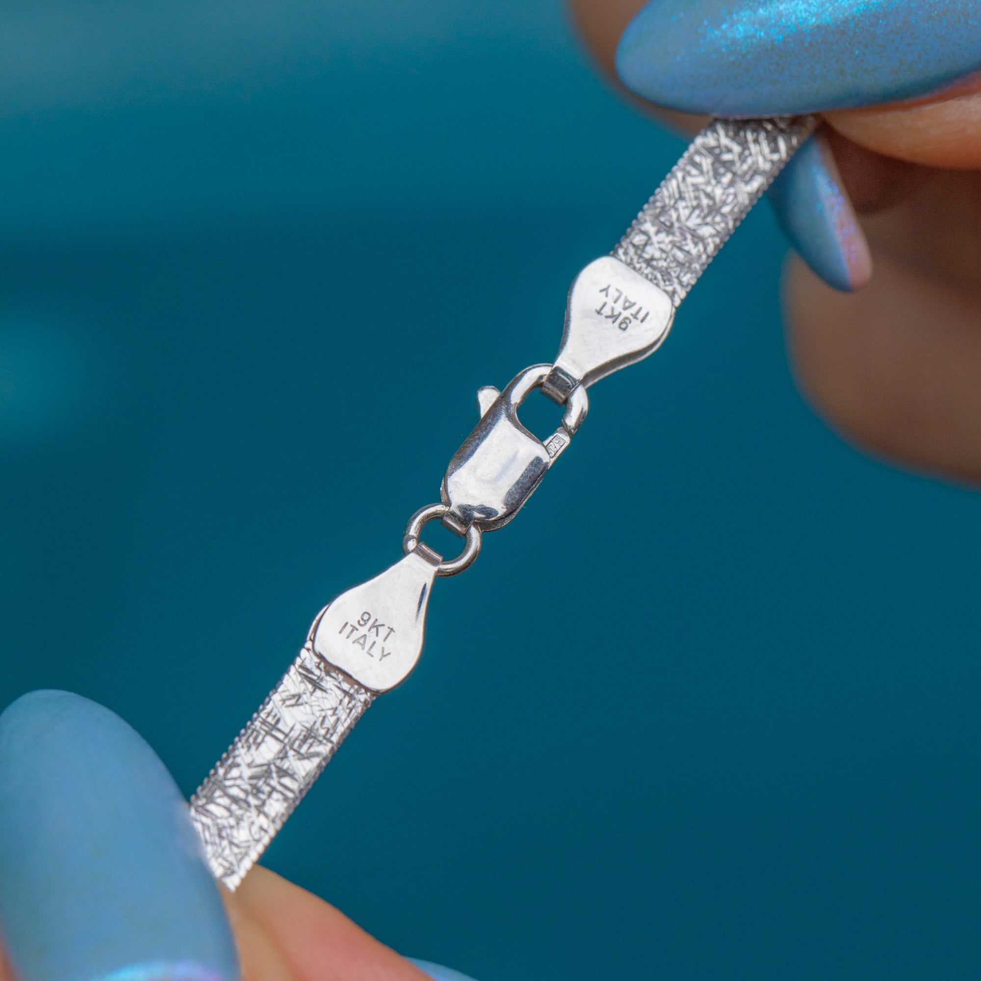 EXCELLENT. This 9ct White Gold textured chain is in excellent condition, with the herringbone links connected securely. The clasp is a great size, coming to you in perfect working order. This White Gold chain will quickly become a piece you can't live without.