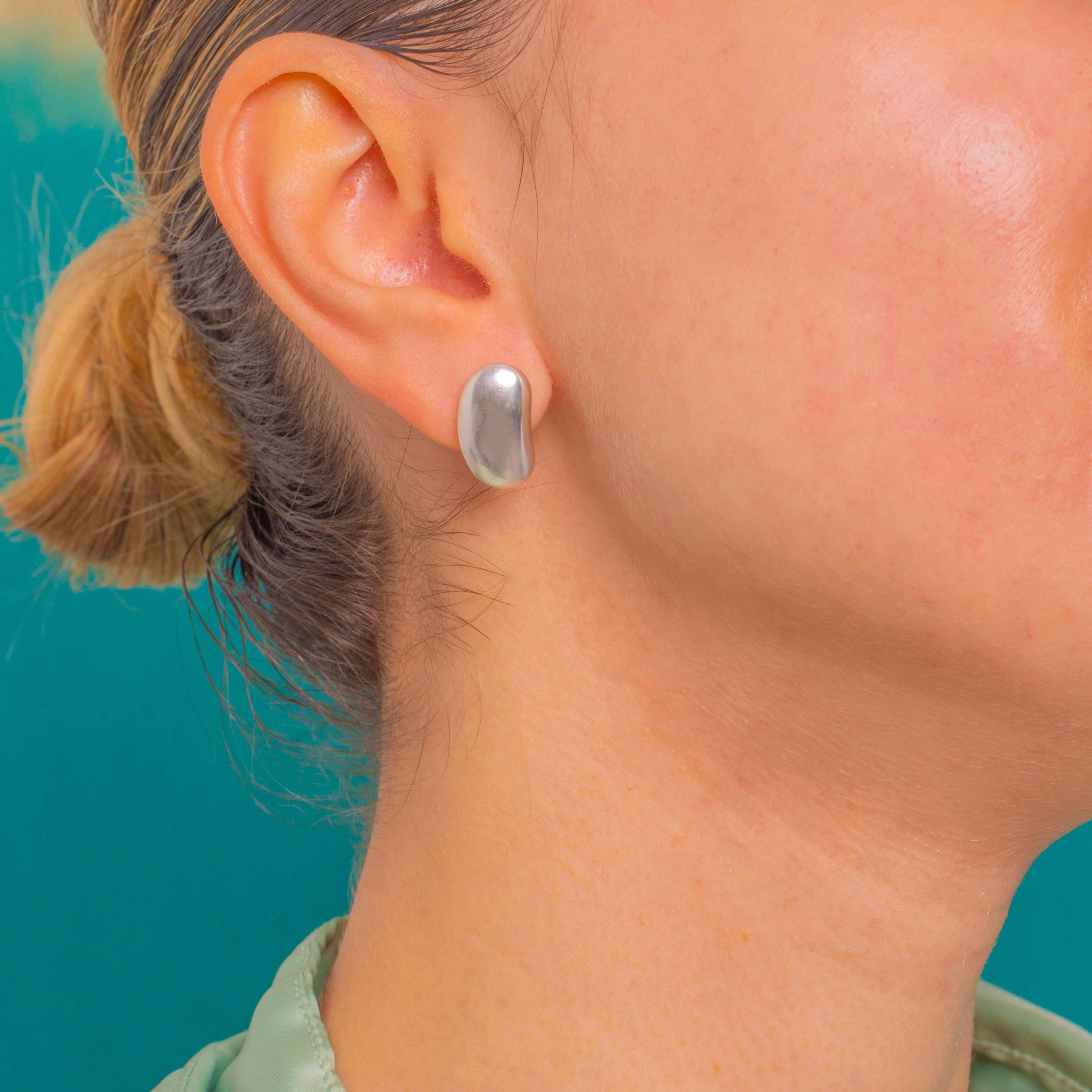 Sleek and sculptural, these Silver bean stud earrings offer a smooth, domed silhouette with a beautifully high-polish shine. Their organic, pebble-like curves create a softly bold statement that sits flush to the ear, with a seamless profile that feels effortless and refined.