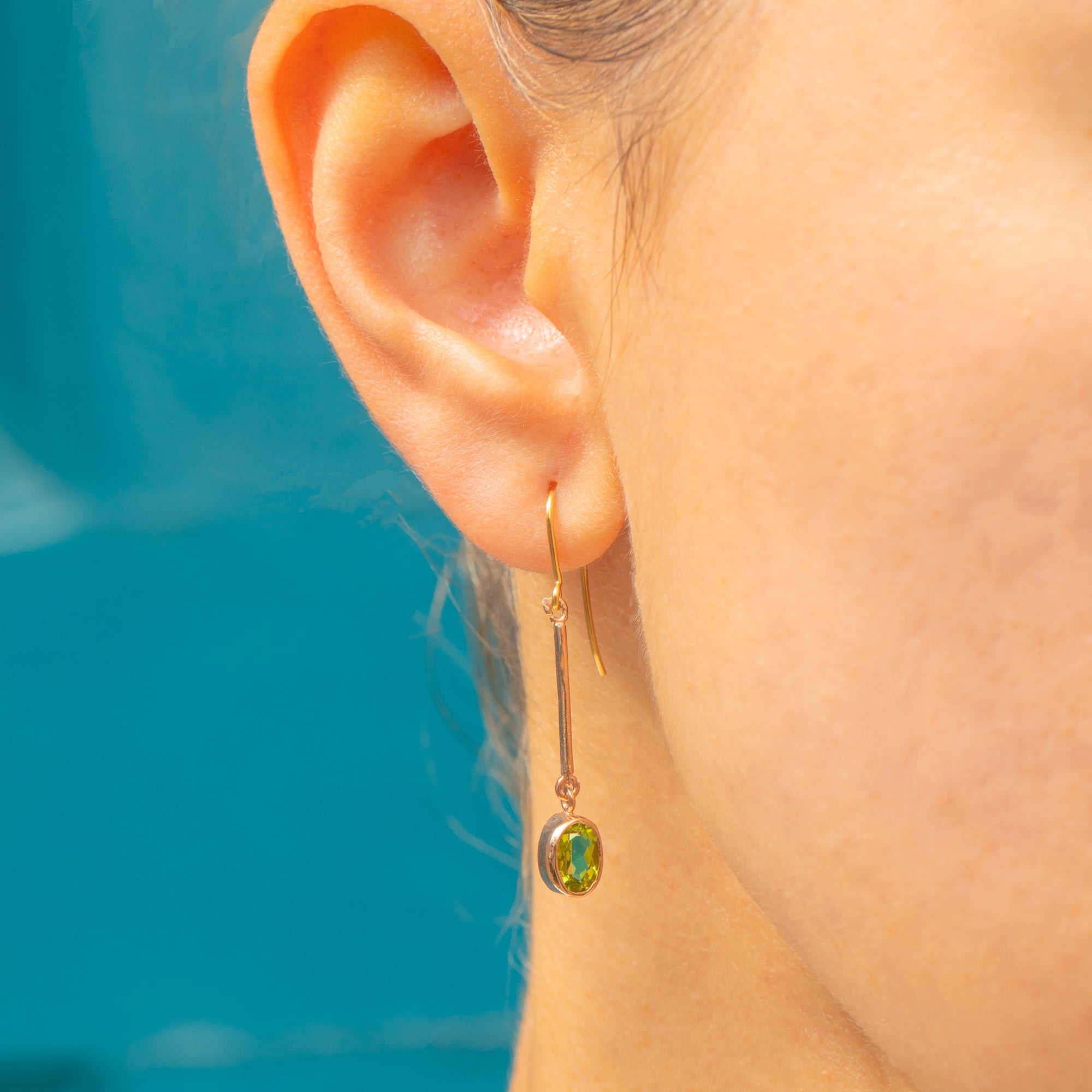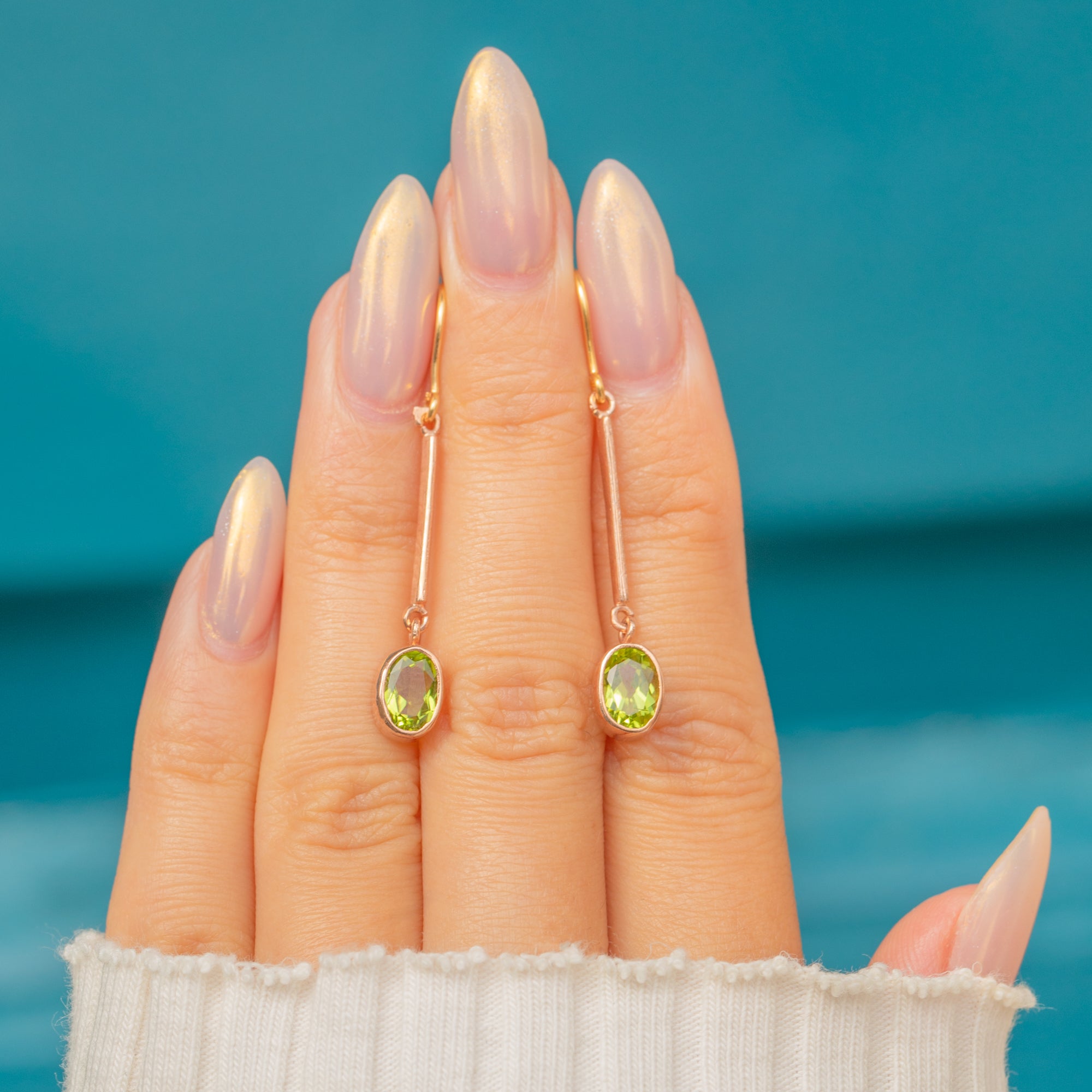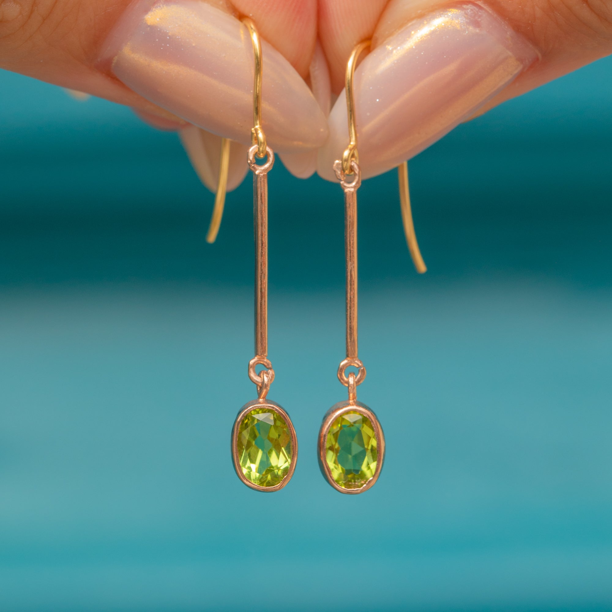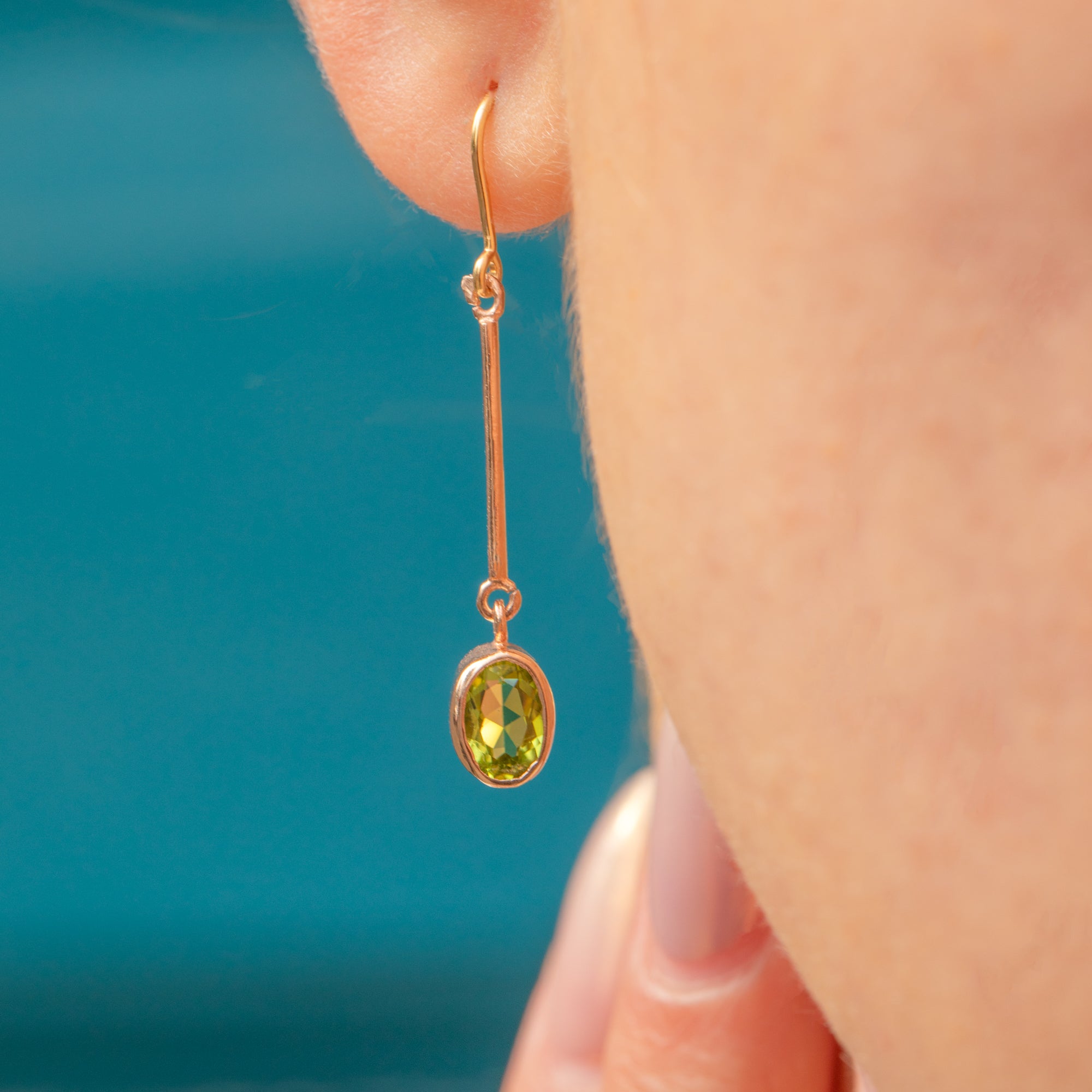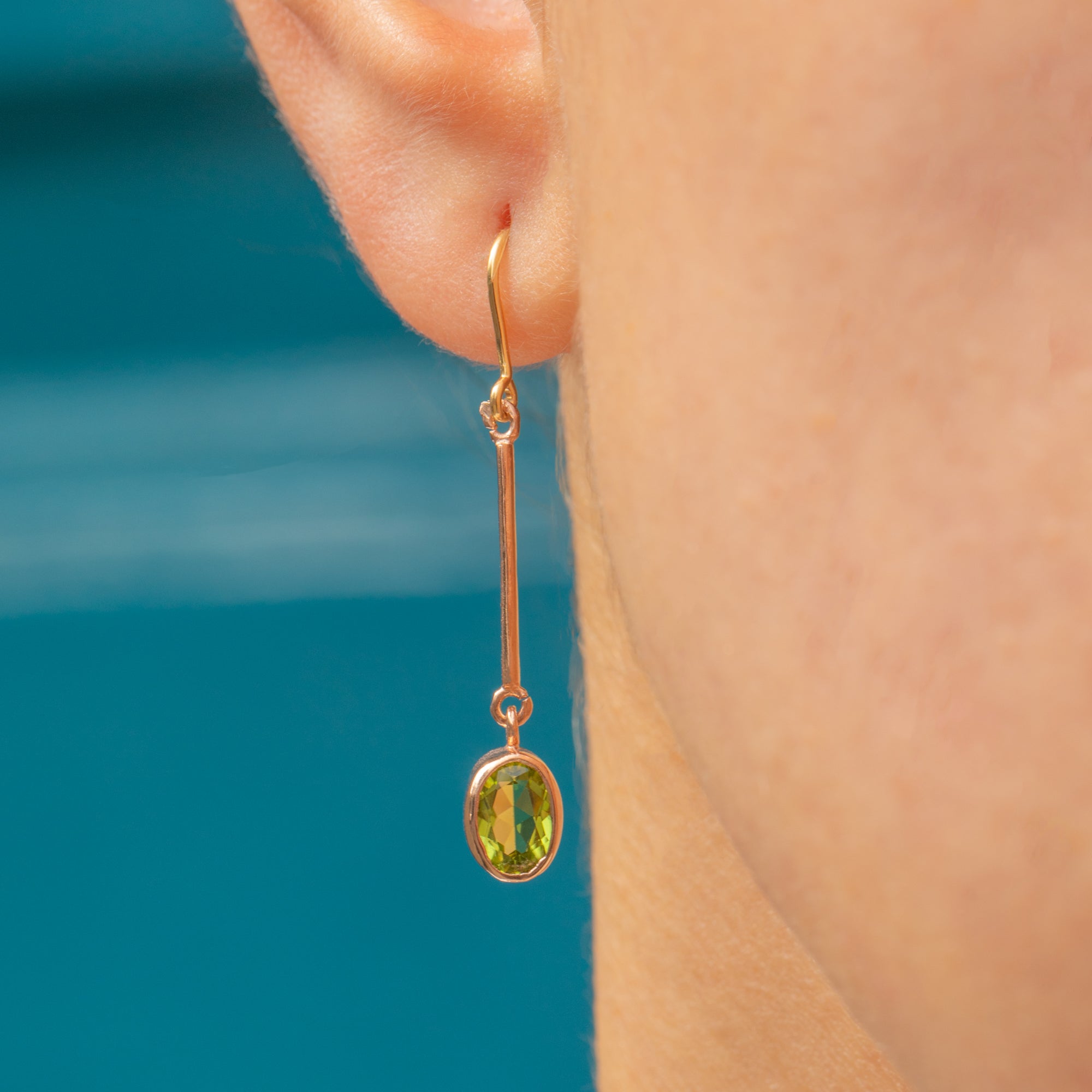 These elegant Edwardian drop earrings feature vibrant green Peridots suspended in minimalist bezel settings. Each oval Peridot displays a lively fresh hue, expertly cut to catch the light with every movement. Their elongated Gold bars create an elegant line that lengthens the profile, adding both refinement and subtle drama.
