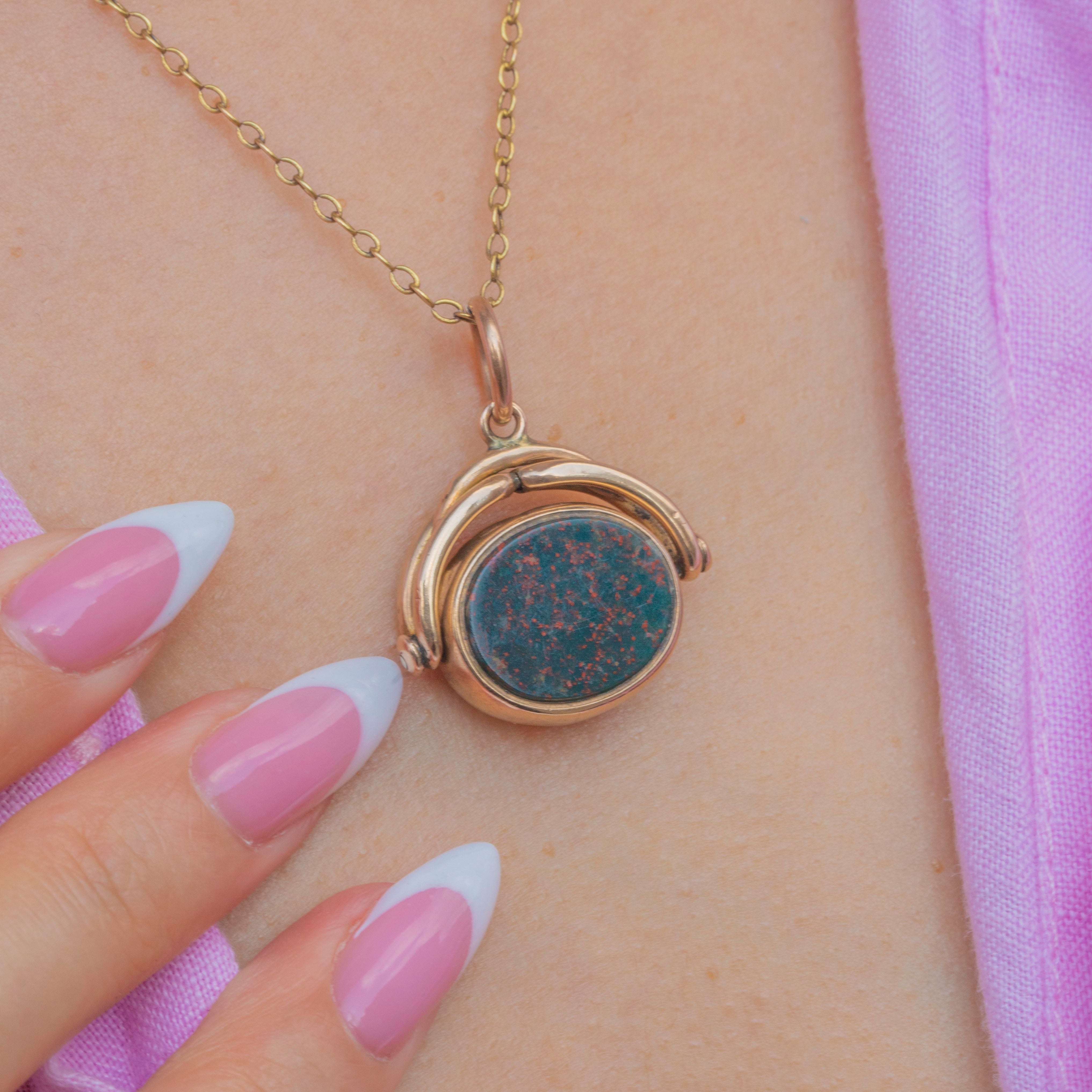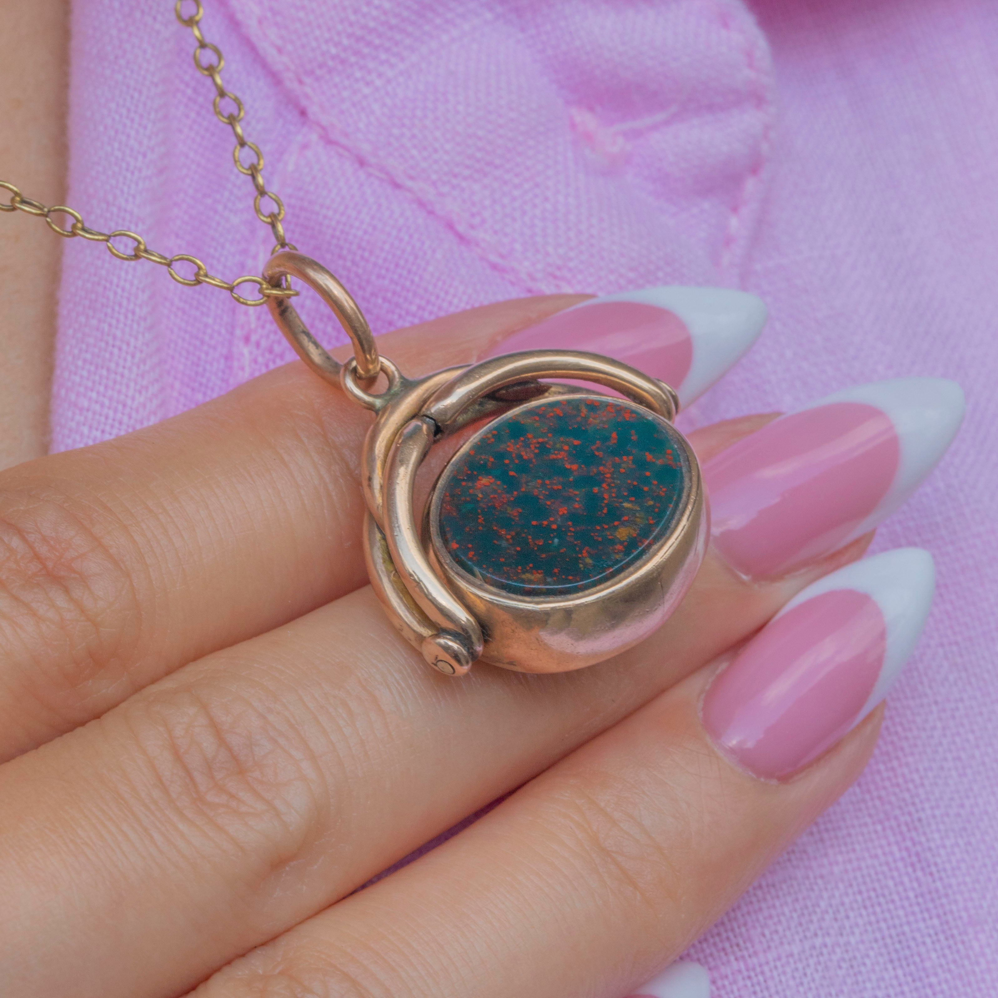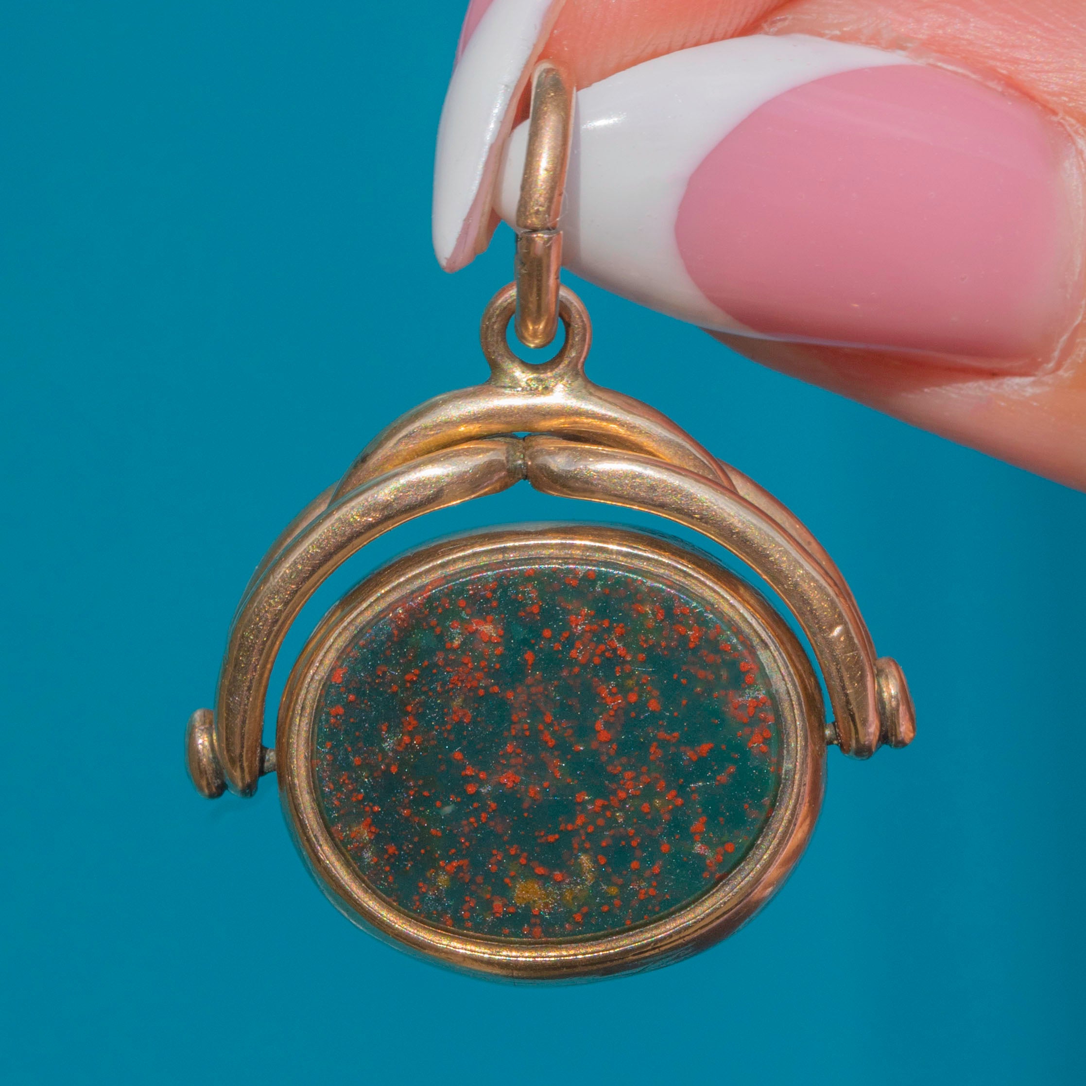 EXCELLENT: Both the Bloodstone and Sardonyx are in great condition, with no evident signs of scuffs or scratches. The Gold is bright and glossy and the jump ring is secure. With the spinner function in perfect working order, this fob pendant can be worn with utmost confidence.