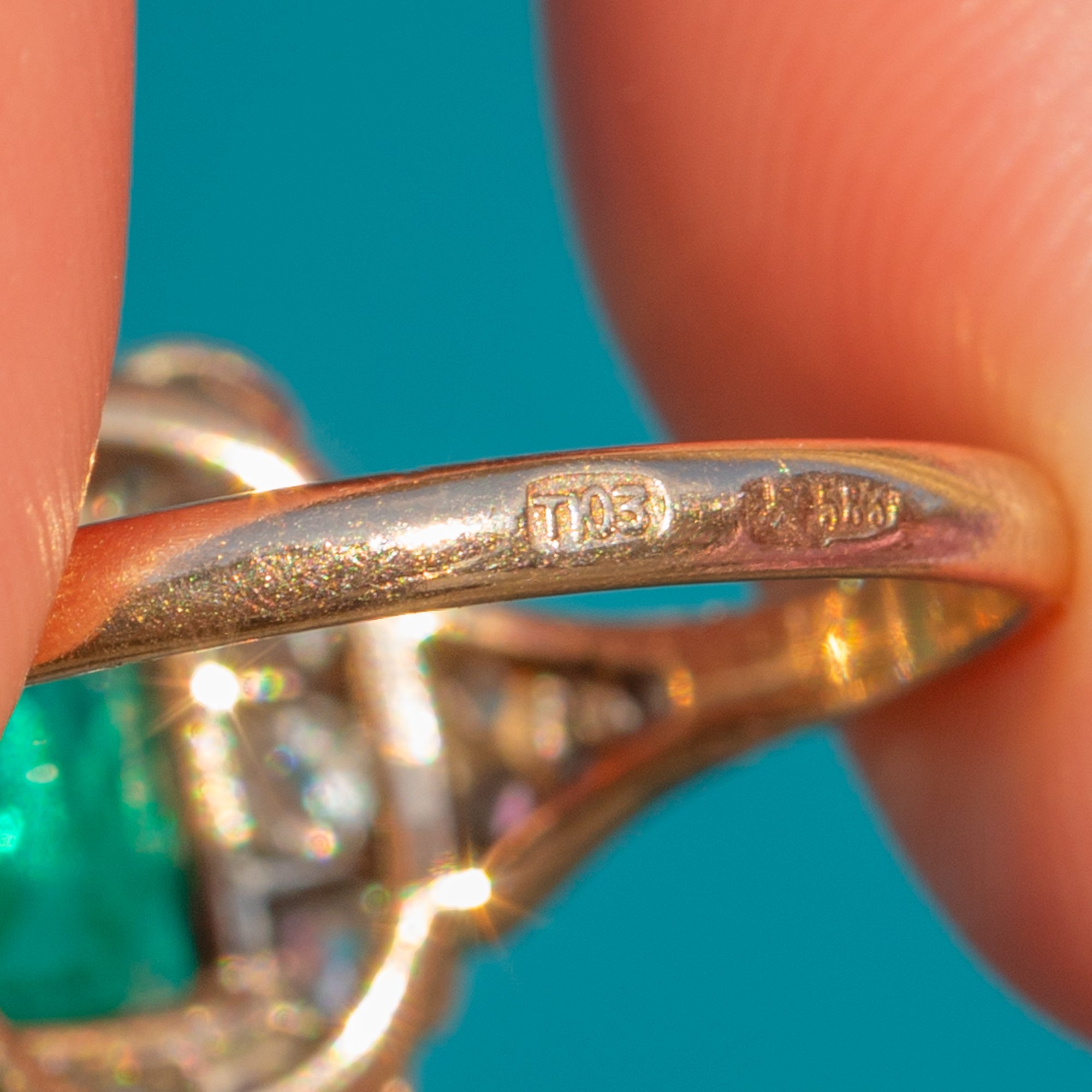 MATERIALS: Tests as 14ct Gold, 18ct White Gold settings, Emerald (0.70ct), Diamonds (0.66ct).