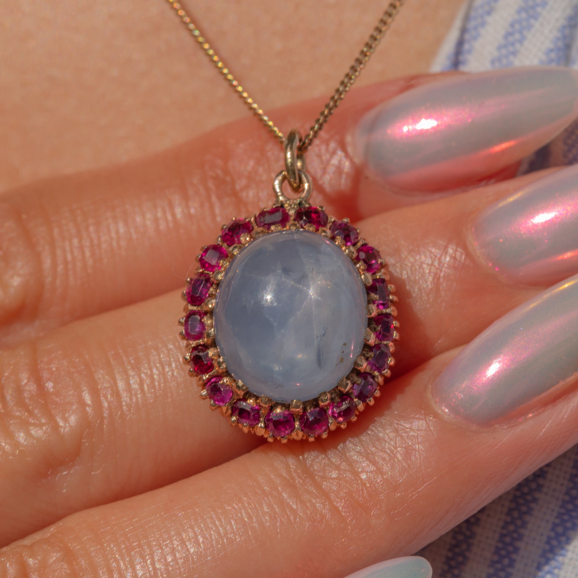 This antique 14ct Gold natural Star Sapphire Ruby cluster pendant is a sight to behold! This graceful Edwardian pendant features a luminous natural Star Sapphire, her silken asterism gently shimmering across the surface like moonlight reflected in water. Encircling the central gem is a vivid halo of Rubies, their deep pink-red tones offering a beautiful contrast and enhancing the Sapphire’s mysterious, ethereal glow.