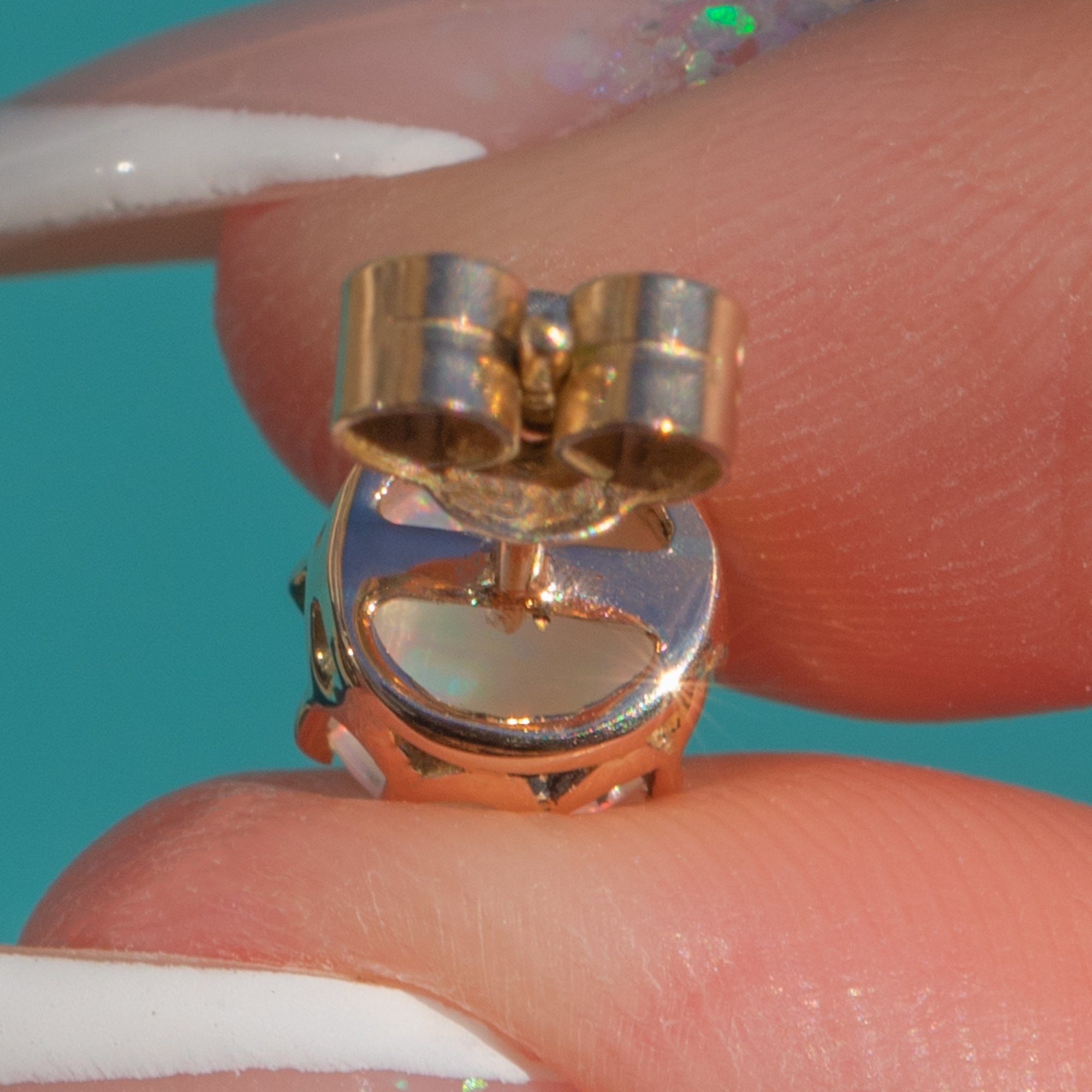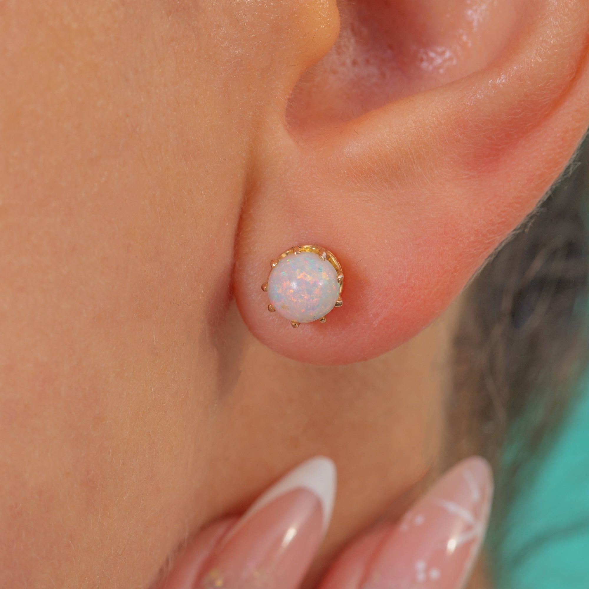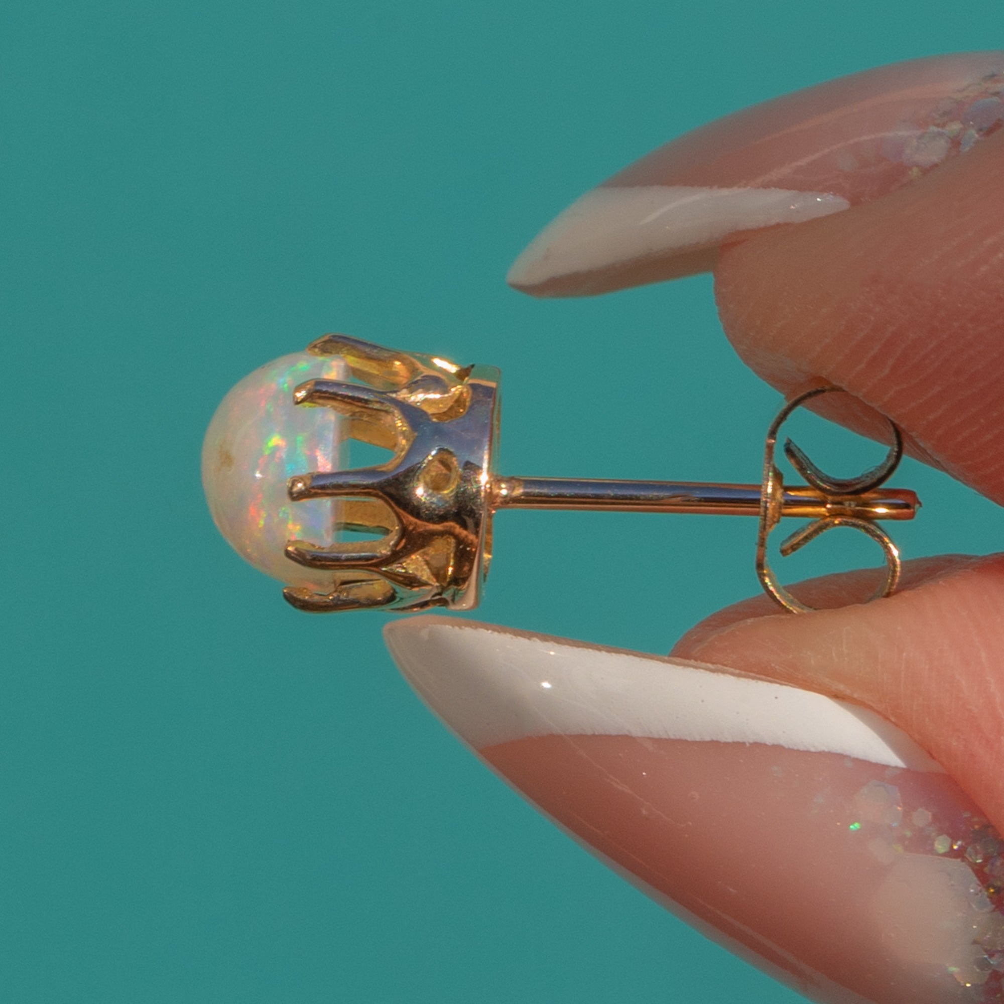 Luminous and full of colour-play, these Victorian Opal studs glow with soft pastels and flashes of neon fire in the light. Each cabochon sits proudly in a 15ct Gold crown setting, creating a timeless silhouette with a touch of antique romance.