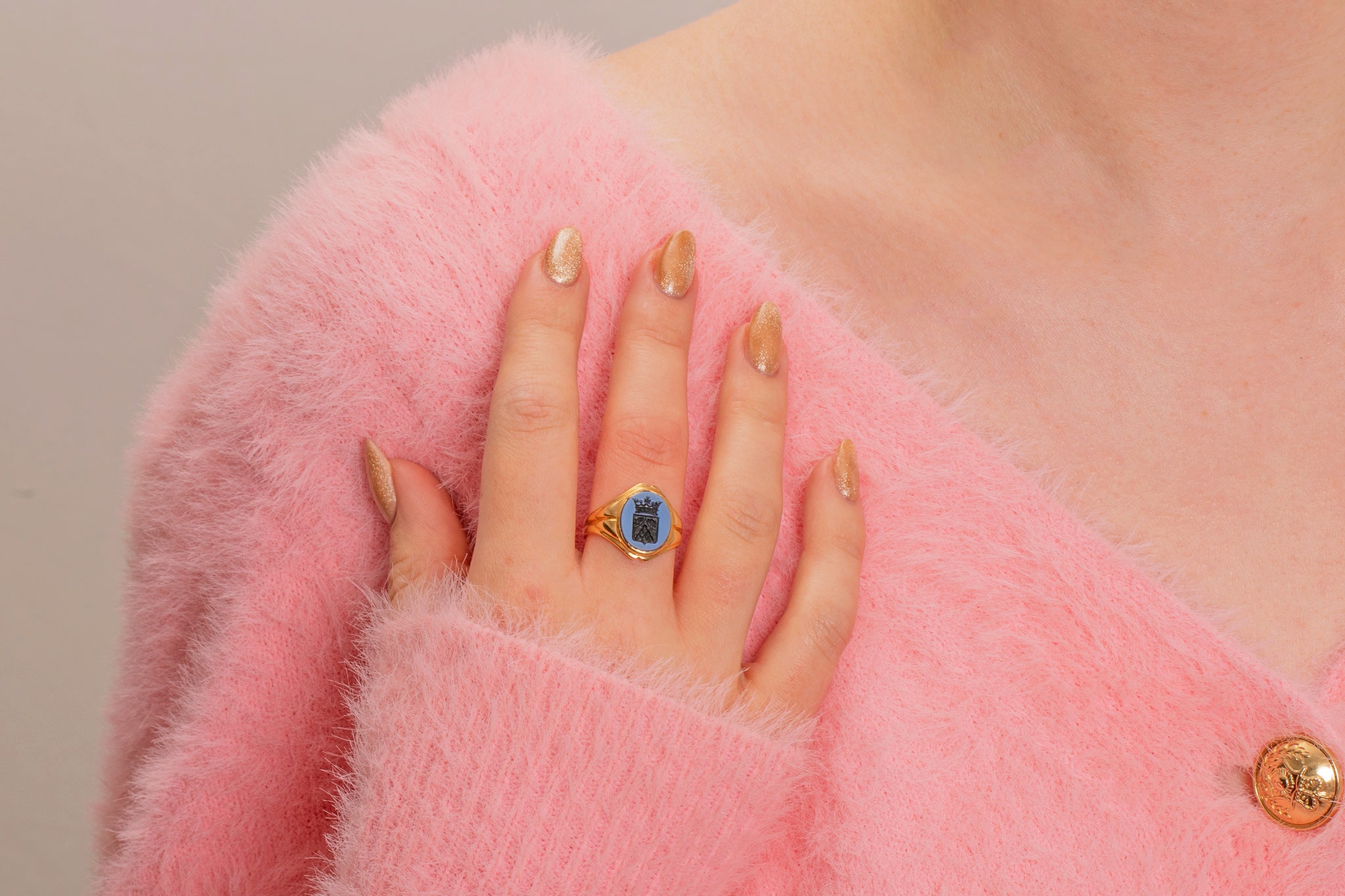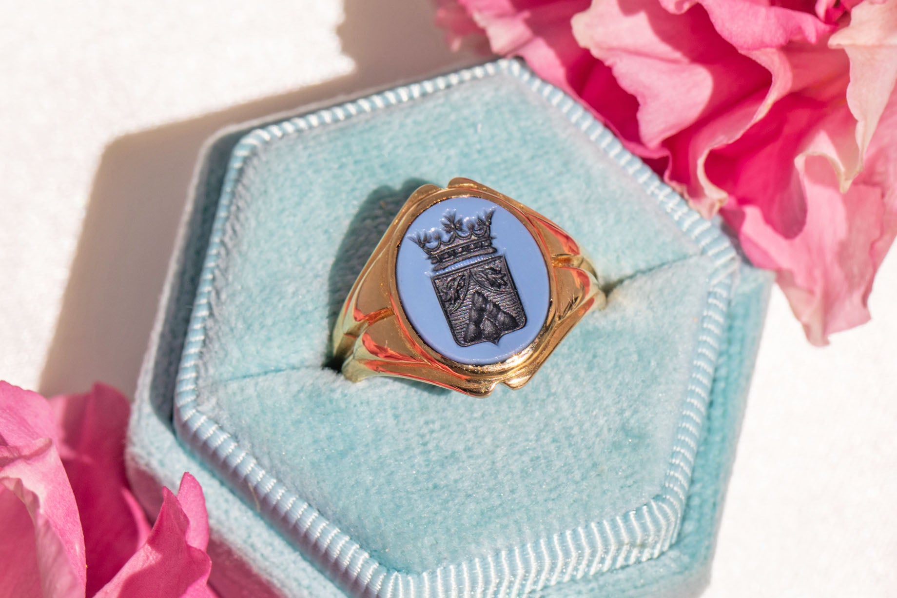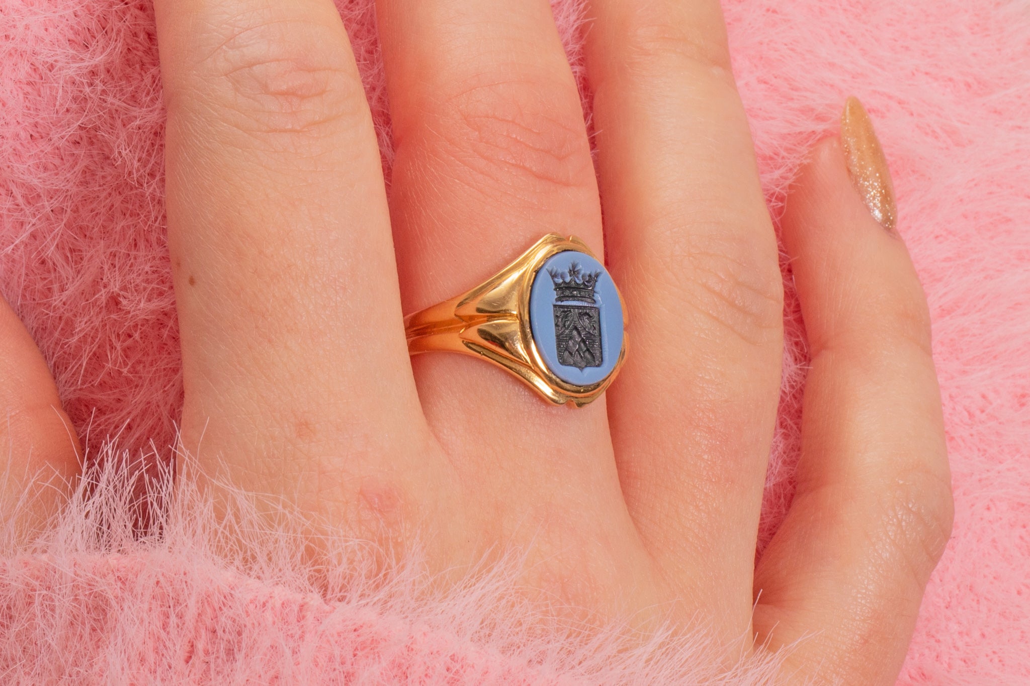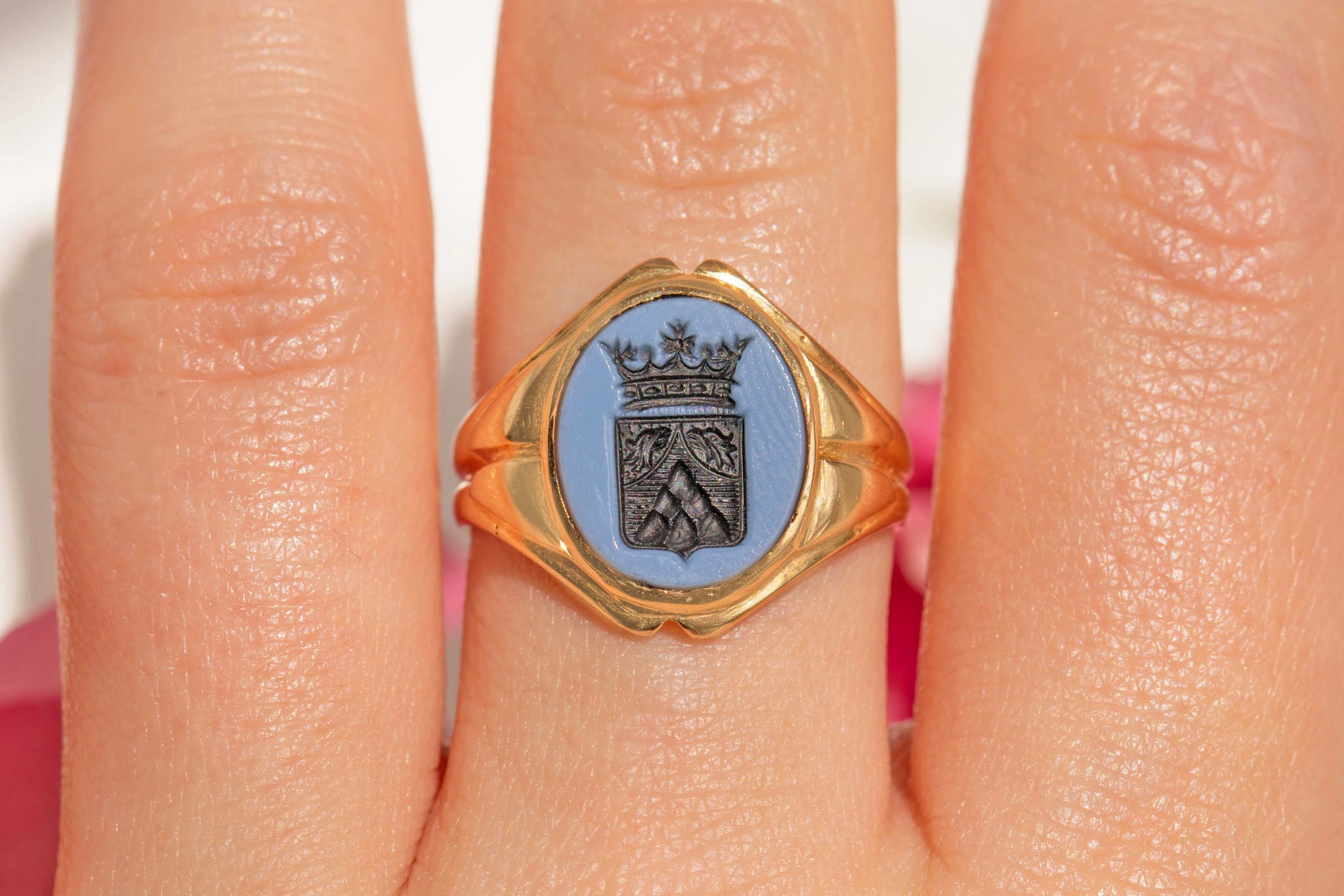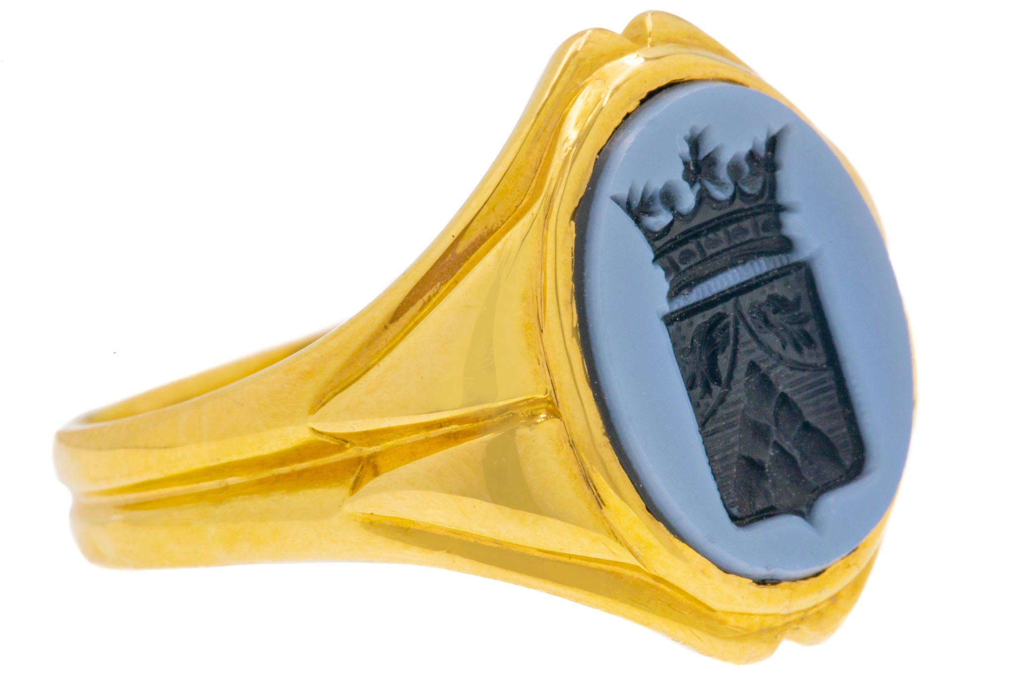 Her antique signet ring head is composed of a flint grey banded Agate with a royal heraldic intaglio carved into her hard stone, revealing her charcoal black colour underneath. We believe this would have been a family heirloom, with their family crest engraved into her Agate. A truly remarkable piece rich with history!