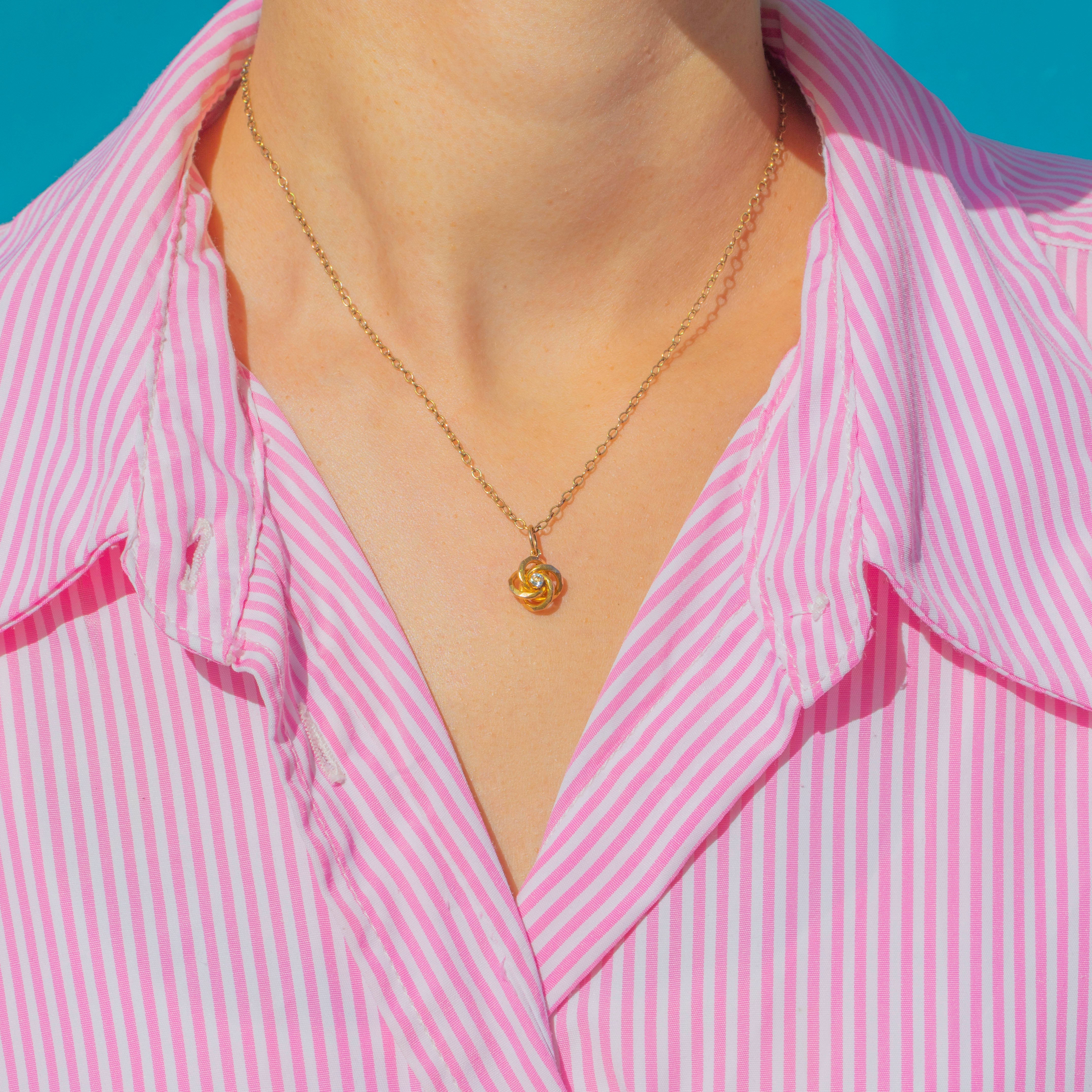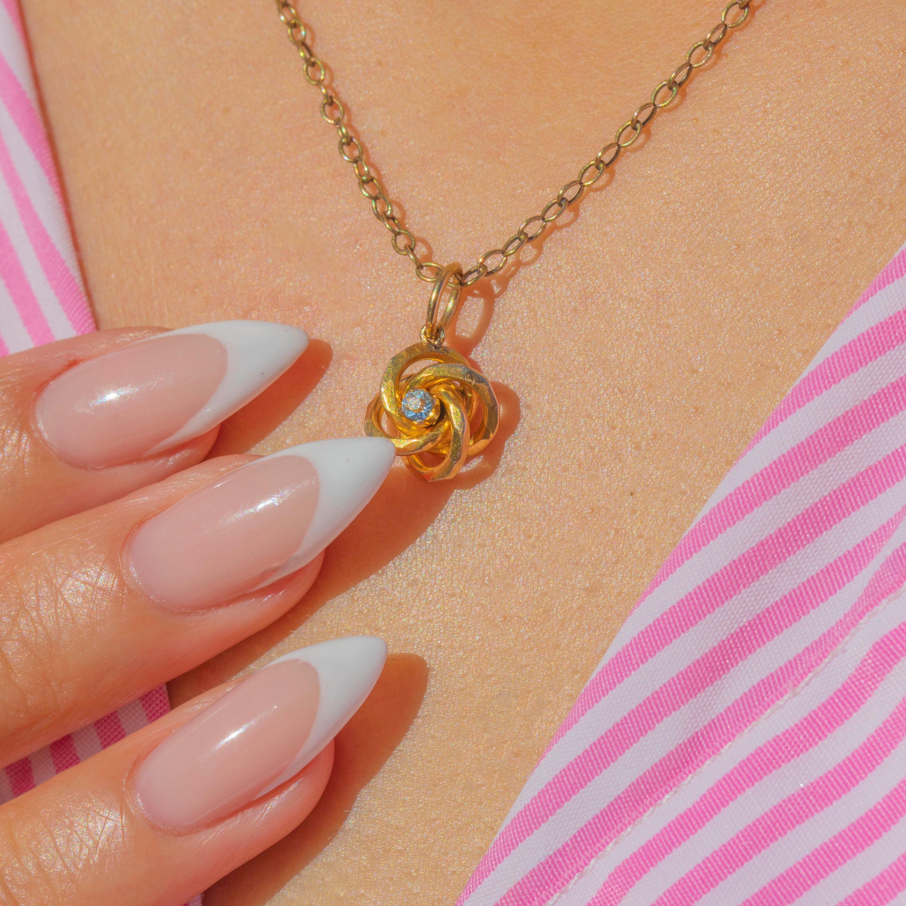 This Antique Victorian charm is crafted in 15ct Gold and modelled in a classic knot motif, symbolising unity and eternal love. At its centre sits a sparkling pale blue Aquamarine, adding a delicate touch of colour to the warm golden tones.