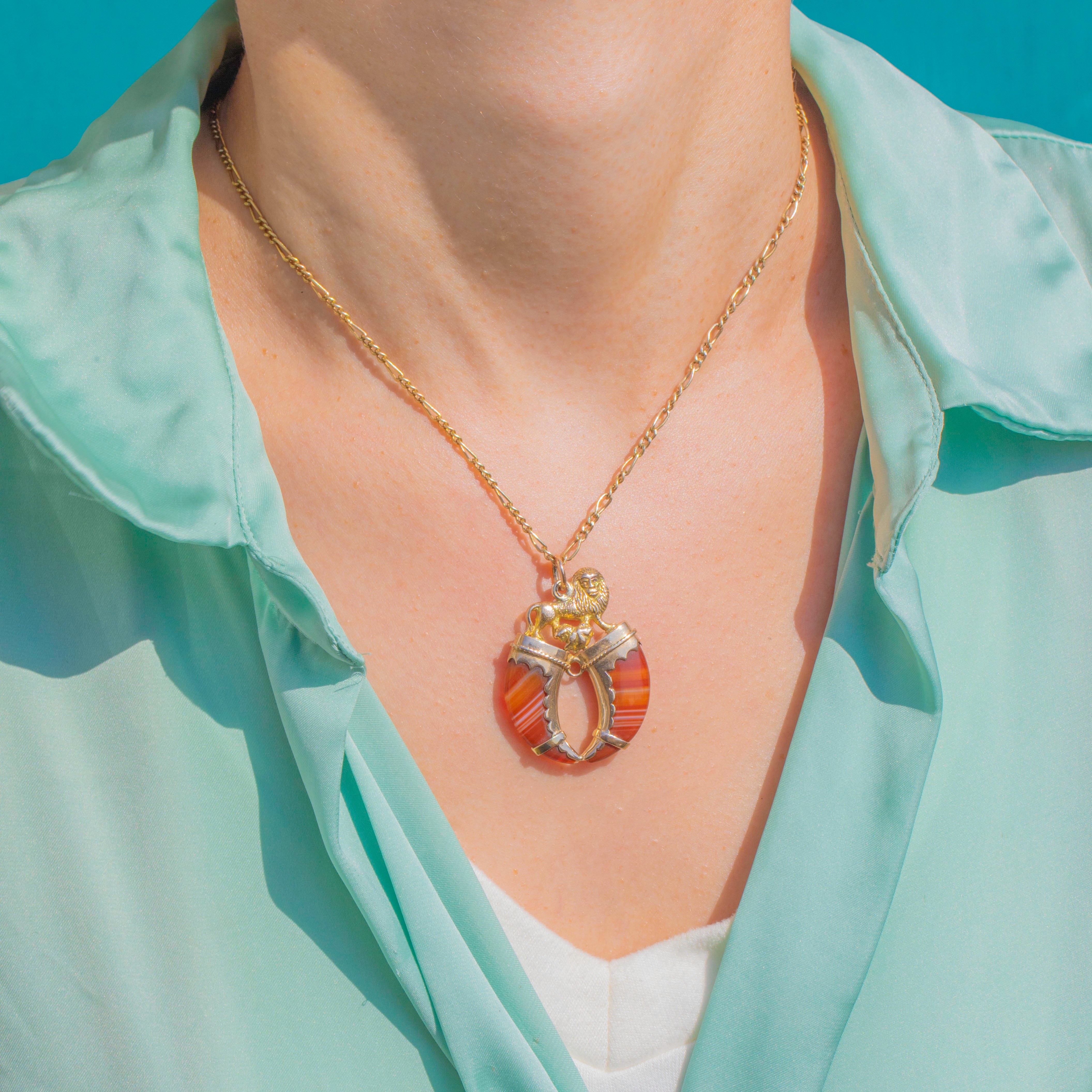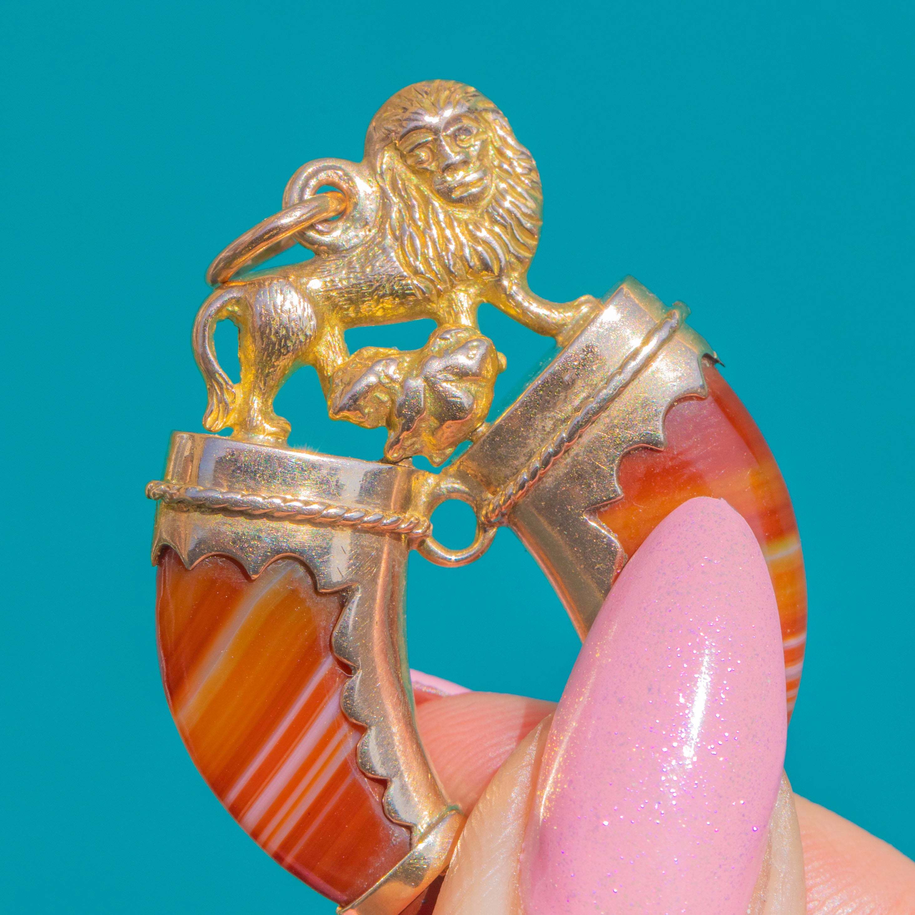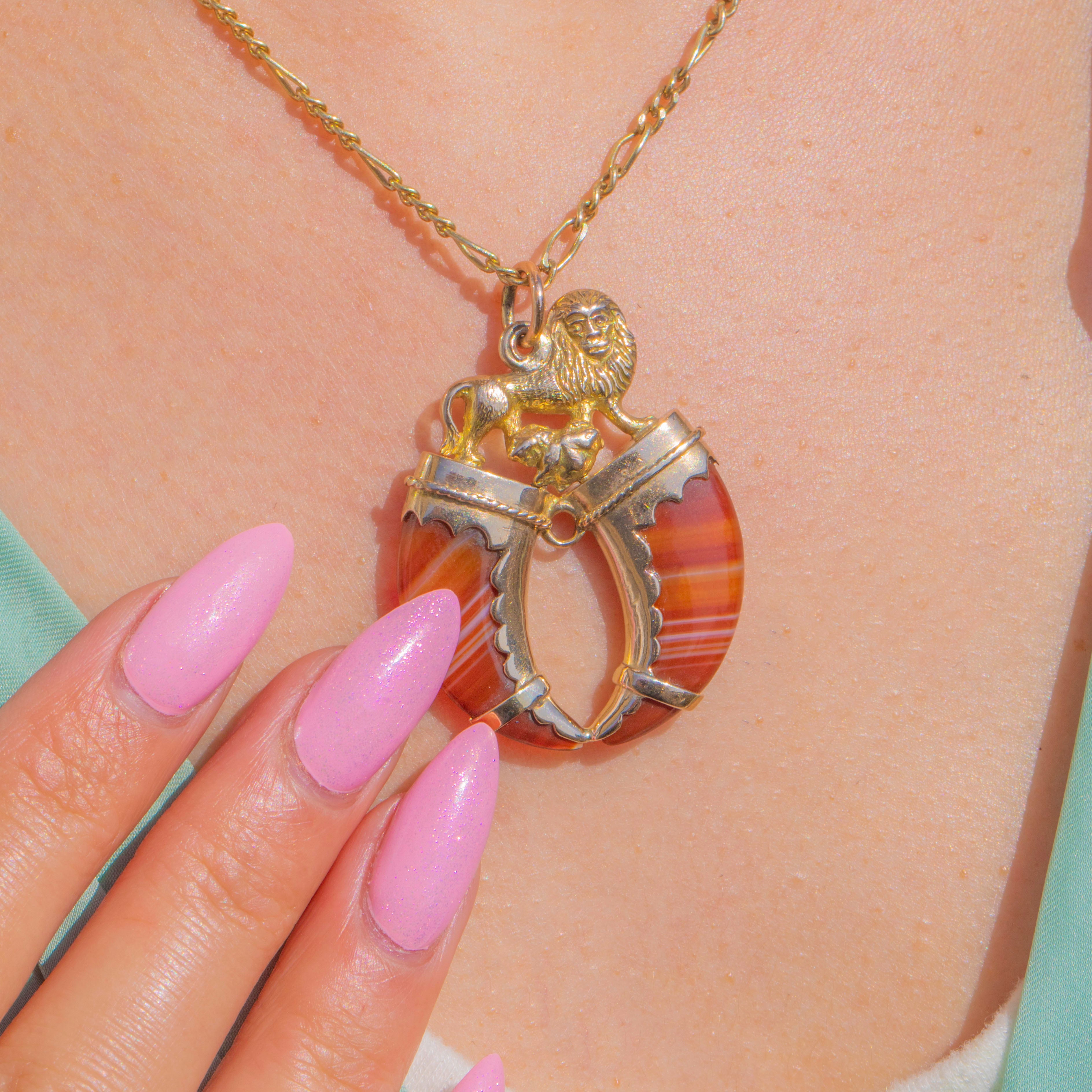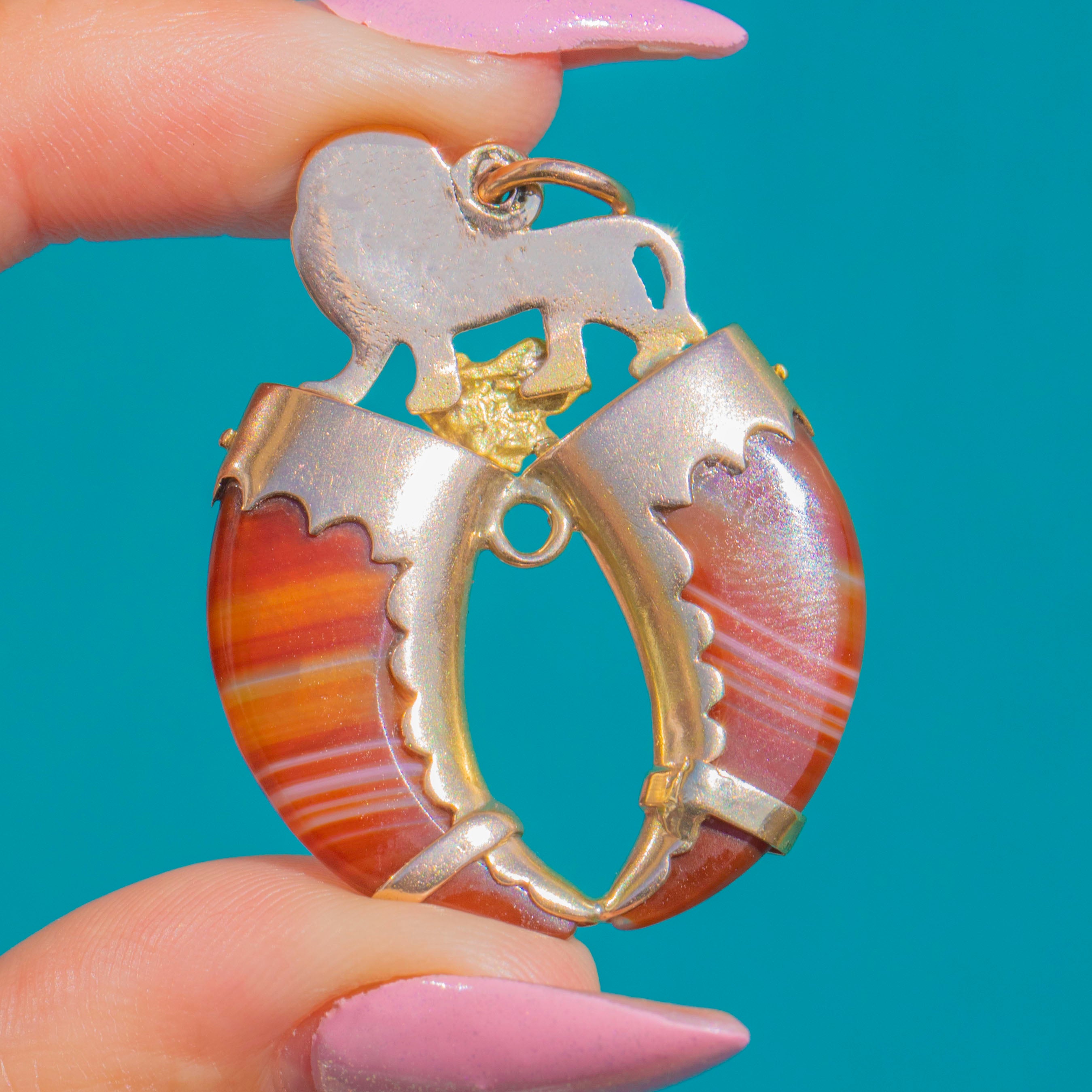 A striking Victorian double talon pendant, richly crafted in 15ct Gold and set with two polished banded Agates in warm caramel-to-russet tones. The mirrored “talon” lobes are framed by scalloped bezels with delicate rope-edge detailing, their natural cream and toffee striations lending wonderful movement and depth.