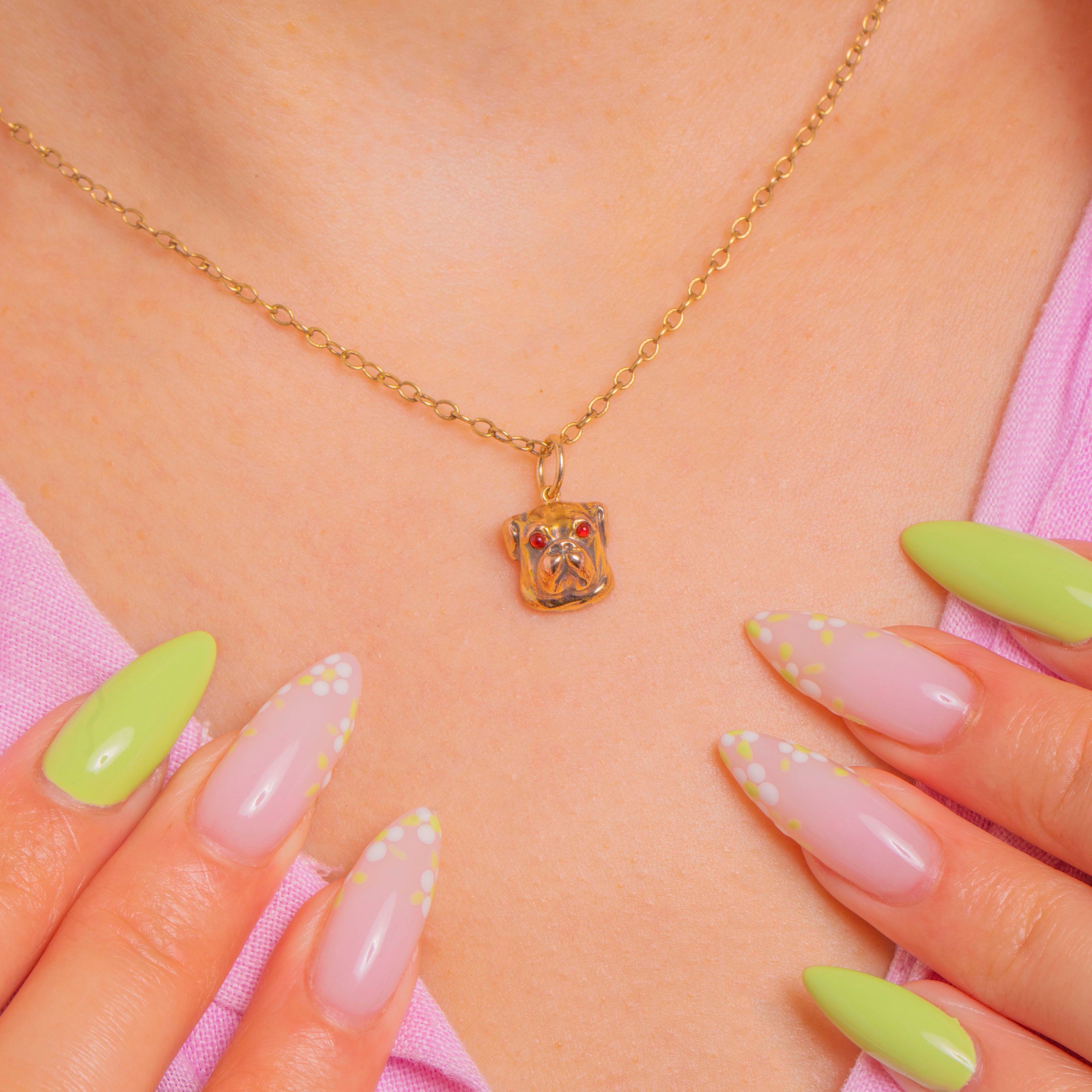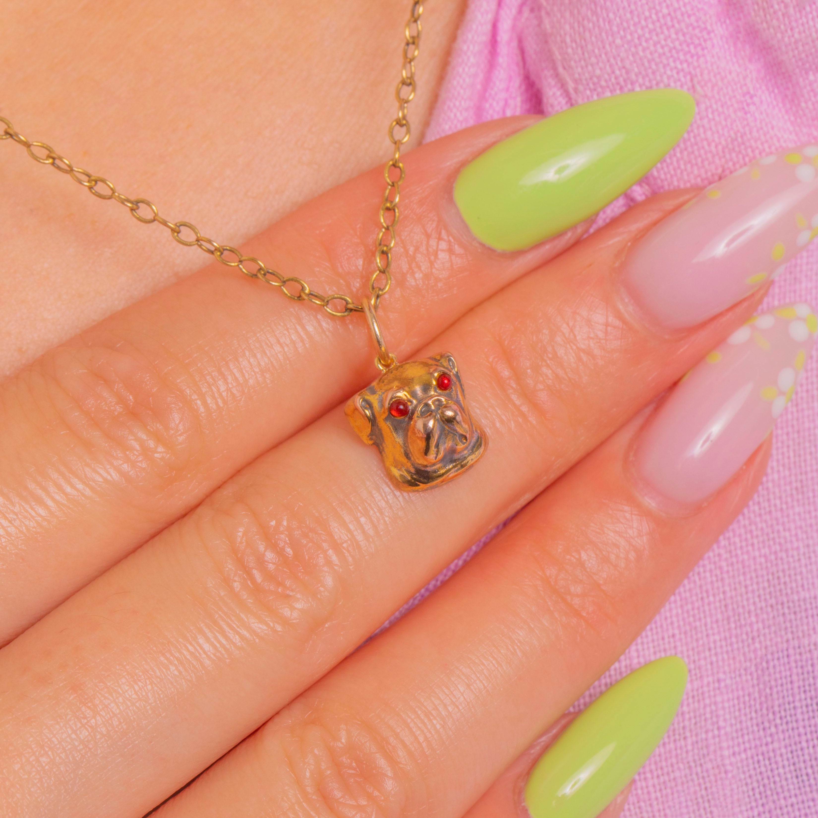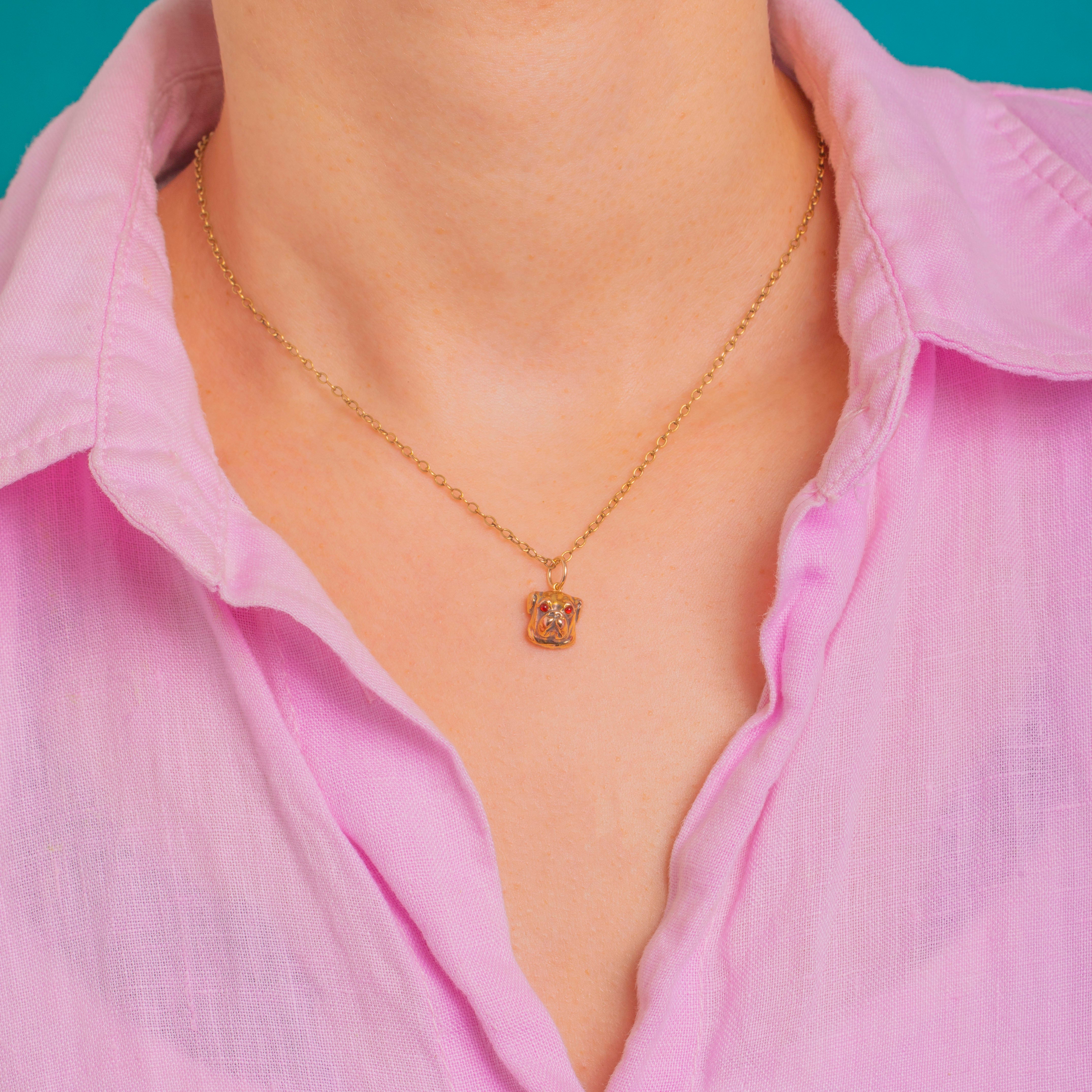 A charming Victorian English Bulldog head rendered in luscious 15ct Gold, modelled in the round with beautifully defined wrinkles and muzzle. Two tiny red Paste cabochon eyes animate the expression, their subtle glow a playful contrast to the buttery Gold.