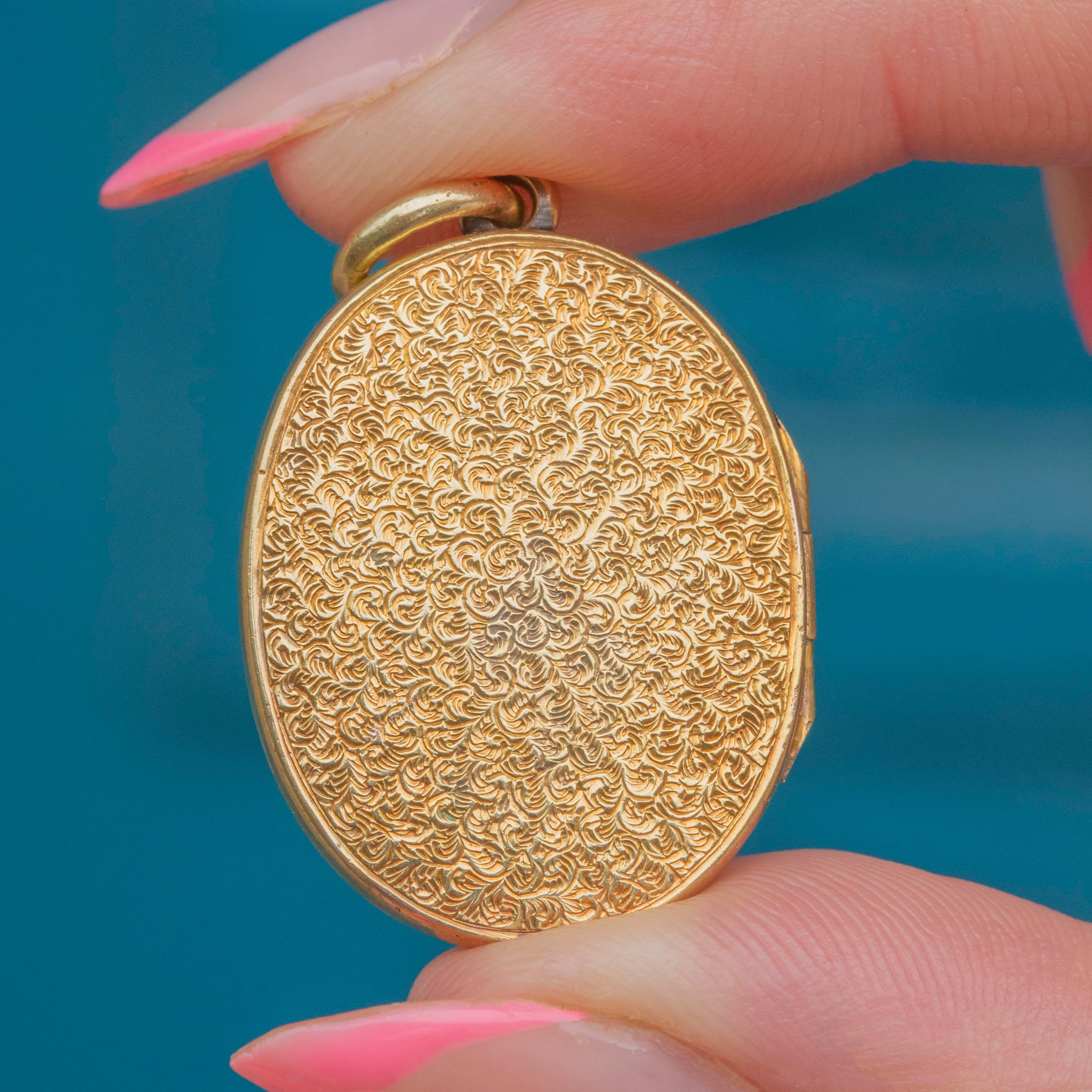 The locket is crafted from solid 15ct Gold and boasts intricately engraved details that span across both sides. The impressive cross, formed of lively Opals, makes a striking focal point for the front of the locket, their ethereal, shimmering hues enhanced by a bold line of royal blue Enamel.
