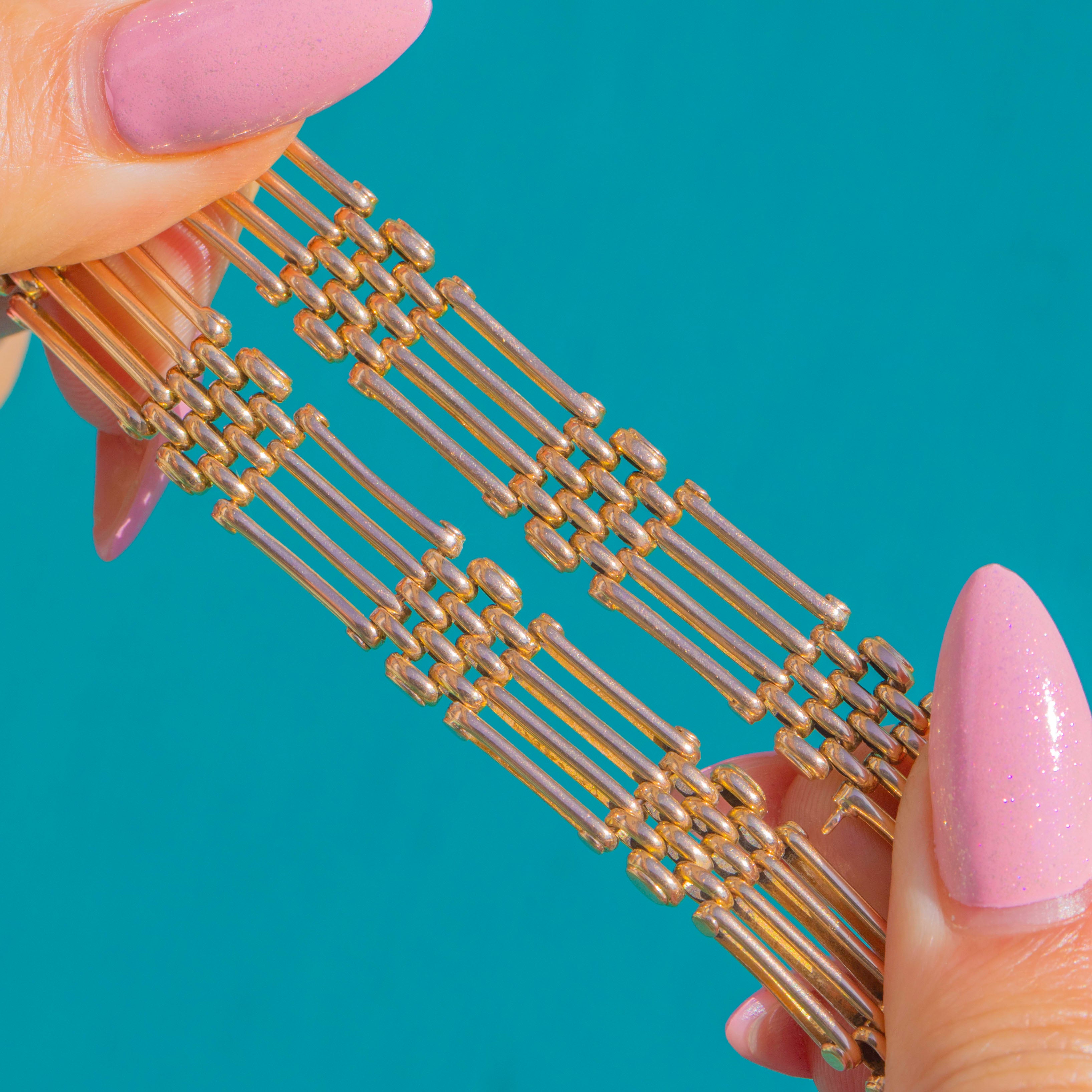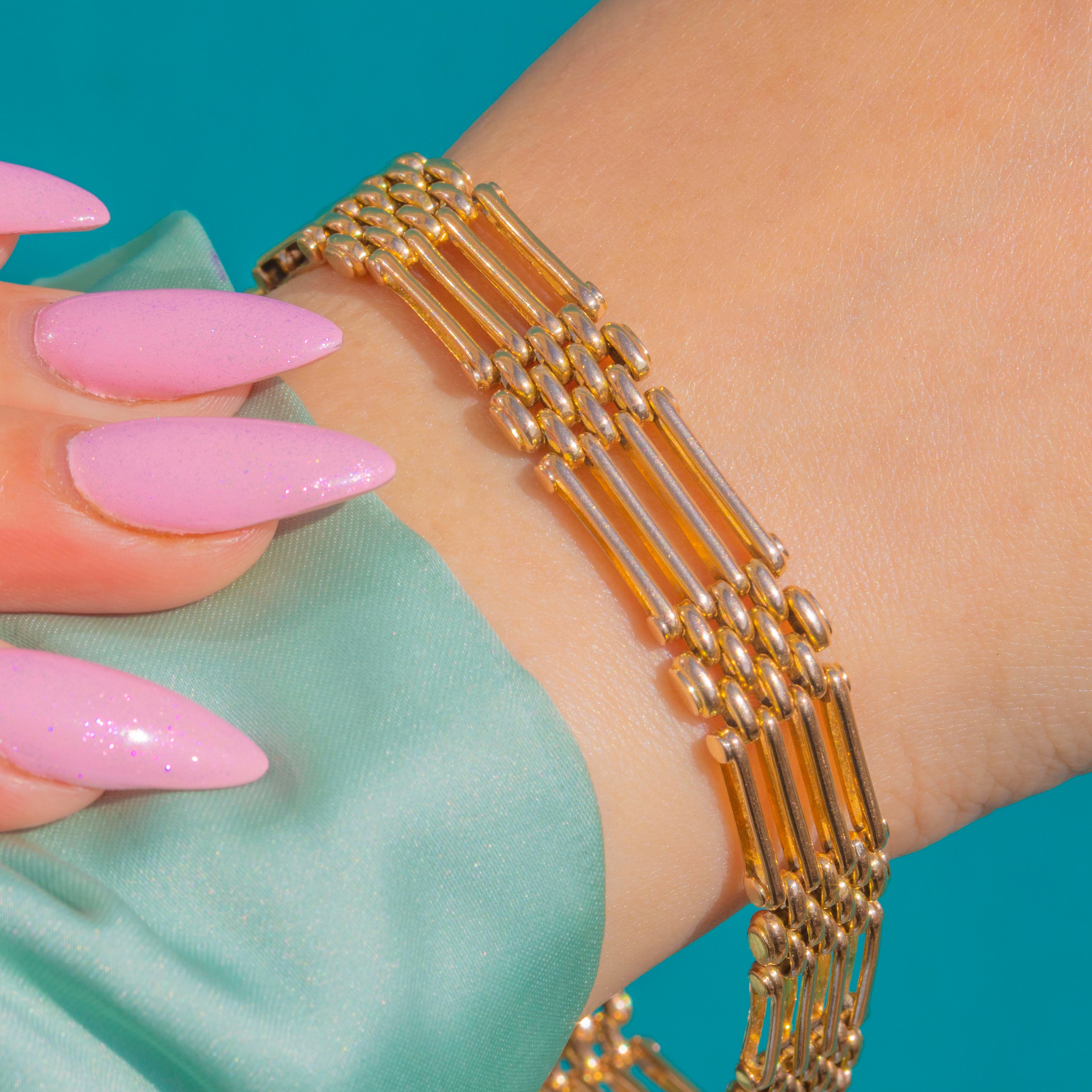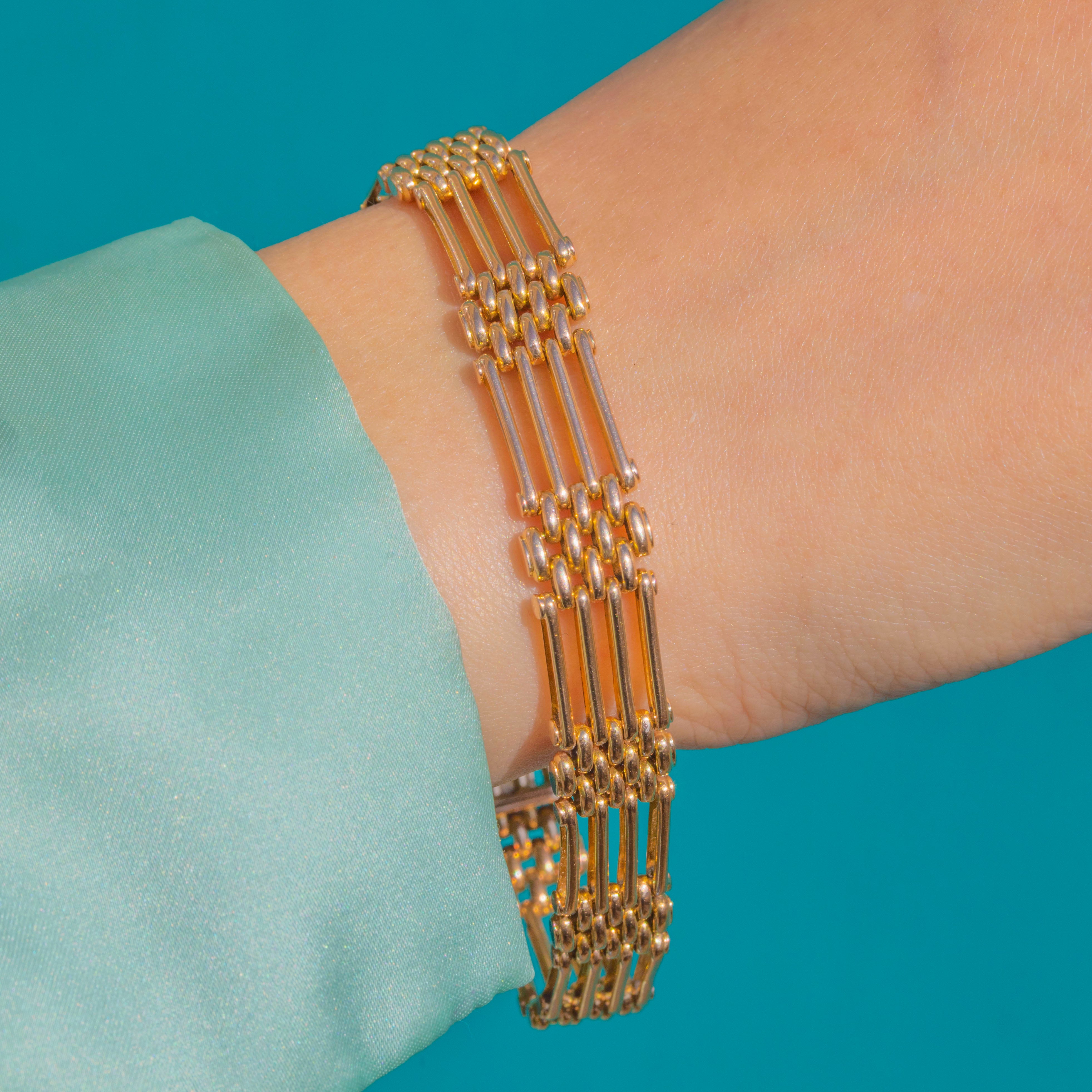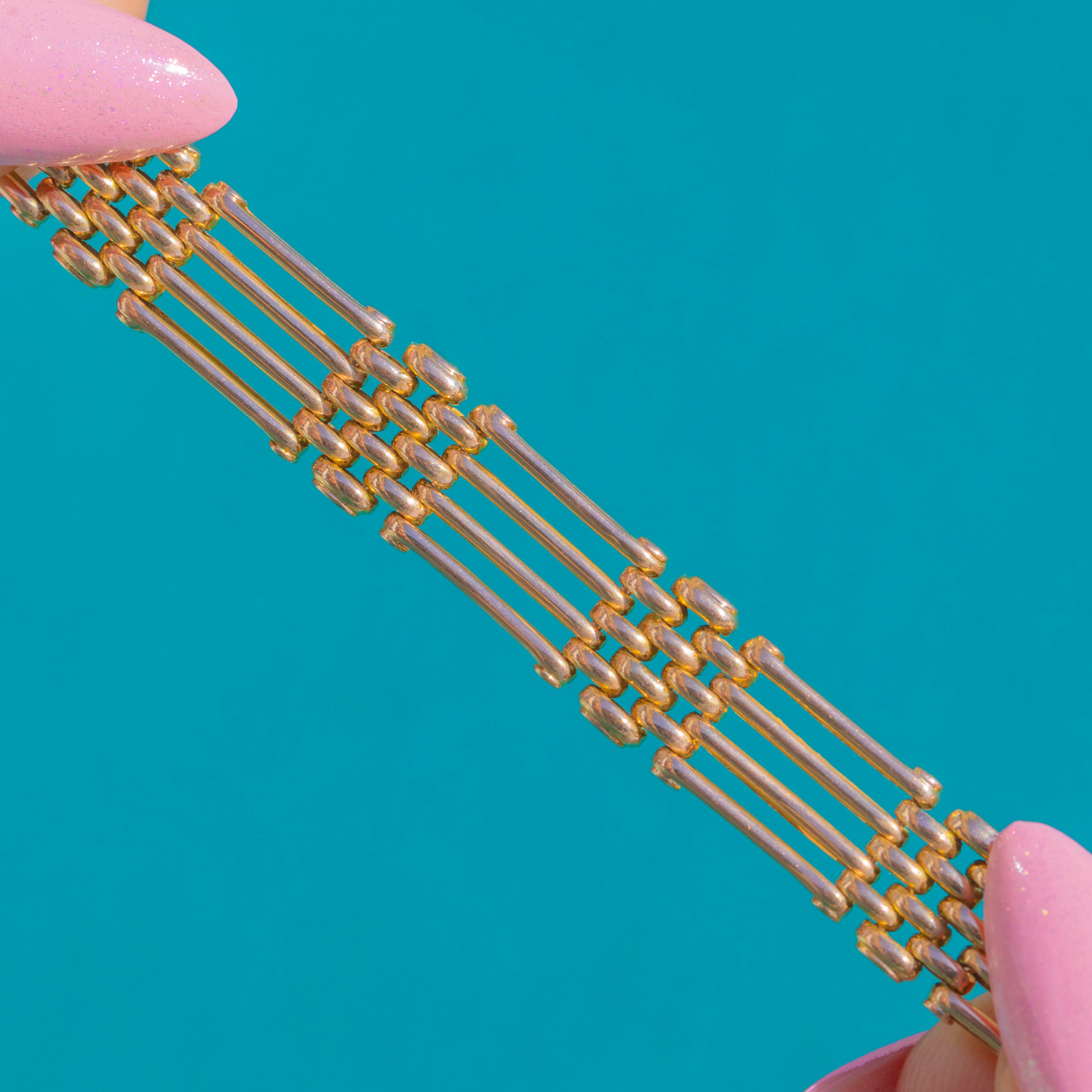 A beautifully crafted Victorian 15ct Gold gate bracelet with an elegant hidden clasp. The articulated rows of polished bars flow fluidly around the wrist, creating that classic “gate” rhythm in a warm, buttery hue unique to antique 15ct Gold. Substantial yet refined, it offers smooth suppleness and a sleek, architectural silhouette.