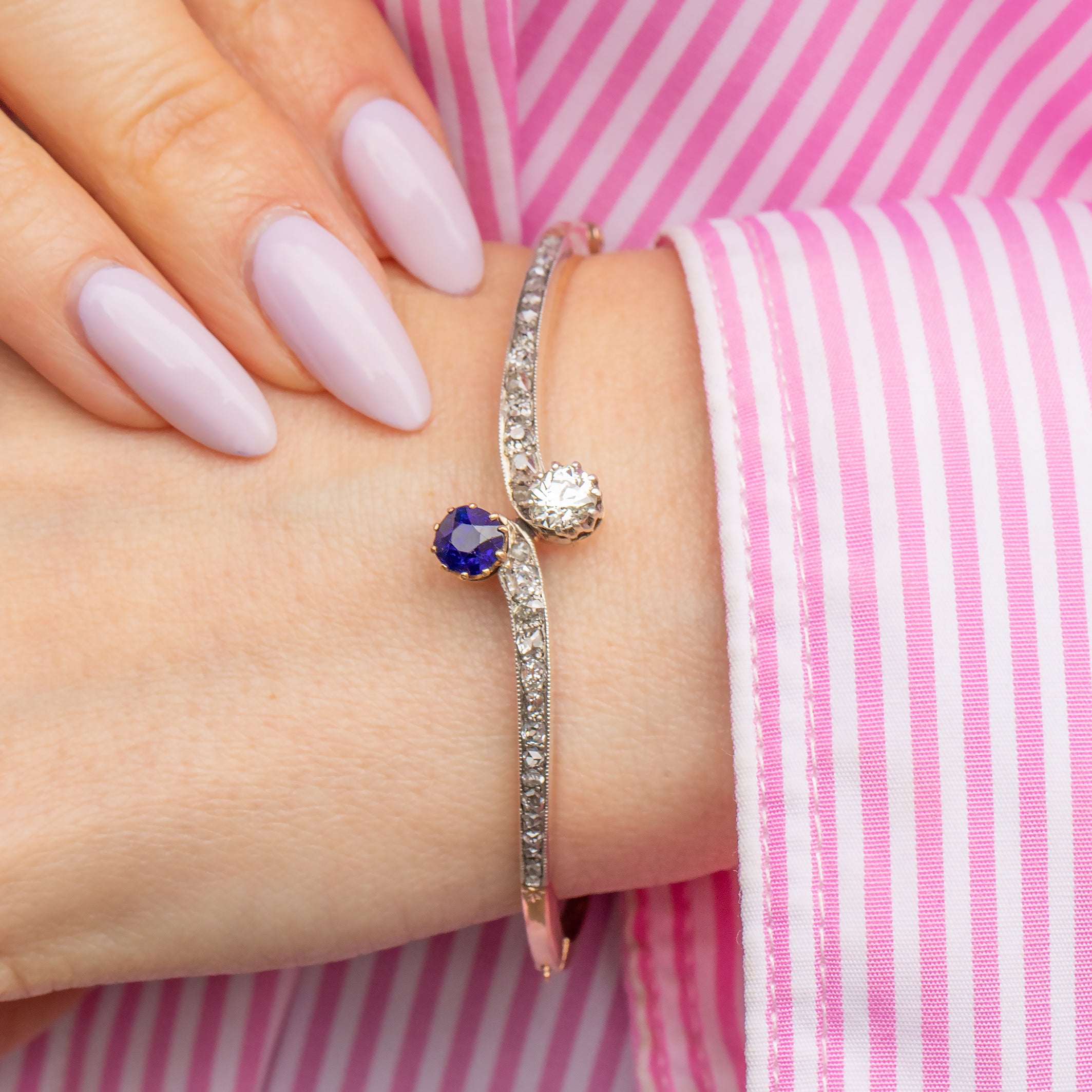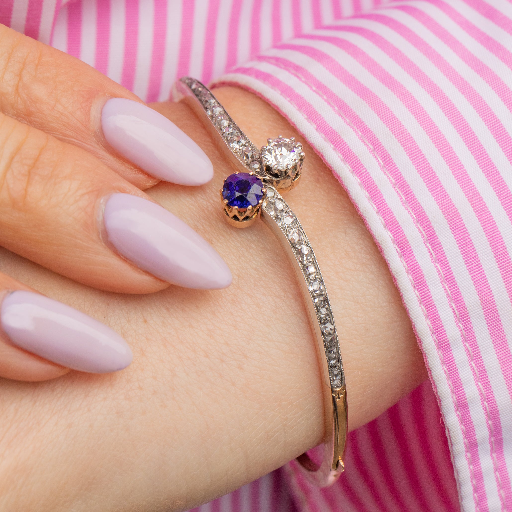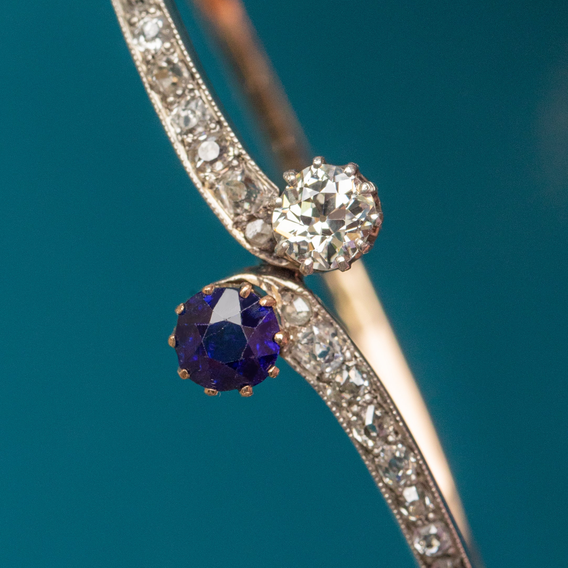 EXCELLENT. This antique 15ct Gold Kashmir Sapphire and Diamond Toi et Moi bangle is in excellent condition. The Sapphire and Diamonds are secure within their settings, fabulously faceted, and offer ample wrist coverage. The bangle is well formed and the 15ct Gold has a blushed hue throughout. The Sterling Silver is also in great condition and perfectly offsets against the Gold. The clasp is in perfect working order so she can be worn with the utmost confidence!