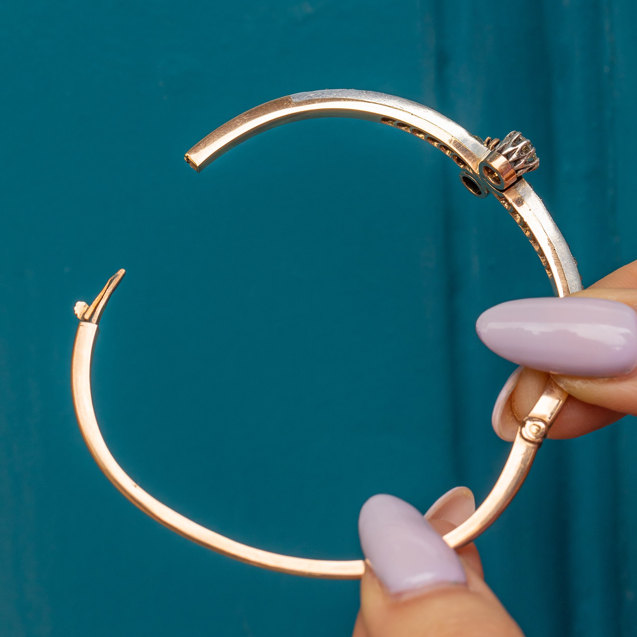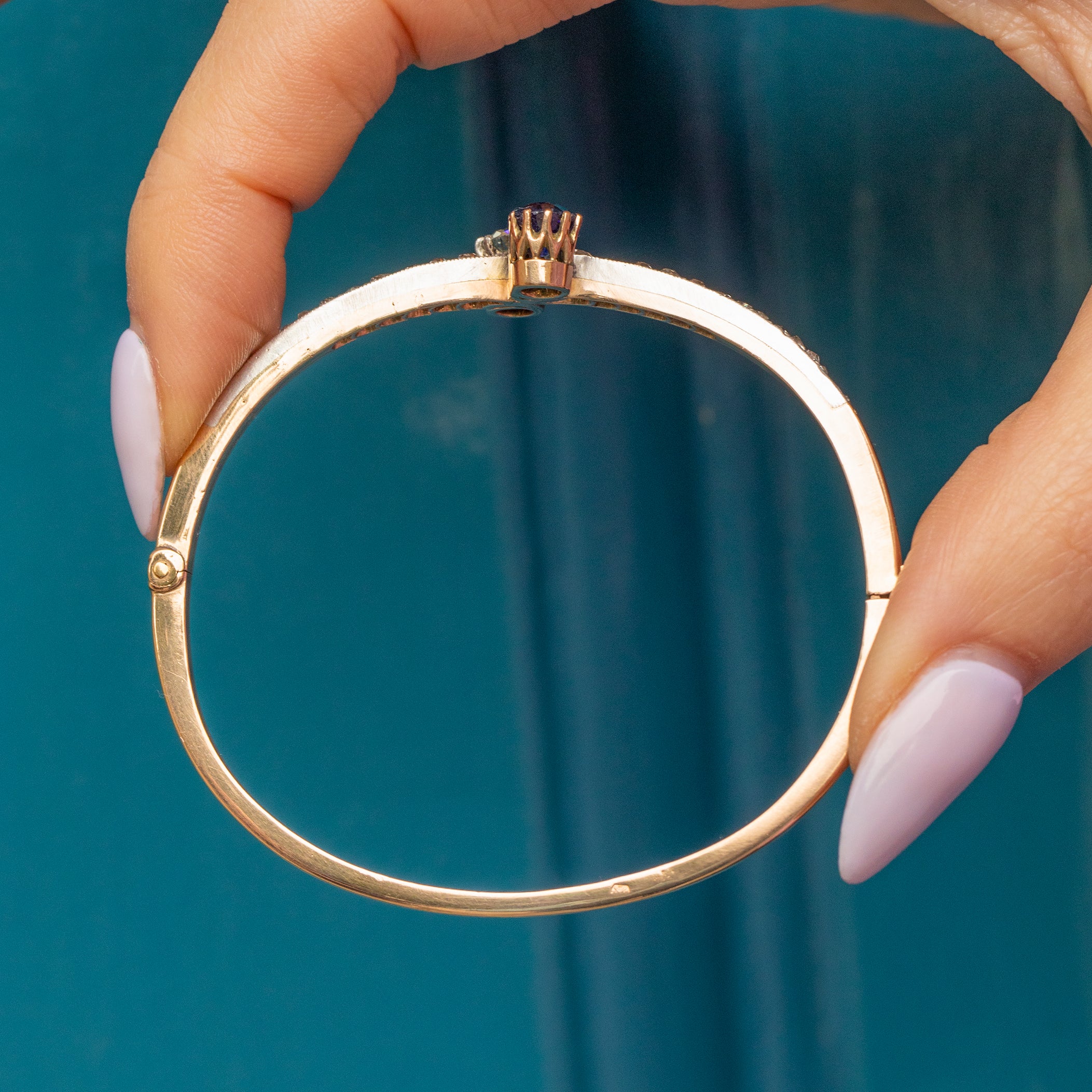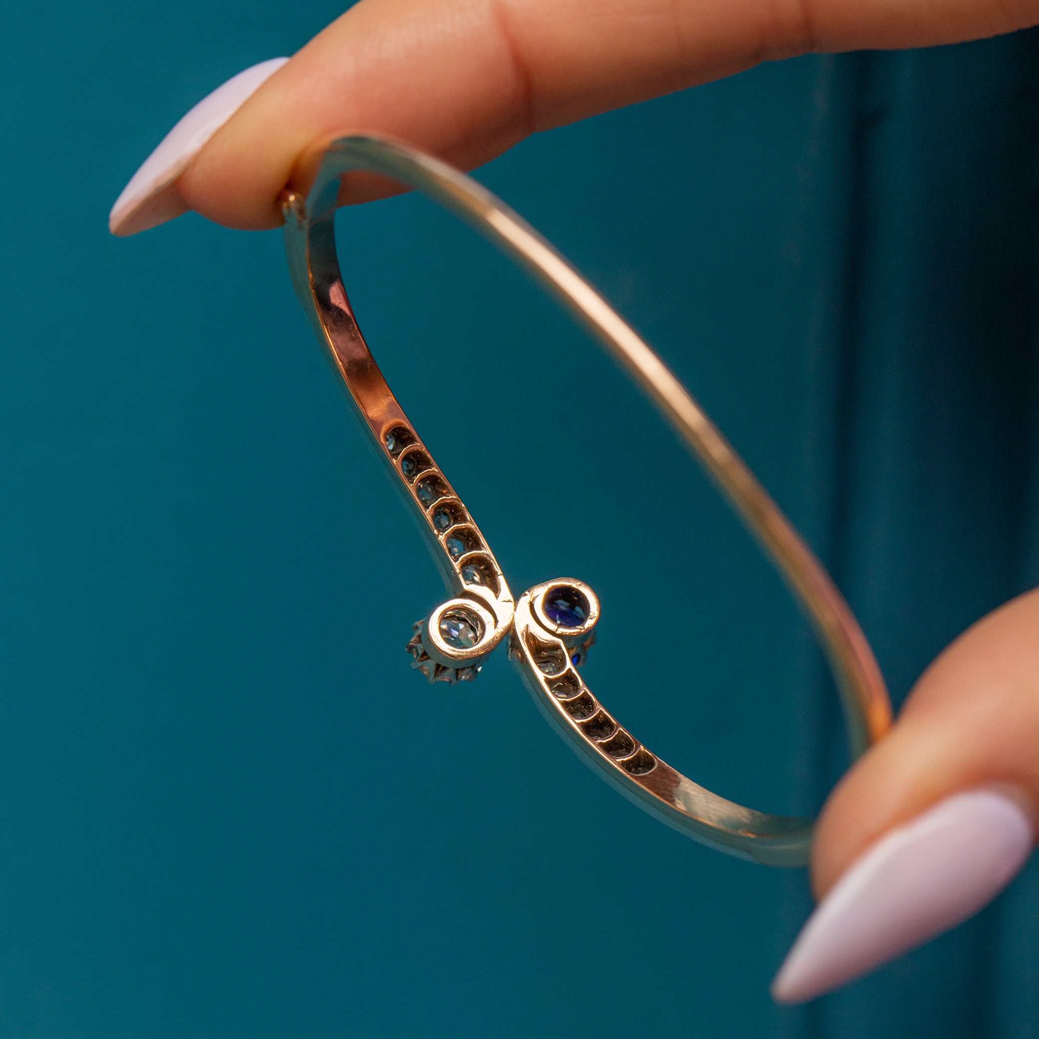 EXCELLENT. This antique 15ct Gold Kashmir Sapphire and Diamond Toi et Moi bangle is in excellent condition. The Sapphire and Diamonds are secure within their settings, fabulously faceted, and offer ample wrist coverage. The bangle is well formed and the 15ct Gold has a blushed hue throughout. The Sterling Silver is also in great condition and perfectly offsets against the Gold. The clasp is in perfect working order so she can be worn with the utmost confidence!