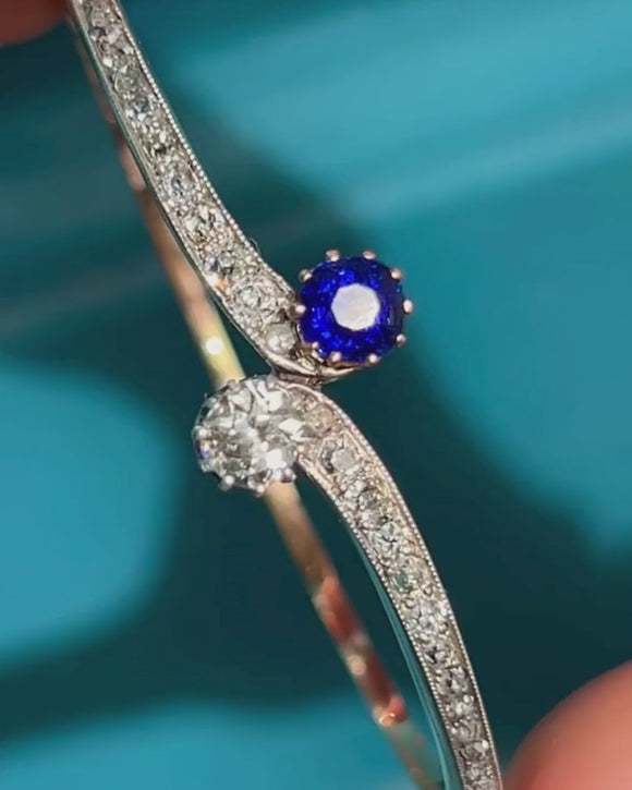 Antique 15ct Gold Kashmir Sapphire & Diamond Toi et Moi Bangle, 1.10ct Diamonds