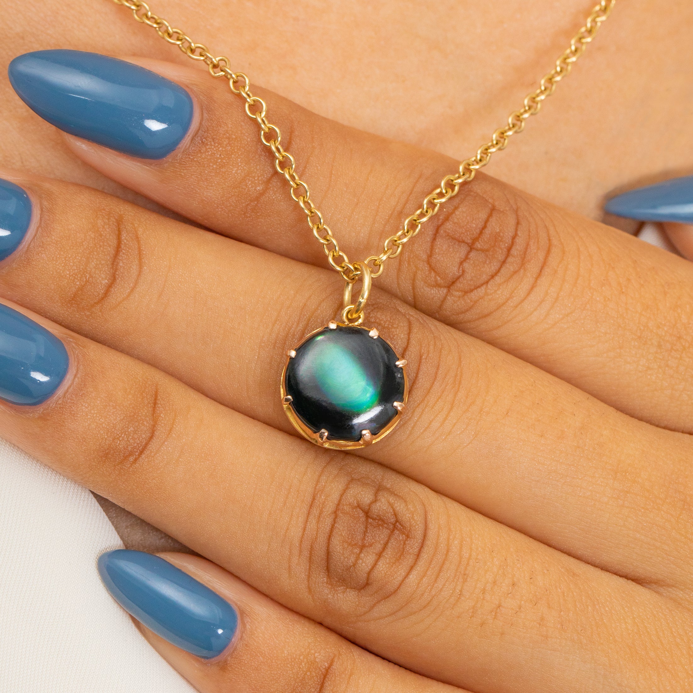 Her crown settings are crafted entirely from honey-hued 15ct Gold, contrasting the Mother of Pearl beautifully. If you are a lover of all things galactic, this Victorian Pearl pendant was made for you!