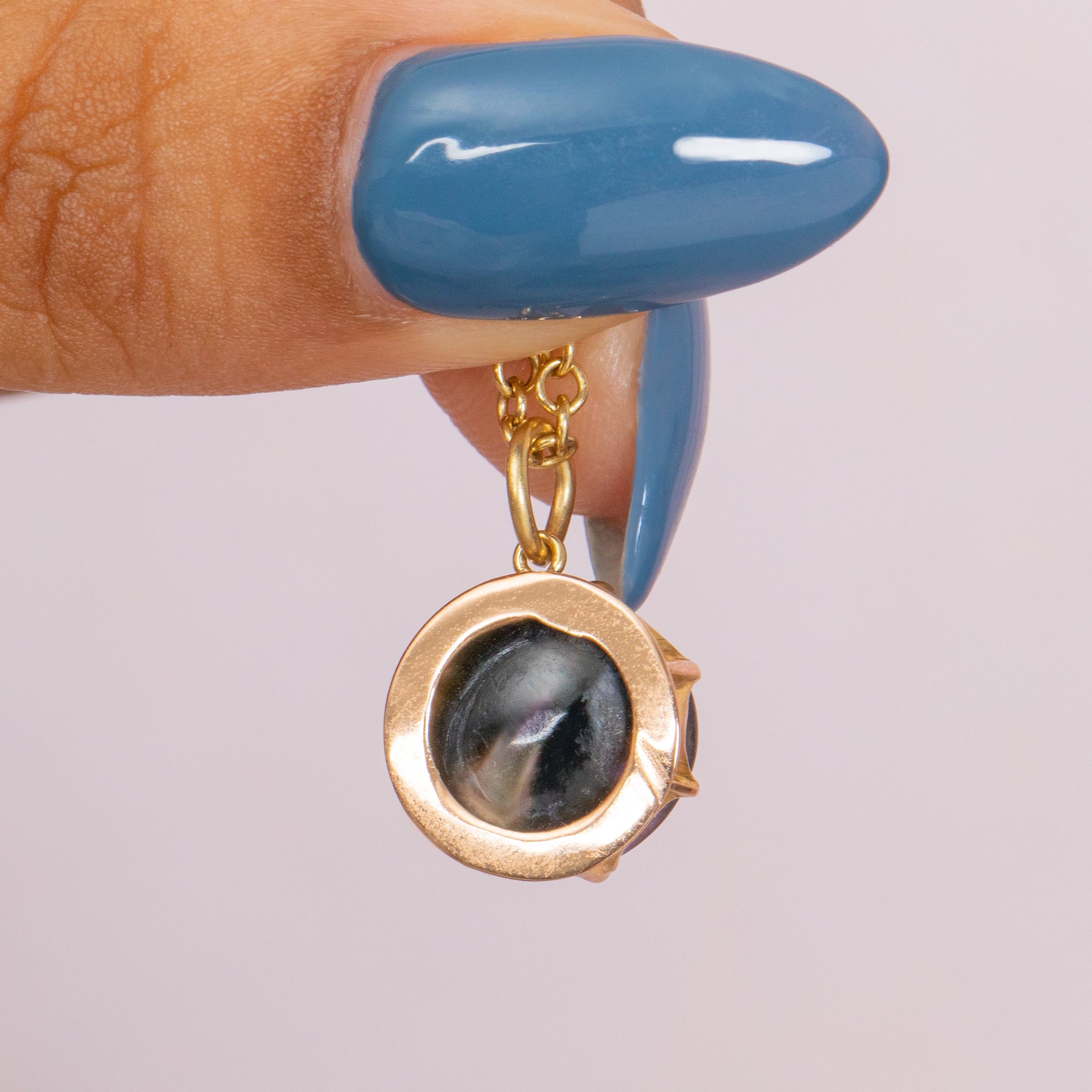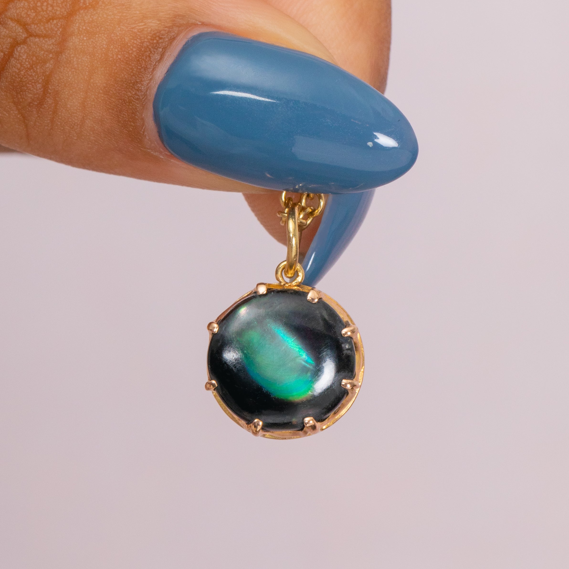 MATERIALS: Tests as 15ct Gold settings, 18ct Gold jump-ring, Mother of Pearl (Dyed).