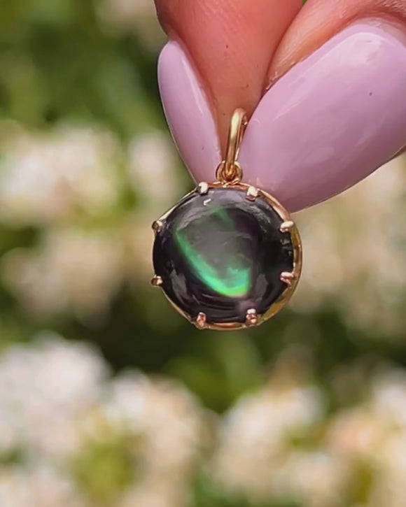 Become lost in the otherworldliness of this antique 15ct Gold Mother of Pearl charm! Akin to an aurora borealis (or Northern Lights), her jet-black core illuminates a pearlescent sheen that shimmers with ethereal tones.
