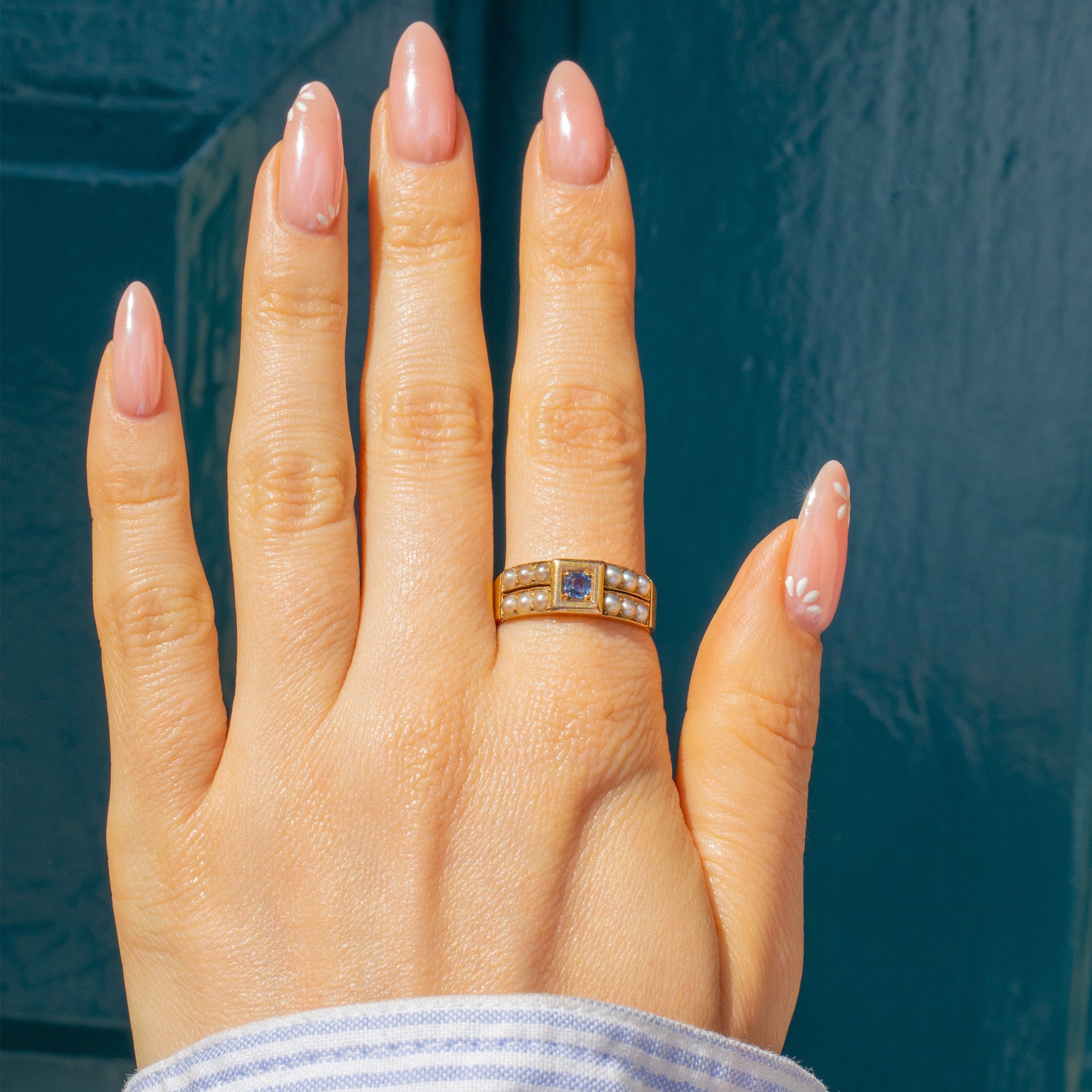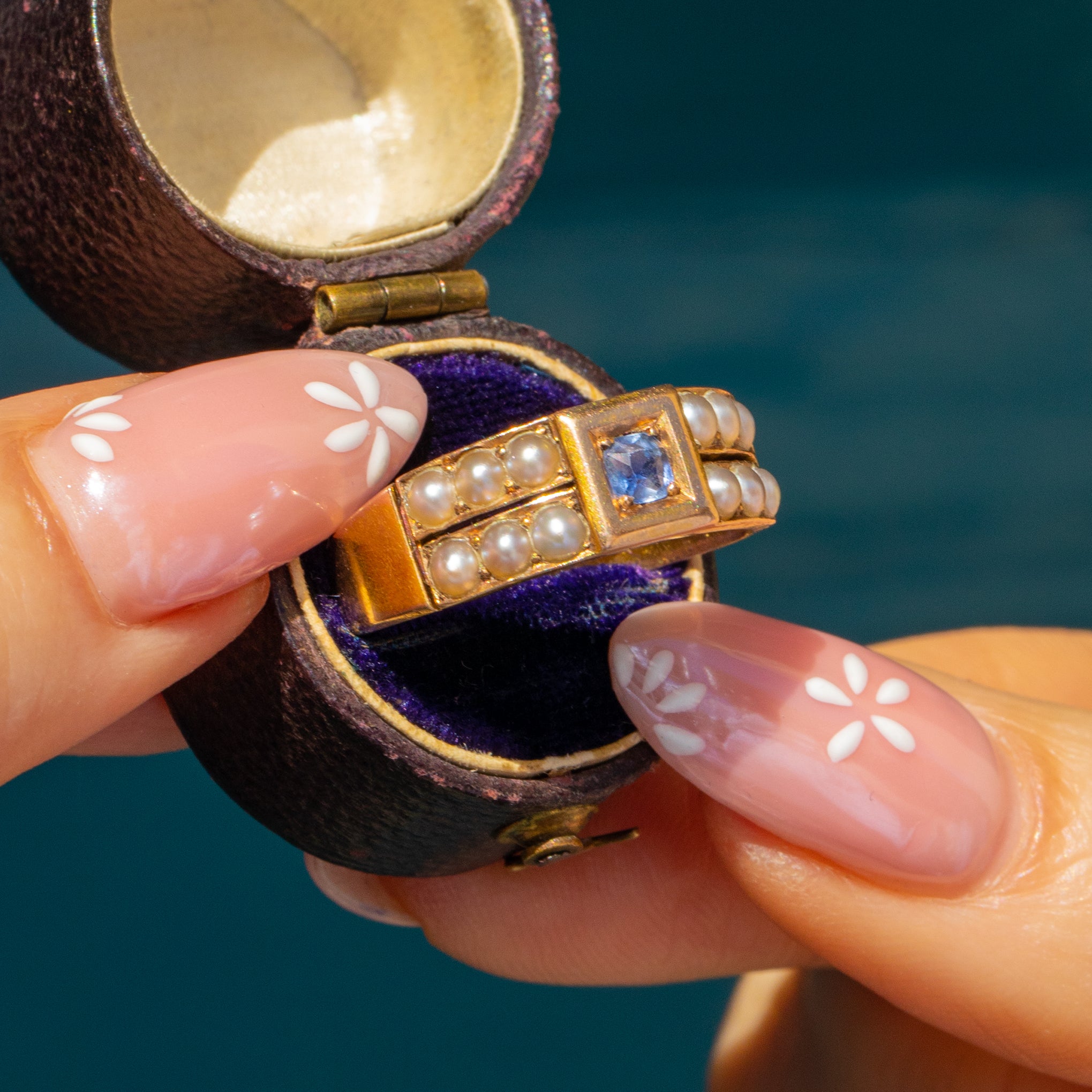 Bursting with Victorian beauty, this antique 15ct Gold natural Sapphire Pearl ring is a must-have for your collection! The 15ct Gold ring band is studded with a double row of shimmering, smooth Pearls, centred by a 0.20ct cornflower blue Sapphire with a chunky Gold frame.