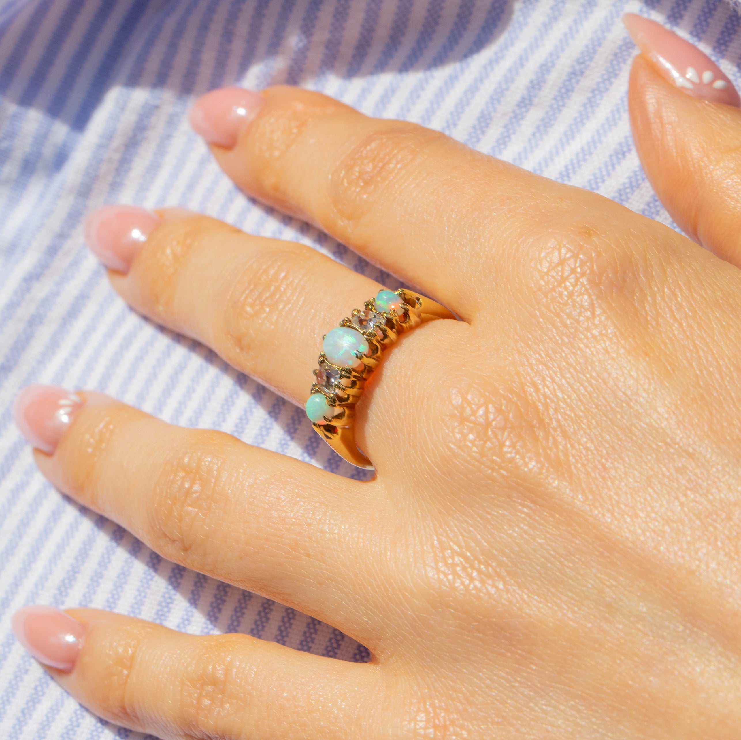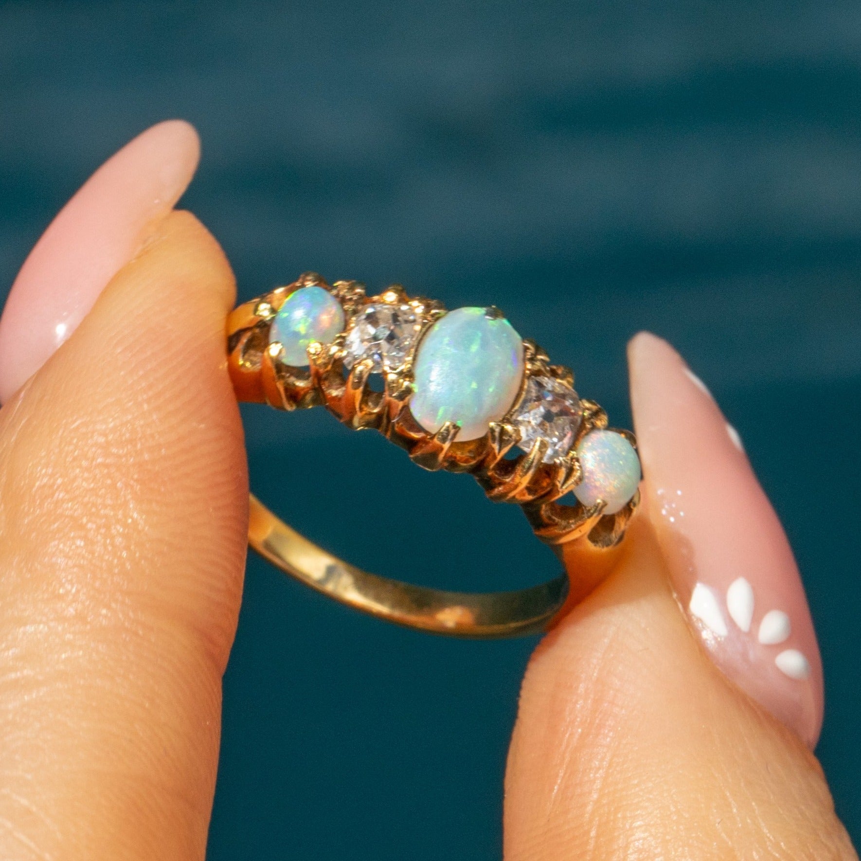 Neon green and electric blue sprinkled with hints of orange and peach sparkle across each smoothly cut Opal cabochon, with two old mine-cut Diamonds adding scintillation and fire; this Victorian boat ring will enchant anyone lucky enough to lay eyes on her!