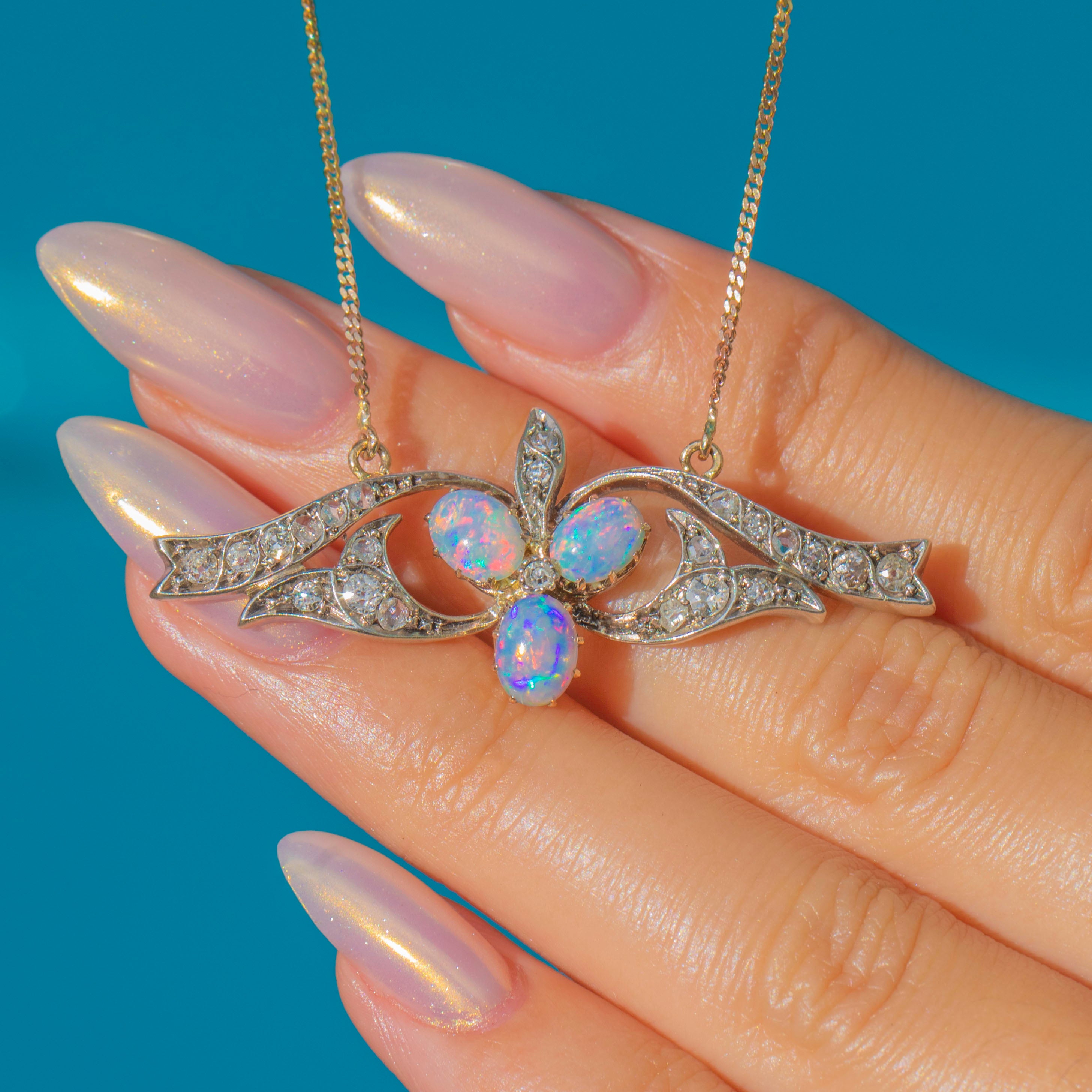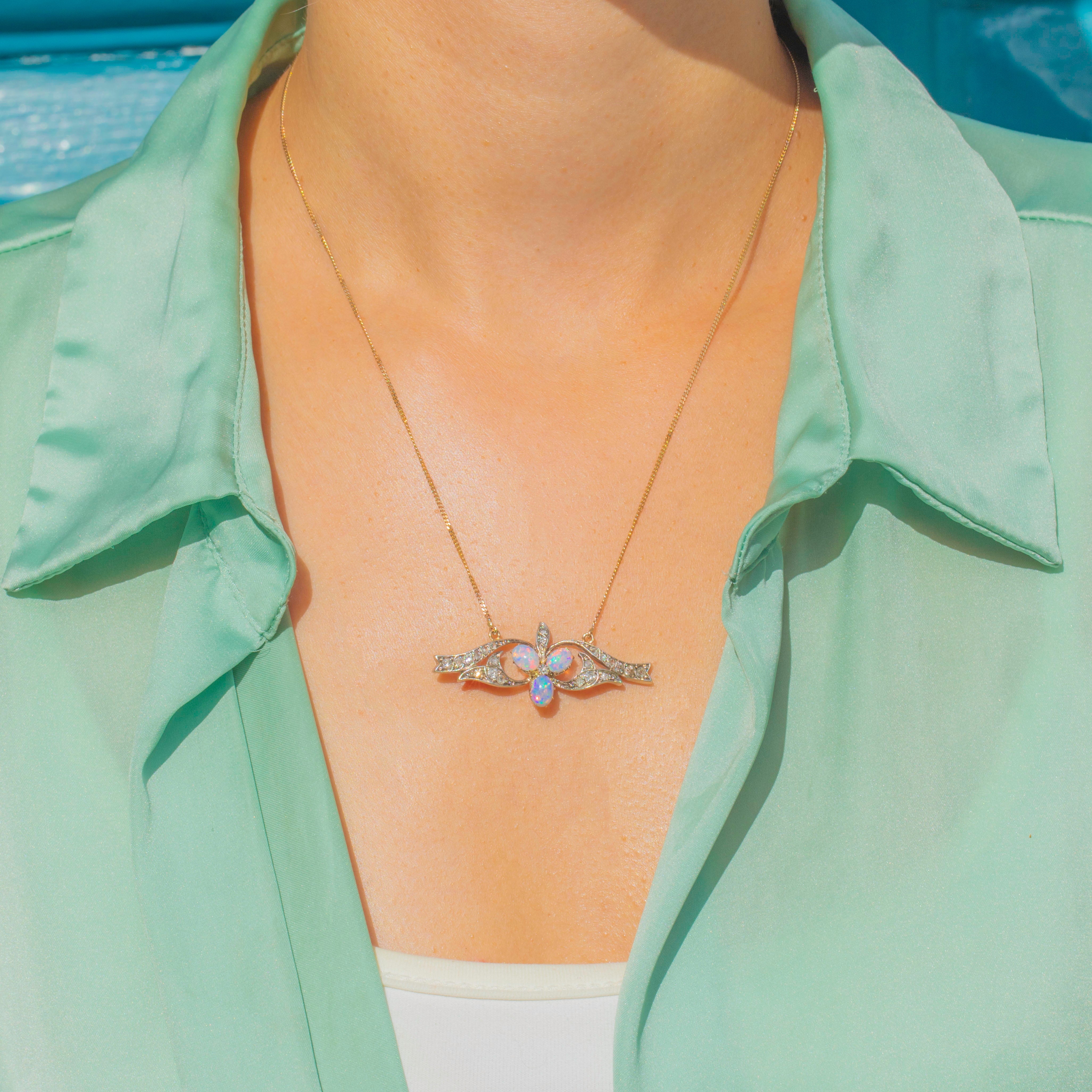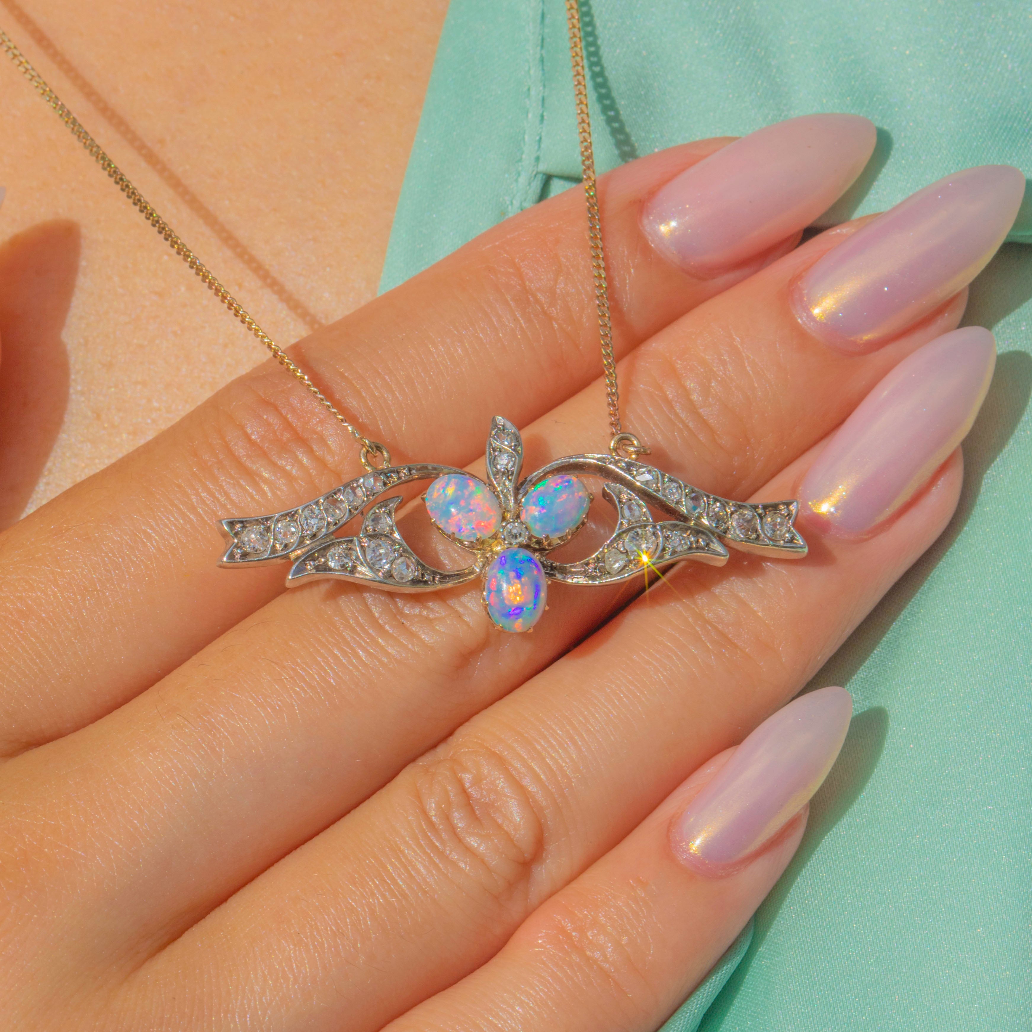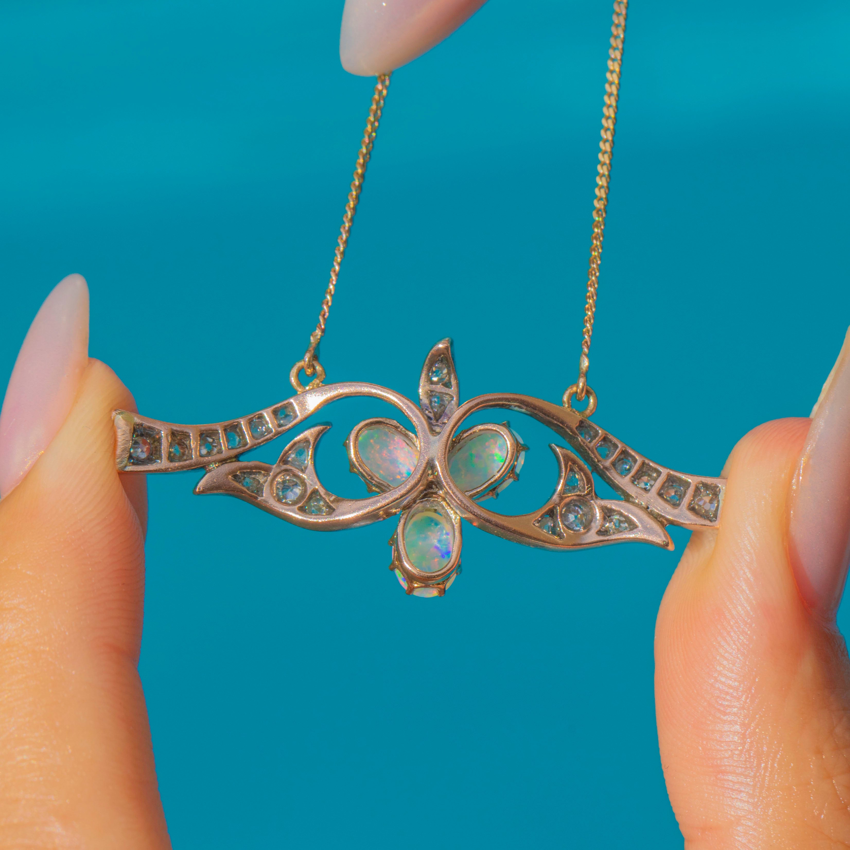 EXCELLENT: This antique 15ct Gold Opal and Diamond shamrock necklace is in excellent condition. Each gemstone sits securely within its setting and is free from any visible signs of wear. Her pendant is securely attached to her chain, and with her bolt ring in perfect working order, you can wear her with confidence.