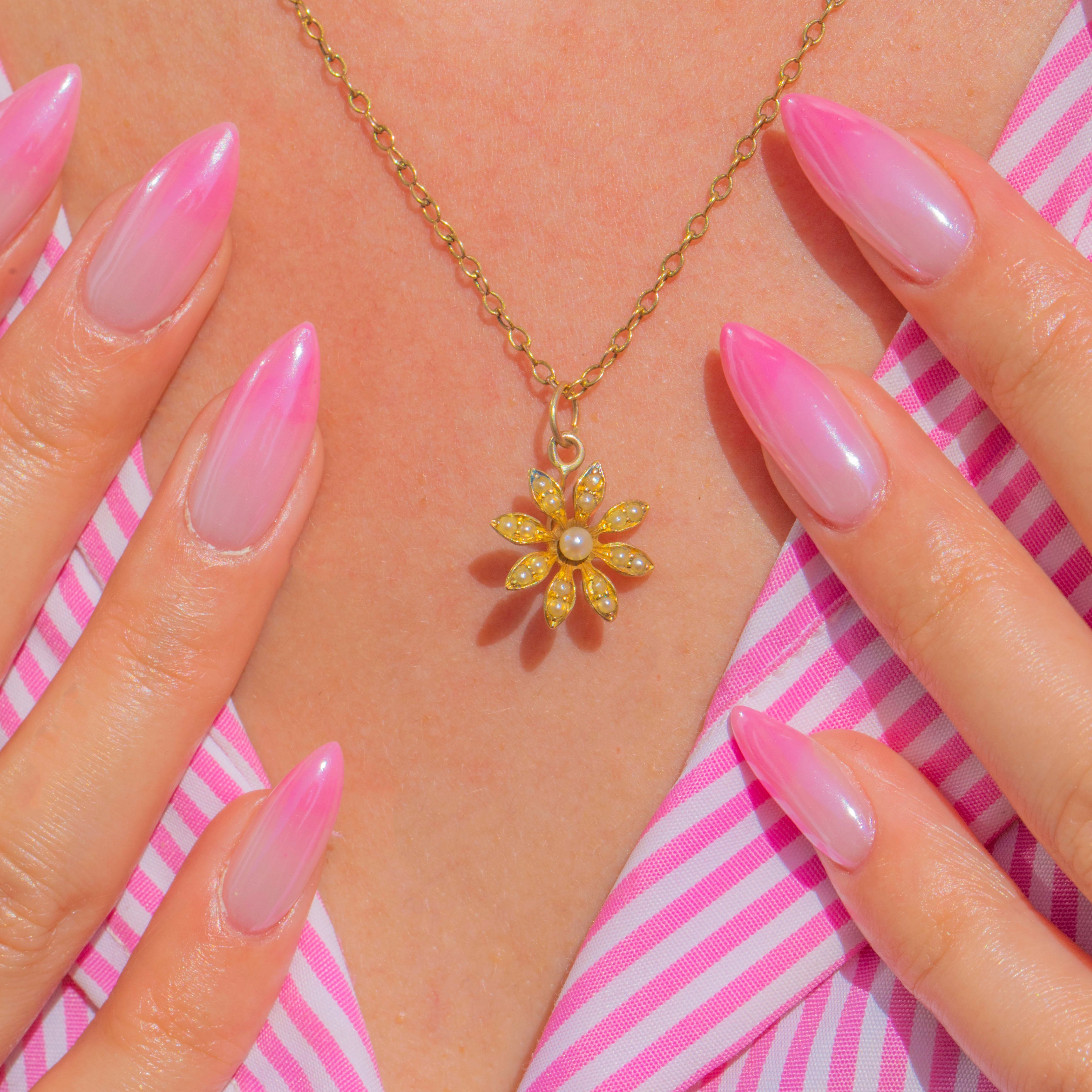 Delicately formed in rich 15ct Gold, this Victorian flower charm blooms with luminous Pearls. A central Pearl rests at the heart of the motif, with fine Seed Pearls accenting each petal to create a timeless, romantic silhouette.