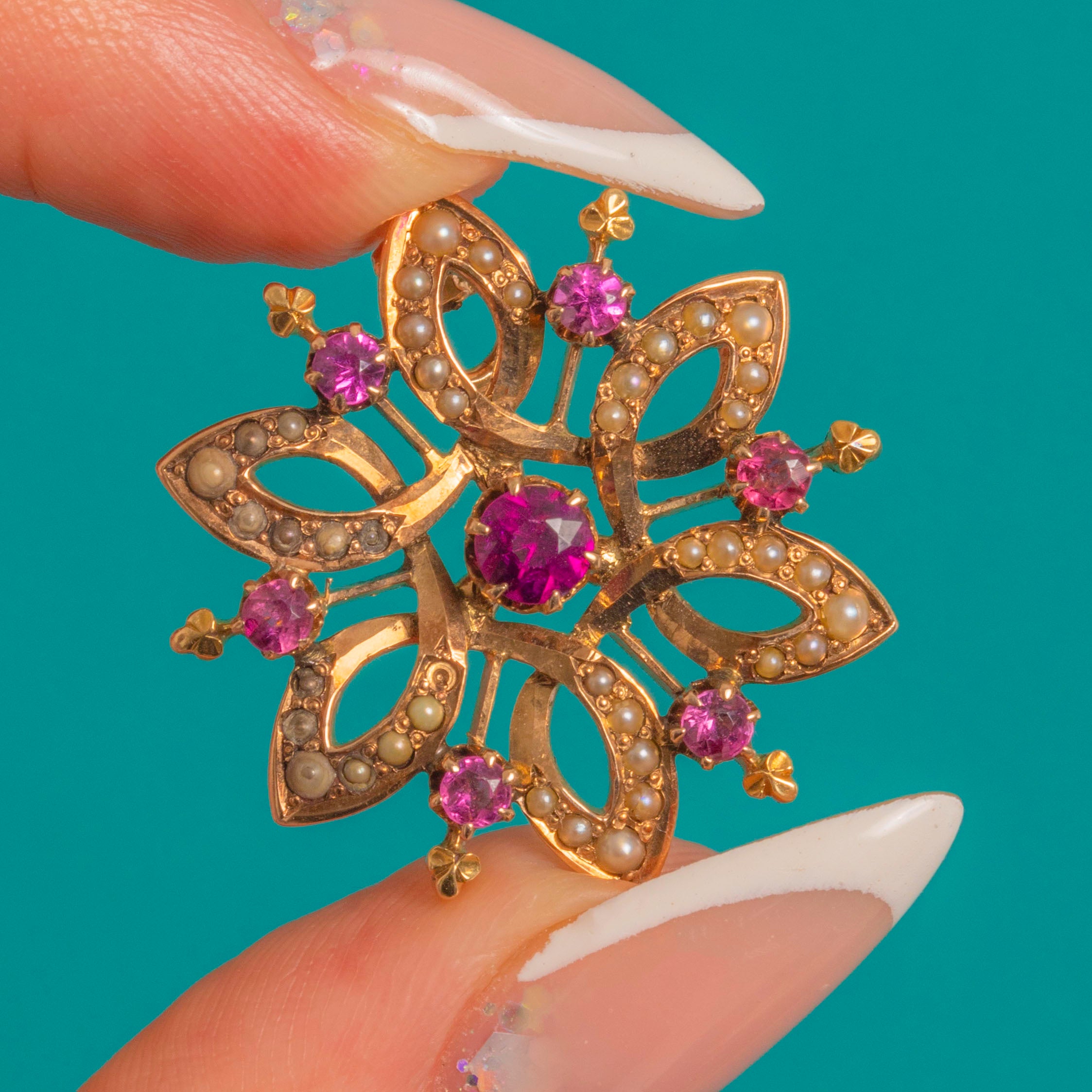 A delicate Edwardian star pendant in warm 15ct Gold, shimmering with creamy seed Pearls and vivid magenta-pink Rhodolite Garnets. The starburst design is bead-set with Pearls around a vibrant central Garnet, while smaller Garnets punctuate the perimeter for a romantic burst of colour.